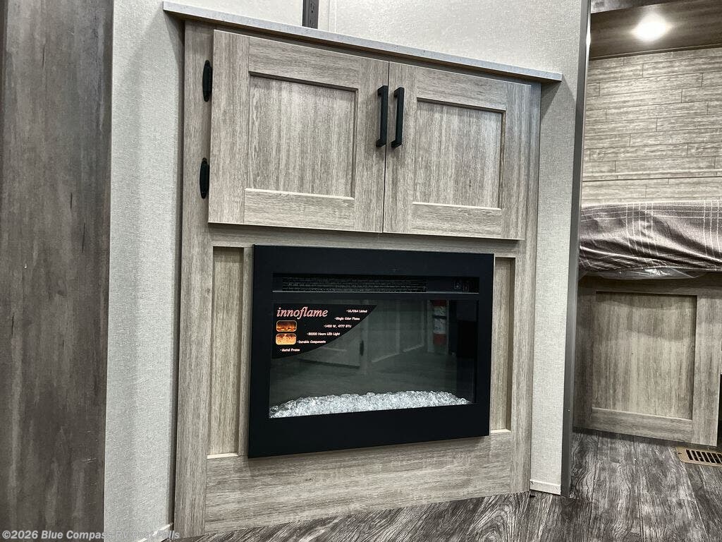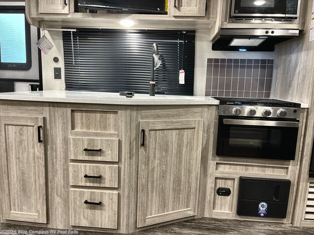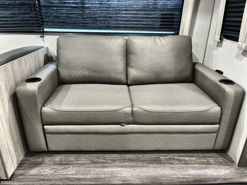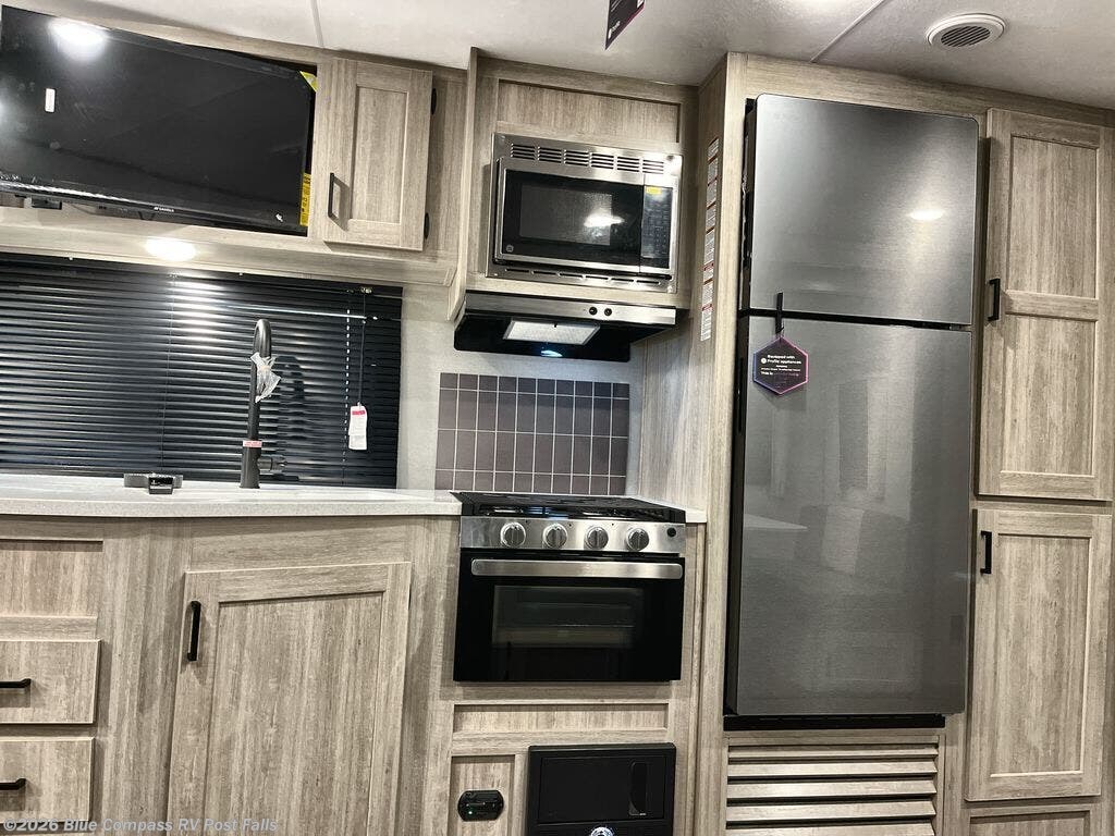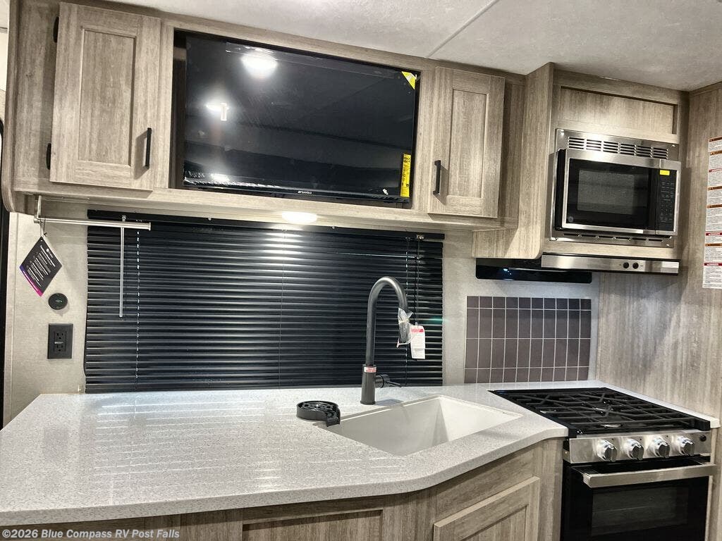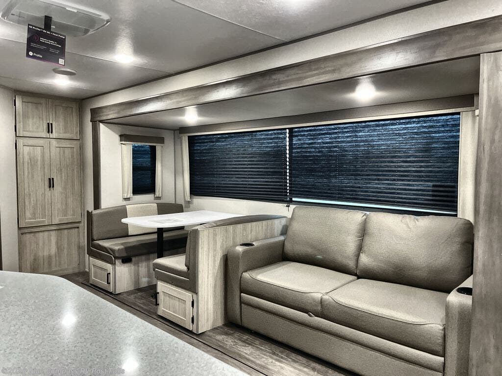 When you are ready to camp with your favorite person, this trailer offers the perfect couple's trailer with space for an overnight guest on the booth dinette. You will have a front bedroom with a walk-around queen bed, dual wardrobes and overhead cabinets for your belongings. The main living and kitchen area is spacious with a slide out dinette and sofa giving you more floor space, dining and relaxing seating, and extra sleeping space for friends once the furniture is easily setup. There is a wardrobe/pantry with washer/dryer prep next to the rear corner bathroom complete with a radius shower. The galley kitchen includes full amenities, plus there is an outside kitchen with a griddle and mini refrigerator. Everyone will enjoy the entertainment center when inside, and the 21' awning offers a covered outdoor living area, just grab your chairs from the pass-through compartment.