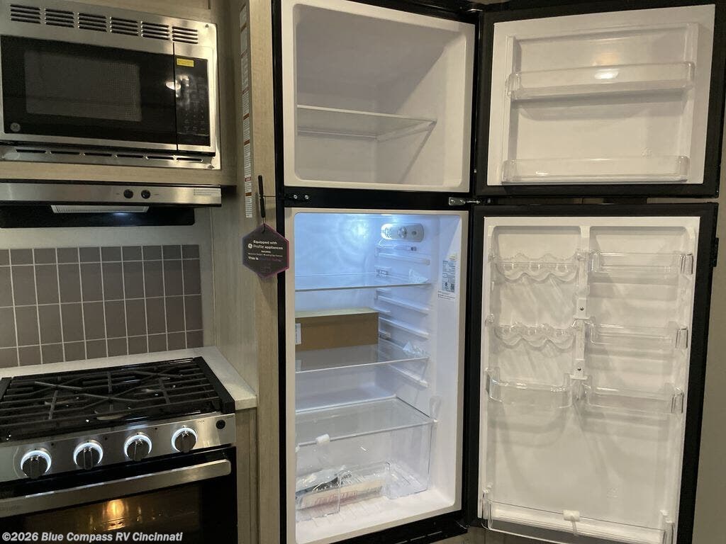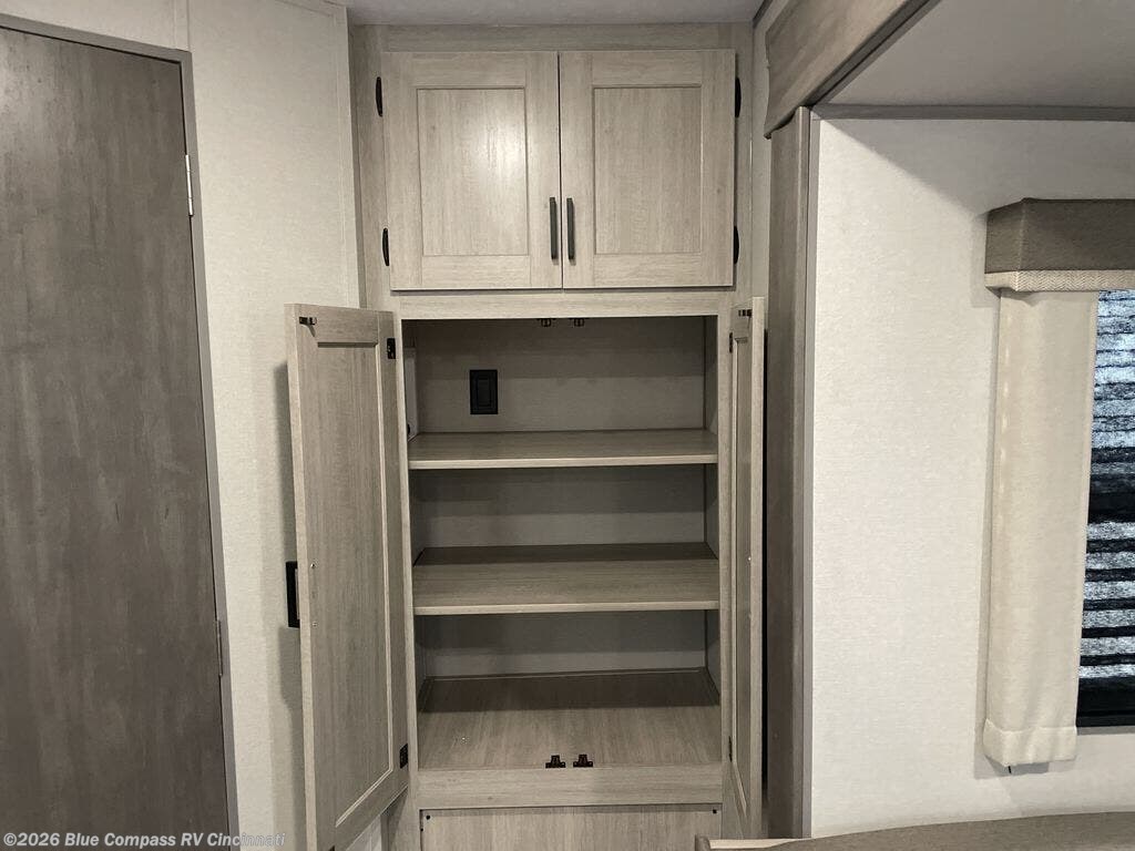 When you are ready to camp with your favorite person, this trailer offers the perfect couple's trailer with space for an overnight guest on the booth dinette. You will have a front bedroom with a walk-around queen bed, dual wardrobes and overhead cabinets for your belongings. The main living and kitchen area is spacious with a slide out dinette and sofa giving you more floor space, dining and relaxing seating, and extra sleeping space for friends once the furniture is easily setup. There is a wardrobe/pantry with washer/dryer prep next to the rear corner bathroom complete with a radius shower. The galley kitchen includes full amenities, plus there is an outside kitchen with a griddle and mini refrigerator. Everyone will enjoy the entertainment center when inside, and the 21' awning offers a covered outdoor living area, just grab your chairs from the pass-through compartment.