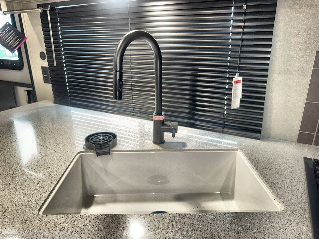 When you are ready to camp with your favorite person, this trailer offers the perfect couple's trailer with space for an overnight guest on the booth dinette. You will have a front bedroom with a walk-around queen bed, dual wardrobes and overhead cabinets for your belongings. The main living and kitchen area is spacious with a slide out dinette and sofa giving you more floor space, dining and relaxing seating, and extra sleeping space for friends once the furniture is easily setup. There is a wardrobe/pantry with washer/dryer prep next to the rear corner bathroom complete with a radius shower. The galley kitchen includes full amenities, plus there is an outside kitchen with a griddle and mini refrigerator. Everyone will enjoy the entertainment center when inside, and the 21' awning offers a covered outdoor living area, just grab your chairs from the pass-through compartment.