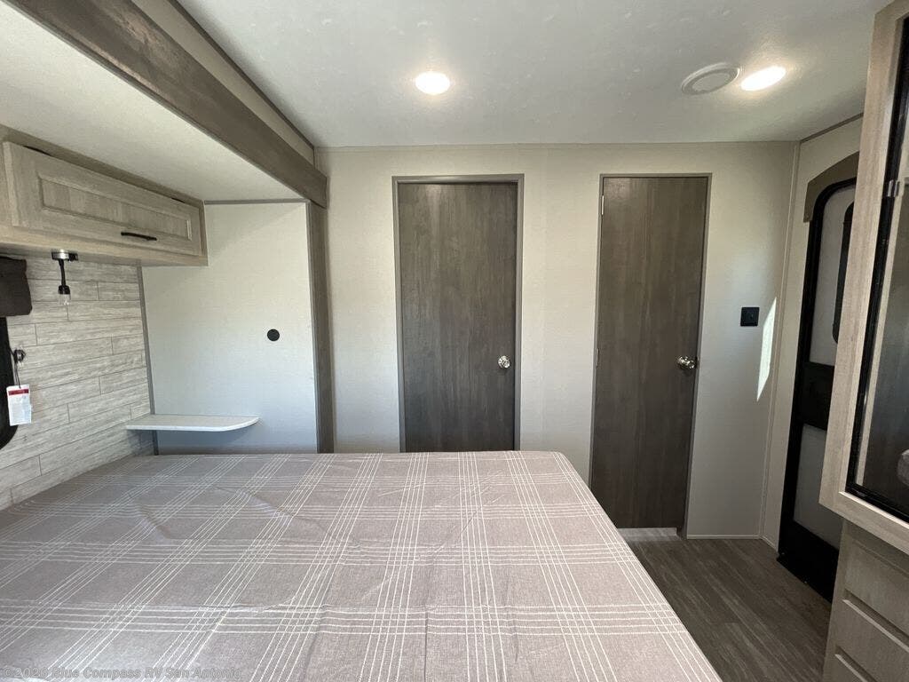 You're going to love every minute spent in this travel trailer with double slide outs and double entry doors. The front kitchen includes ample counter space to prep and cook meals, plus there are two pantries for storage space. Your crew can get comfortable on the 68" sofa or play a game at the 45" booth dinette. There is also an entertainment center with a LED TV for movie night, or you might head outdoors to relax under the 18' awning. The exterior camper kitchen here includes a griddle and a mini refrigerator the chef of your group is sure to love. When it's time to call it a night, head to the rear master bedroom that includes a 60" x 74" queen bed slide out, a large wardrobe, plus your own entrance into the dual entry bath!