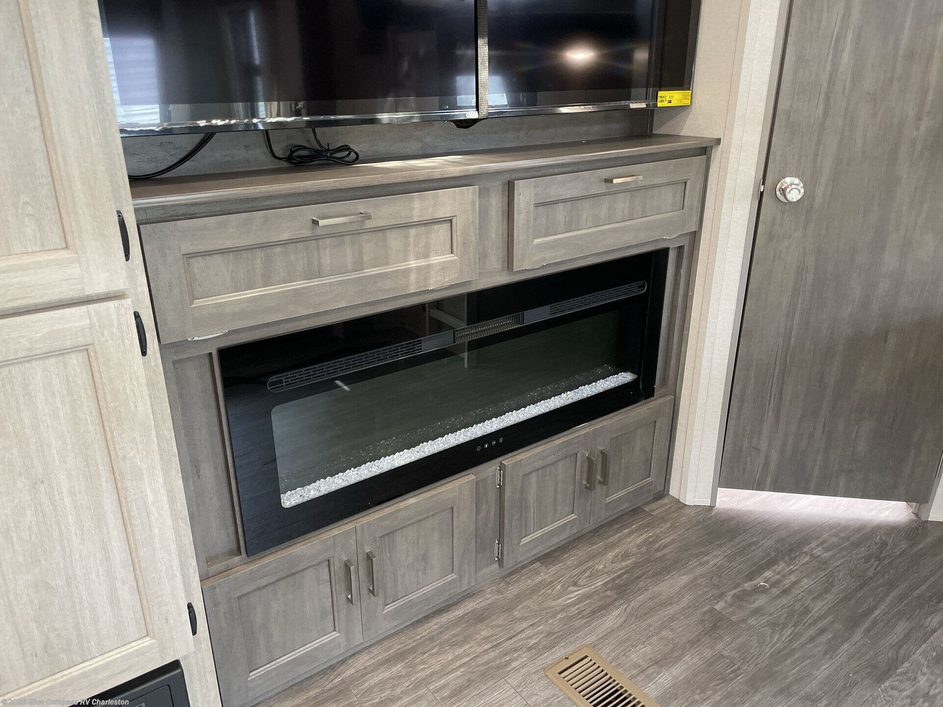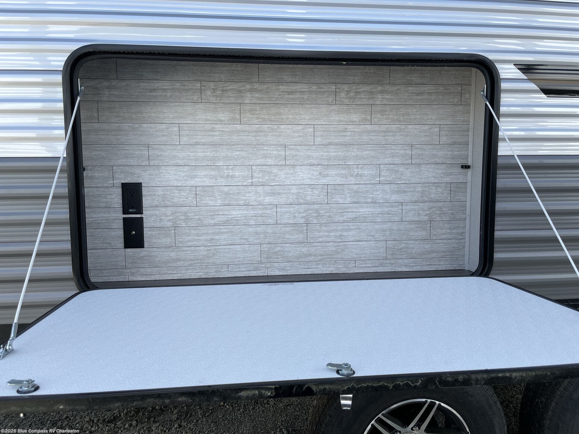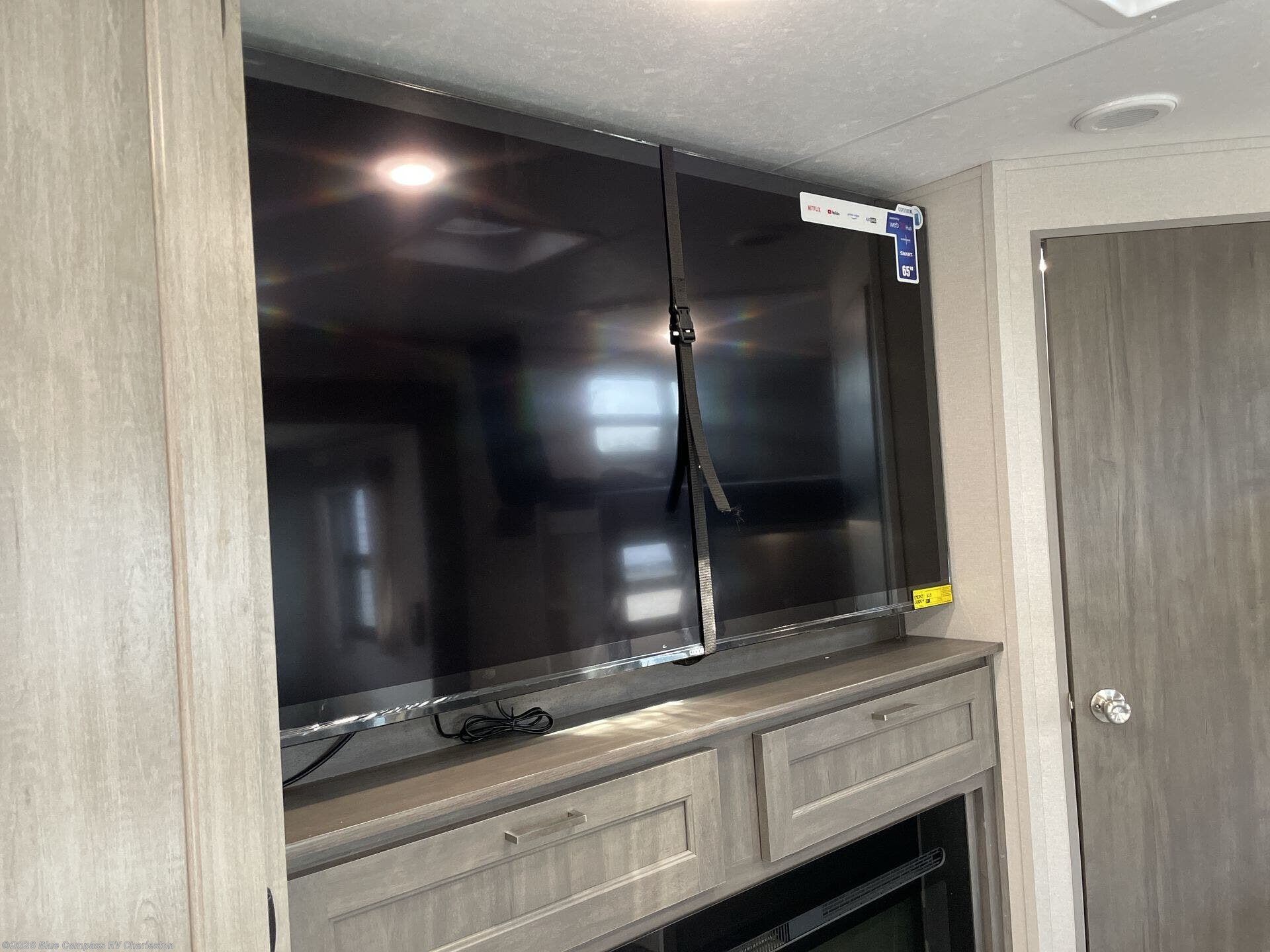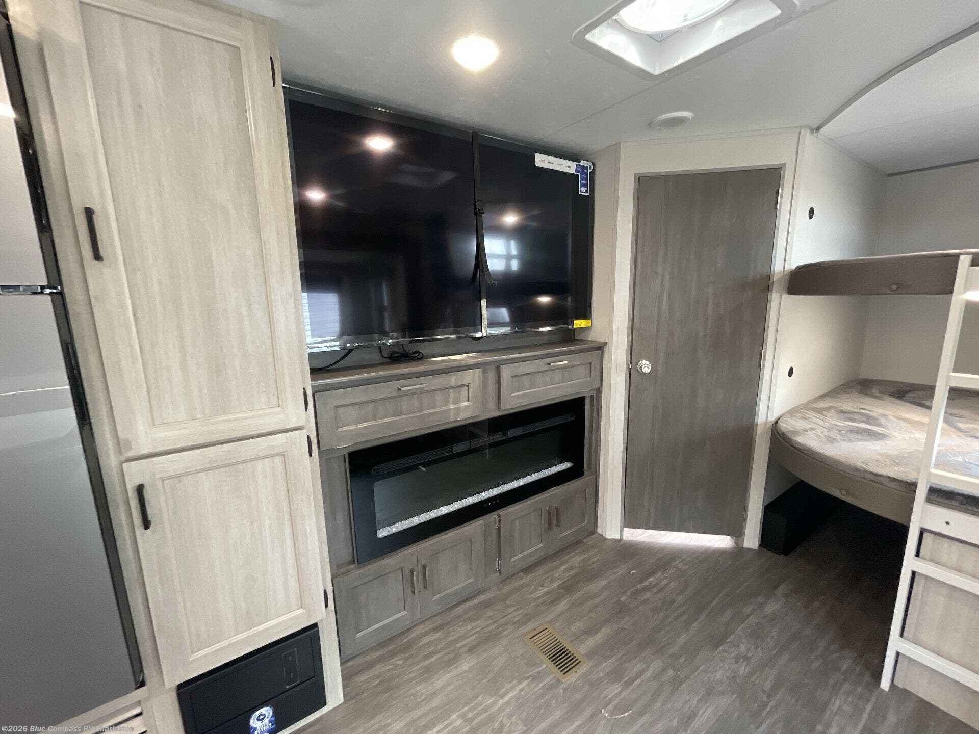 Life is easier in this travel trailer with dual entry doors! One of the entrances is right next to the front private bedroom which has a 60" x 74" queen bed with wardrobes on either side to keep your things tidy. The second entrance leads into the full bath, which also includes a full tub to make bathtime easier for little ones. The living area has everything you need for a cozy evening indoors between the 60" trundle sofa, U-shaped dinette, and entertainment center with a fireplace and 65" TV for cozy movie nights. Cook a sunrise breakfast at the outside camper kitchen with a griddle and mini refrigerator. There is also exterior storage with a fold-down table and a TV hookup if you plan to watch the big game outdoors!