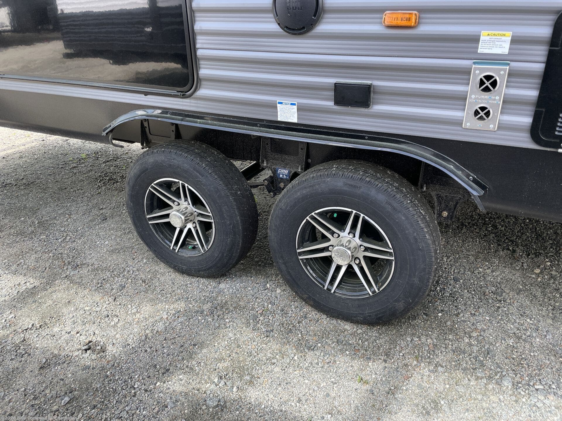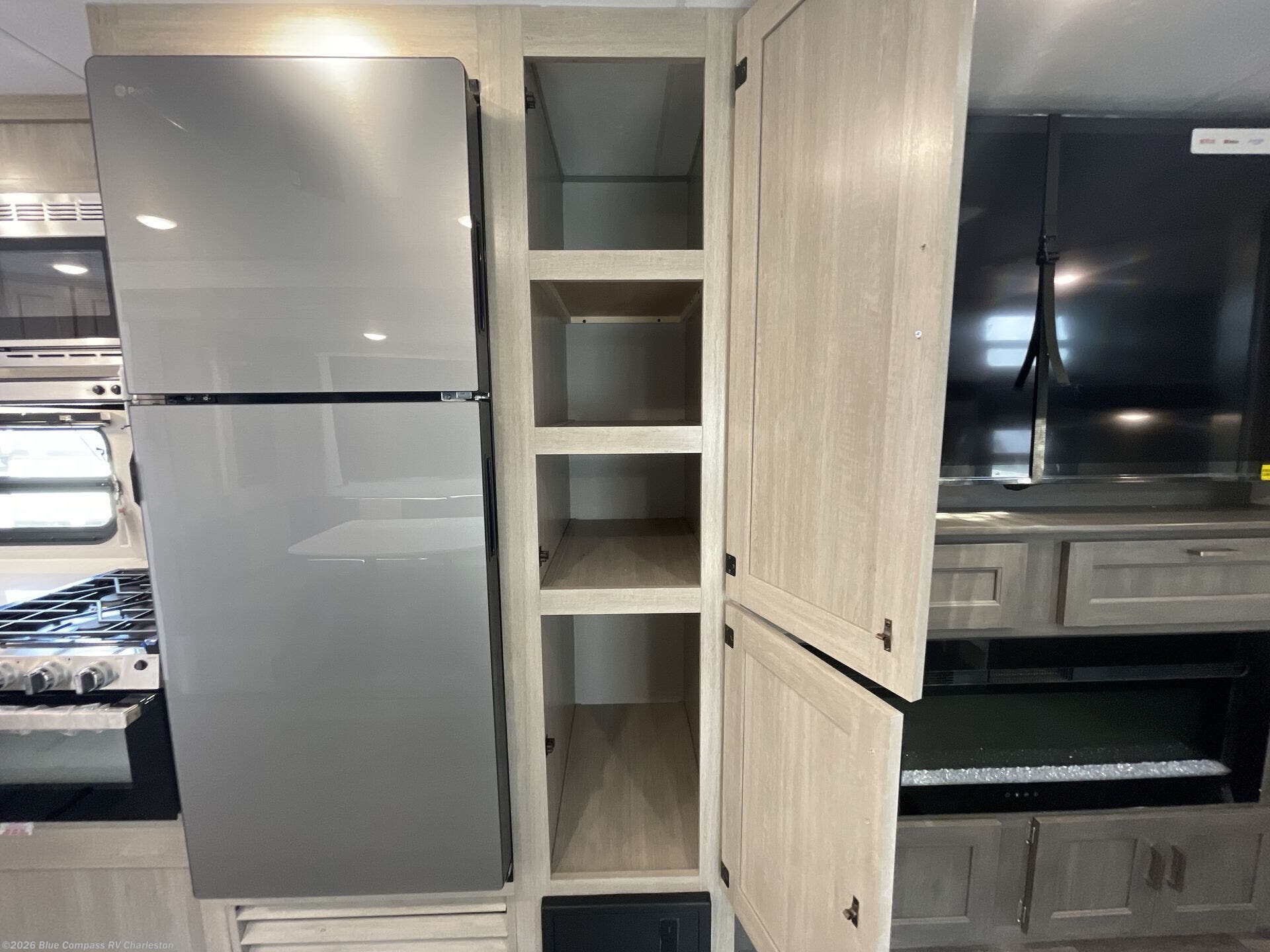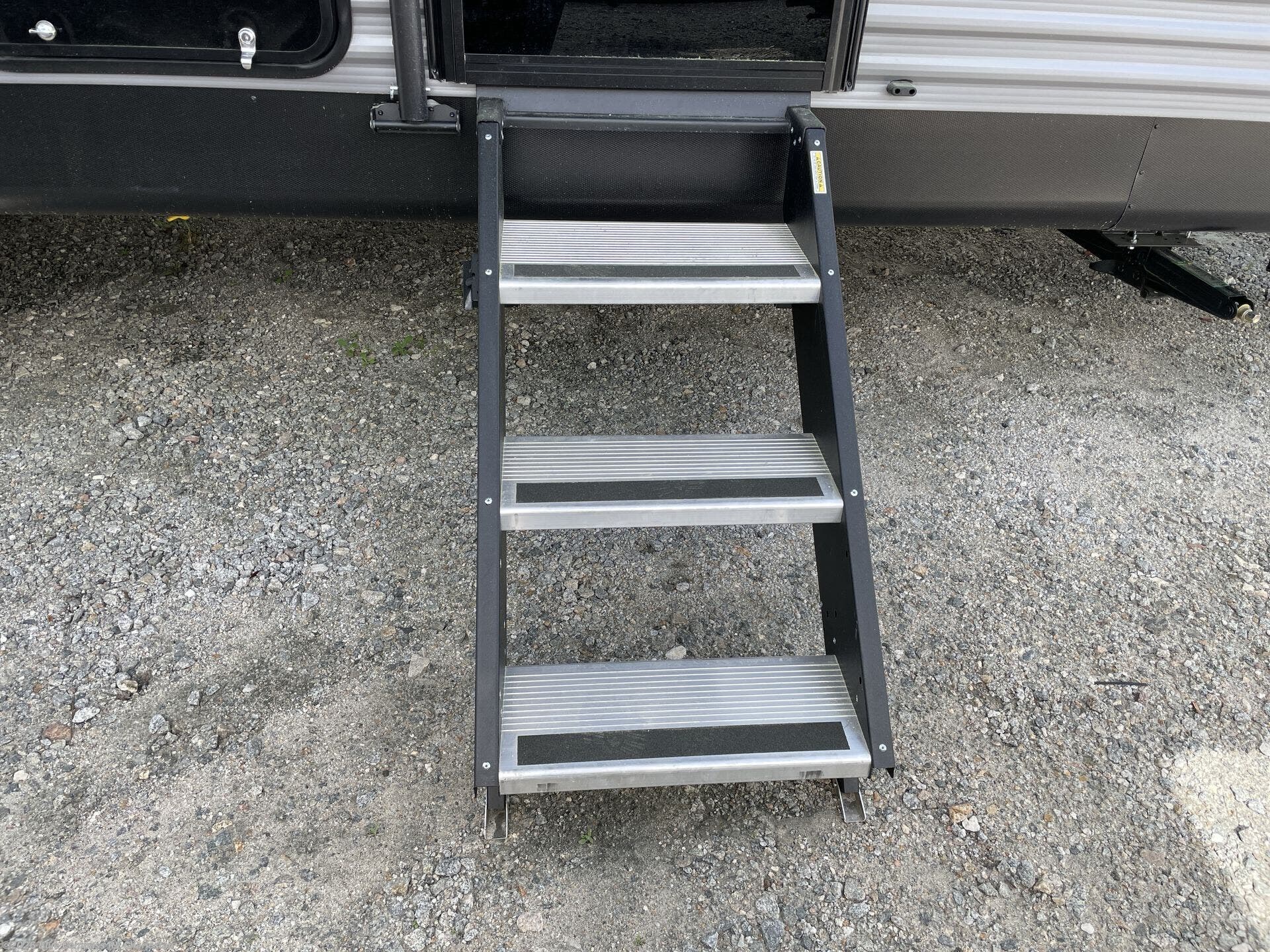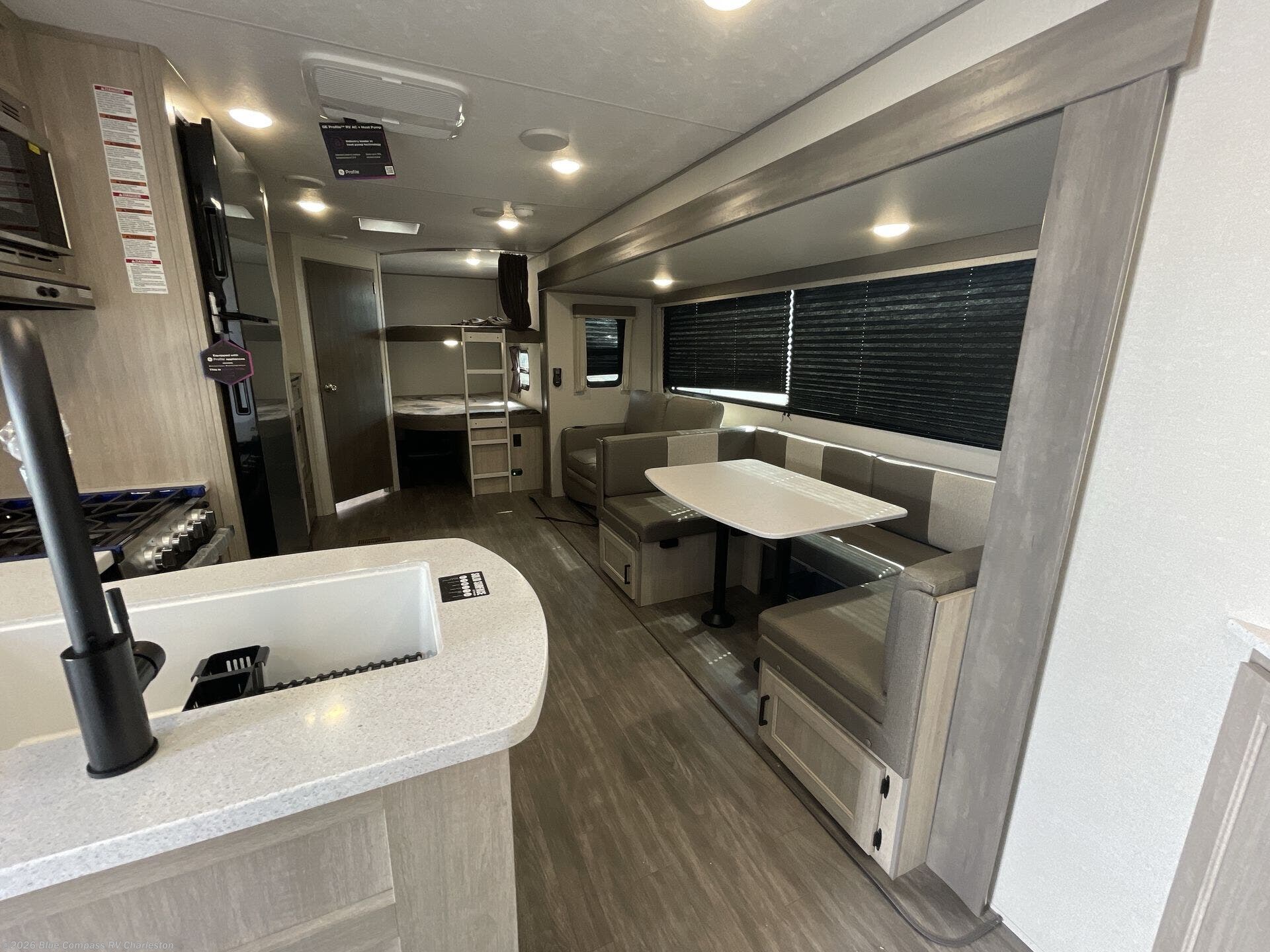 Life is easier in this travel trailer with dual entry doors! One of the entrances is right next to the front private bedroom which has a 60" x 74" queen bed with wardrobes on either side to keep your things tidy. The second entrance leads into the full bath, which also includes a full tub to make bathtime easier for little ones. The living area has everything you need for a cozy evening indoors between the 60" trundle sofa, U-shaped dinette, and entertainment center with a fireplace and 65" TV for cozy movie nights. Cook a sunrise breakfast at the outside camper kitchen with a griddle and mini refrigerator. There is also exterior storage with a fold-down table and a TV hookup if you plan to watch the big game outdoors!