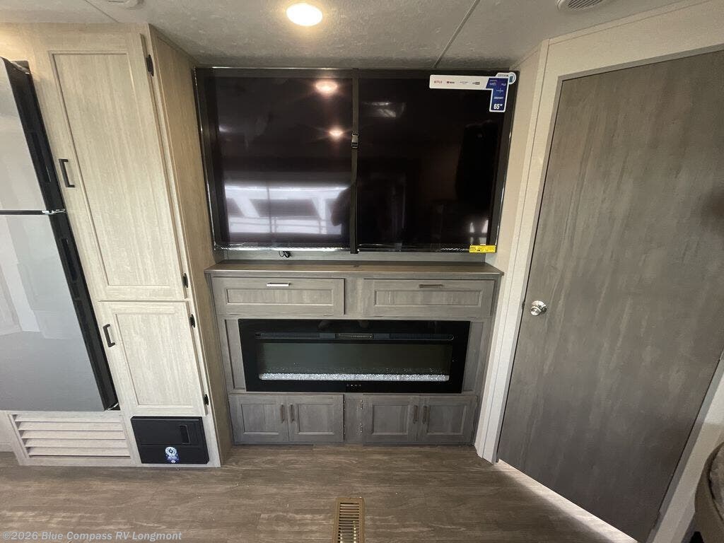 Life is easier in this travel trailer with dual entry doors! One of the entrances is right next to the front private bedroom which has a 60" x 74" queen bed with wardrobes on either side to keep your things tidy. The second entrance leads into the full bath, which also includes a full tub to make bathtime easier for little ones. The living area has everything you need for a cozy evening indoors between the 60" trundle sofa, U-shaped dinette, and entertainment center with a fireplace and 65" TV for cozy movie nights. Cook a sunrise breakfast at the outside camper kitchen with a griddle and mini refrigerator. There is also exterior storage with a fold-down table and a TV hookup if you plan to watch the big game outdoors!