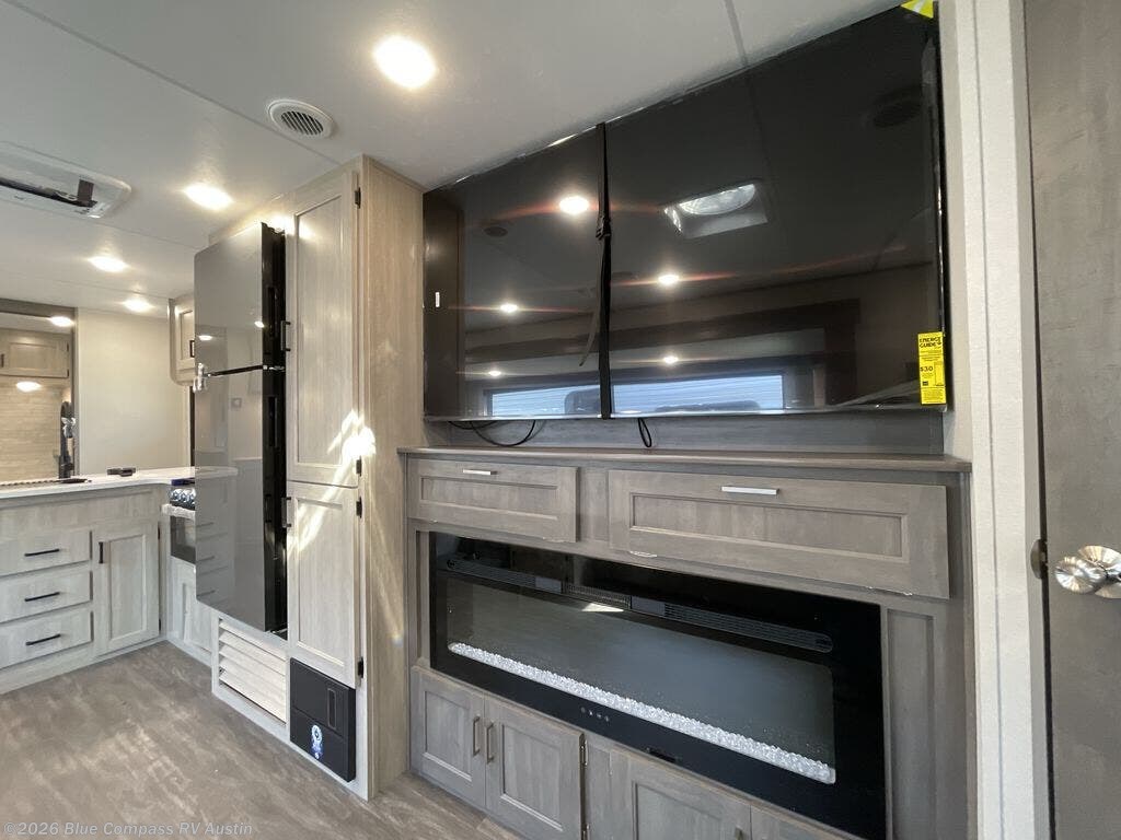 Life is easier in this travel trailer with dual entry doors! One of the entrances is right next to the front private bedroom which has a 60" x 74" queen bed with wardrobes on either side to keep your things tidy. The second entrance leads into the full bath, which also includes a full tub to make bathtime easier for little ones. The living area has everything you need for a cozy evening indoors between the 60" trundle sofa, U-shaped dinette, and entertainment center with a fireplace and 65" TV for cozy movie nights. Cook a sunrise breakfast at the outside camper kitchen with a griddle and mini refrigerator. There is also exterior storage with a fold-down table and a TV hookup if you plan to watch the big game outdoors!