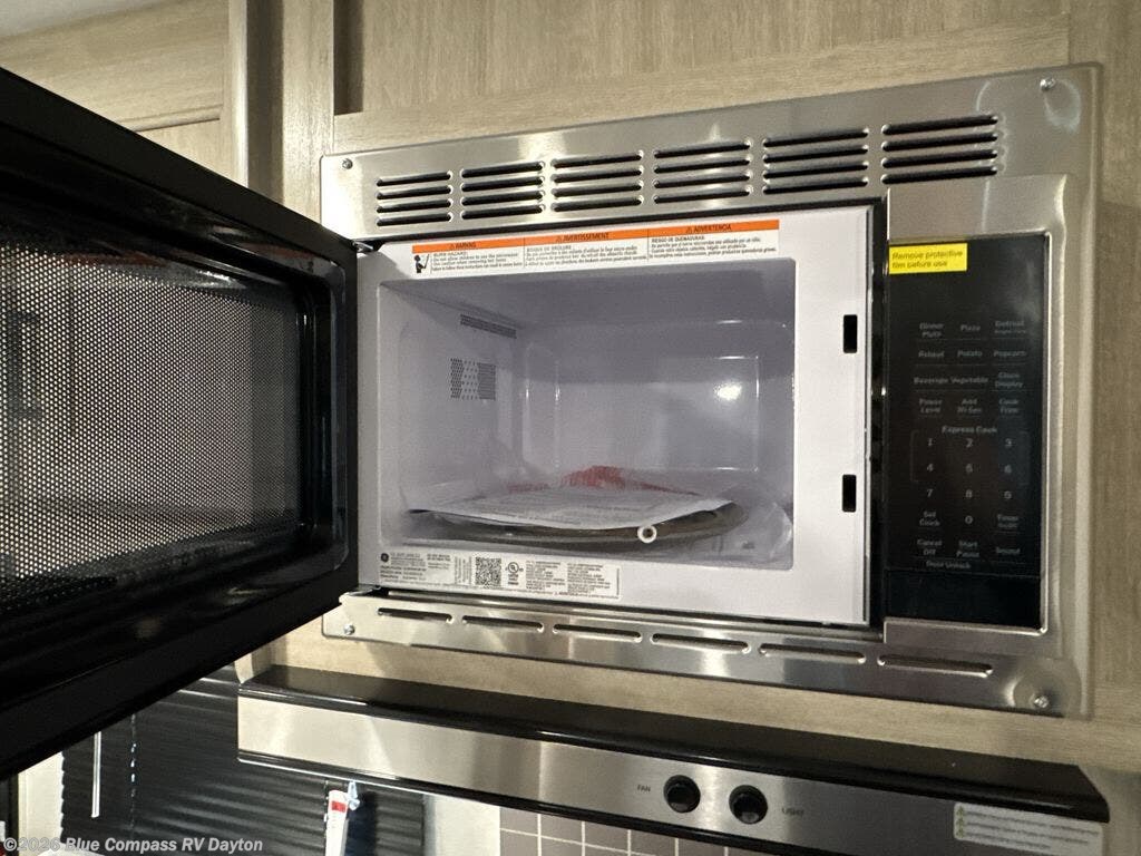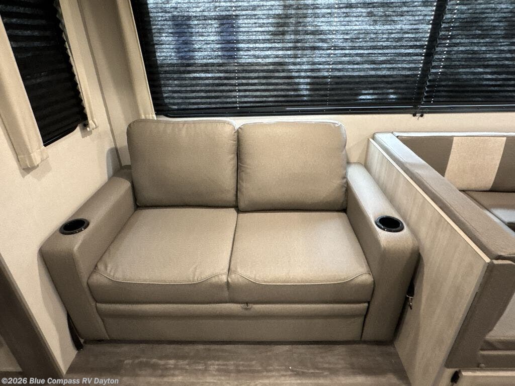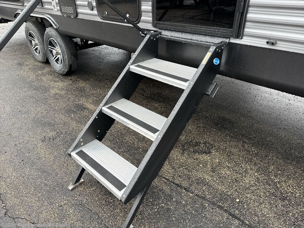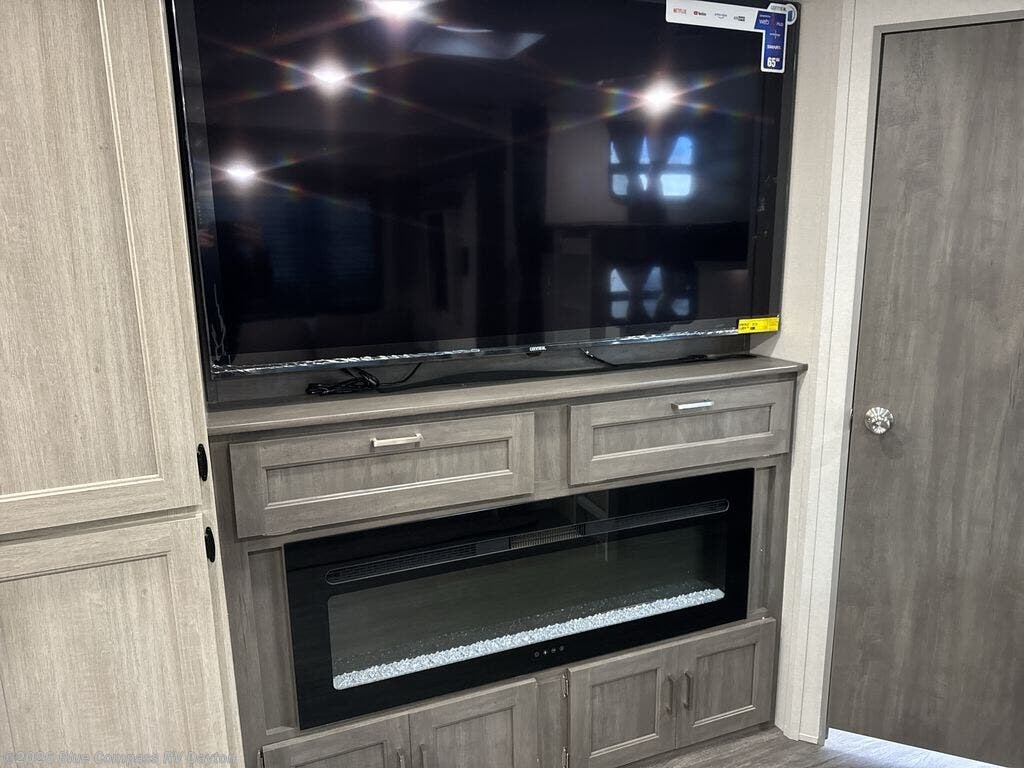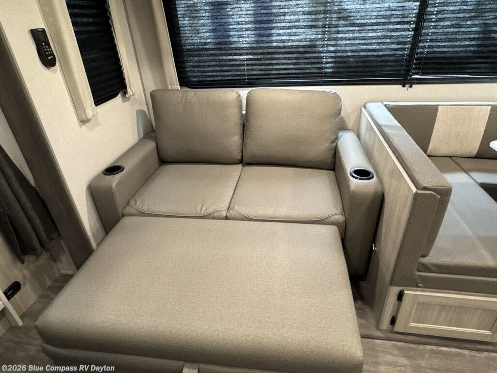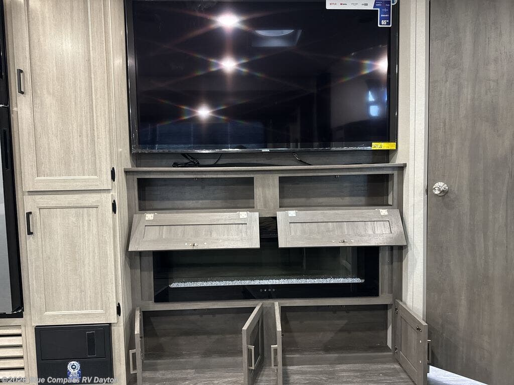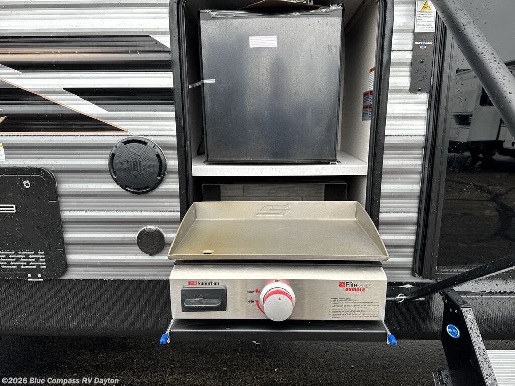 Life is easier in this travel trailer with dual entry doors! One of the entrances is right next to the front private bedroom which has a 60" x 74" queen bed with wardrobes on either side to keep your things tidy. The second entrance leads into the full bath, which also includes a full tub to make bathtime easier for little ones. The living area has everything you need for a cozy evening indoors between the 60" trundle sofa, U-shaped dinette, and entertainment center with a fireplace and 65" TV for cozy movie nights. Cook a sunrise breakfast at the outside camper kitchen with a griddle and mini refrigerator. There is also exterior storage with a fold-down table and a TV hookup if you plan to watch the big game outdoors!