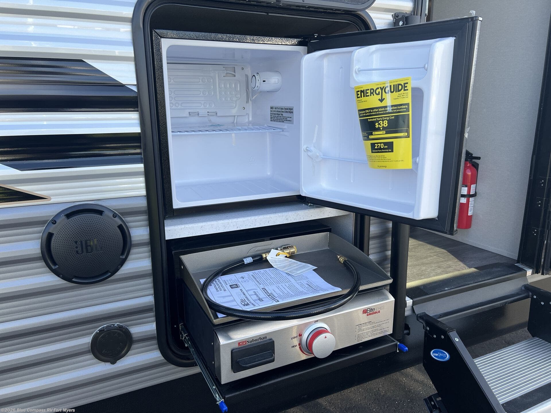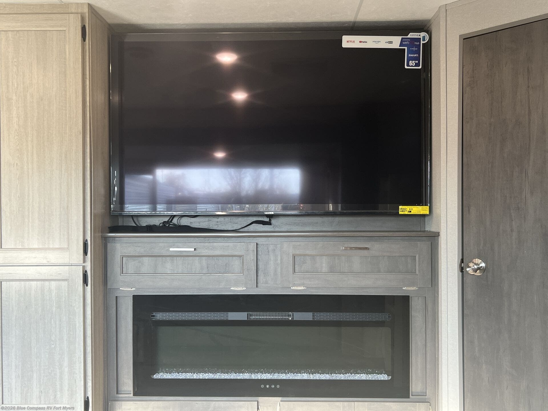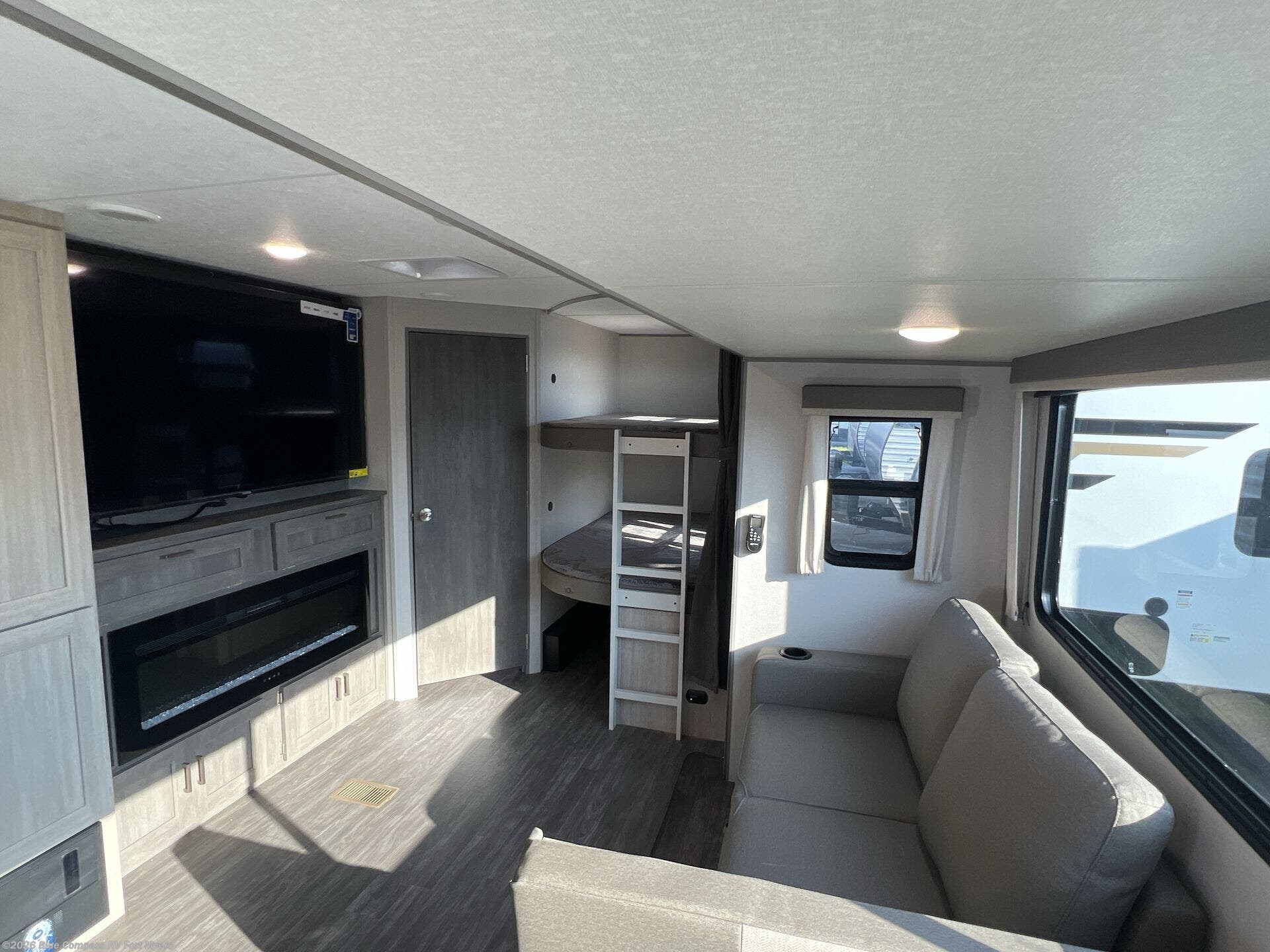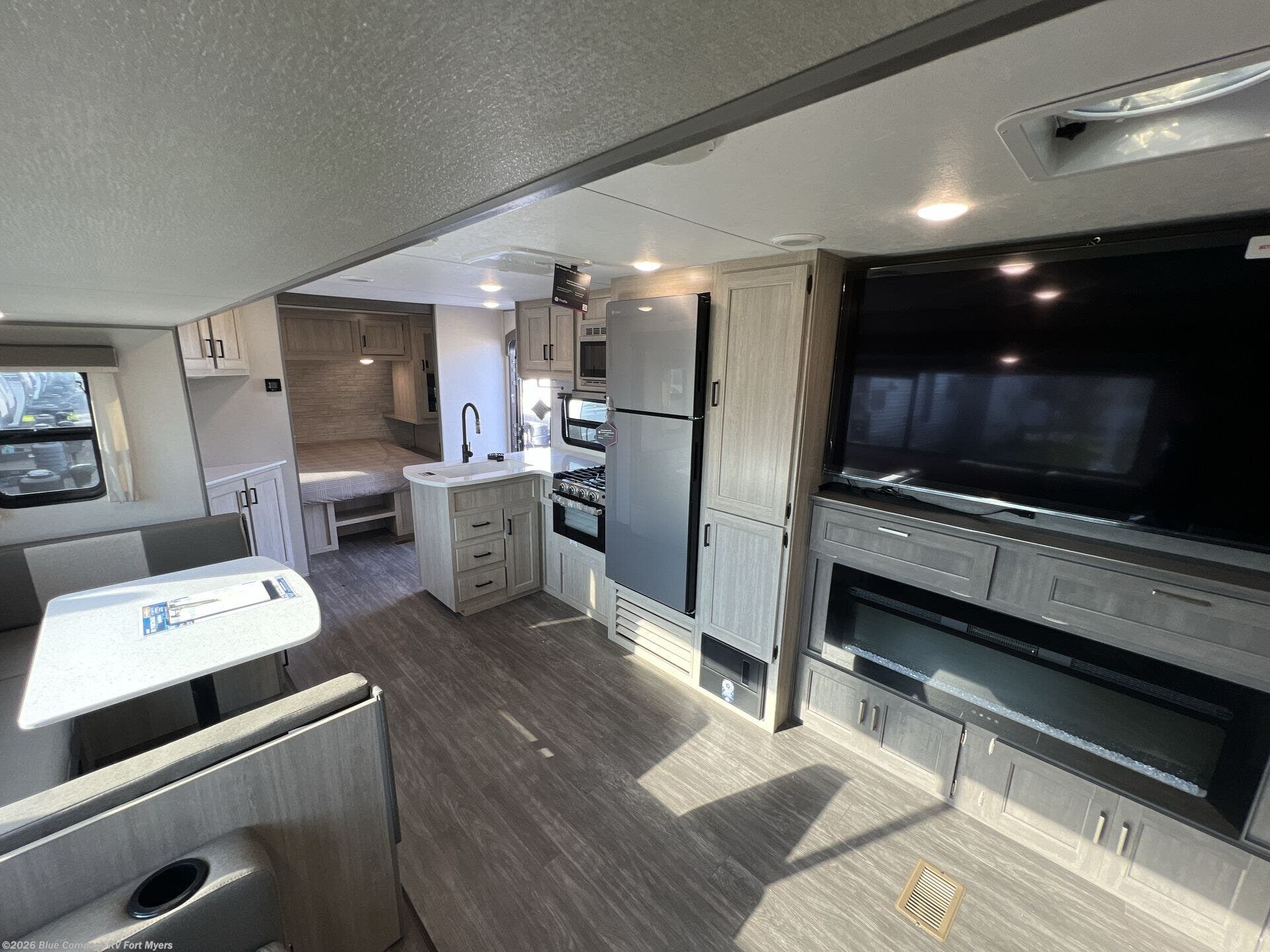 Life is easier in this travel trailer with dual entry doors! One of the entrances is right next to the front private bedroom which has a 60" x 74" queen bed with wardrobes on either side to keep your things tidy. The second entrance leads into the full bath, which also includes a full tub to make bathtime easier for little ones. The living area has everything you need for a cozy evening indoors between the 60" trundle sofa, U-shaped dinette, and entertainment center with a fireplace and 65" TV for cozy movie nights. Cook a sunrise breakfast at the outside camper kitchen with a griddle and mini refrigerator. There is also exterior storage with a fold-down table and a TV hookup if you plan to watch the big game outdoors!