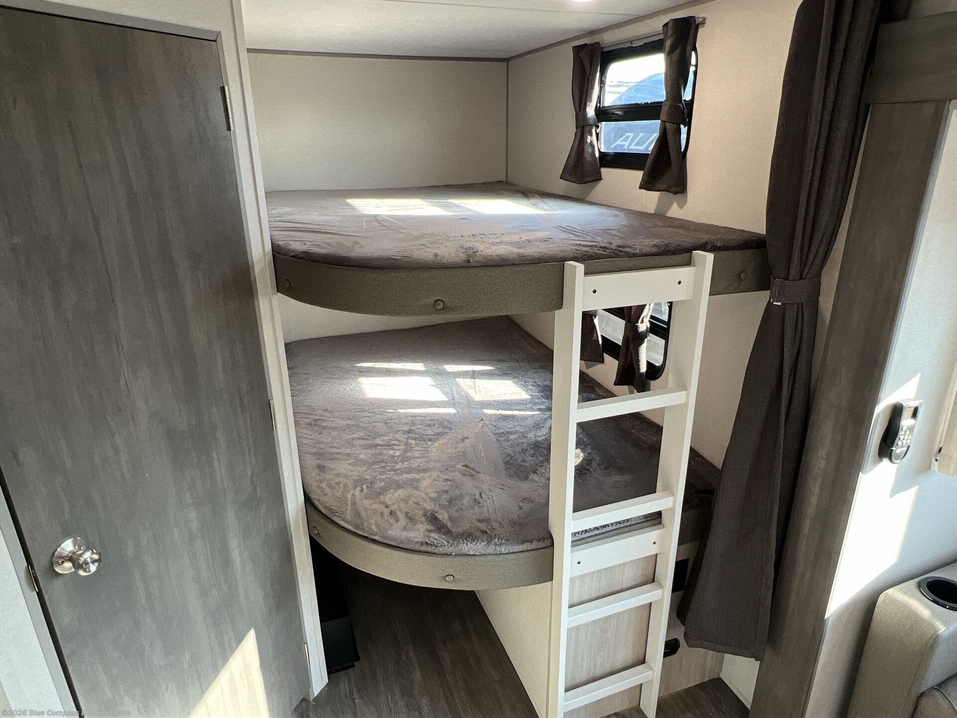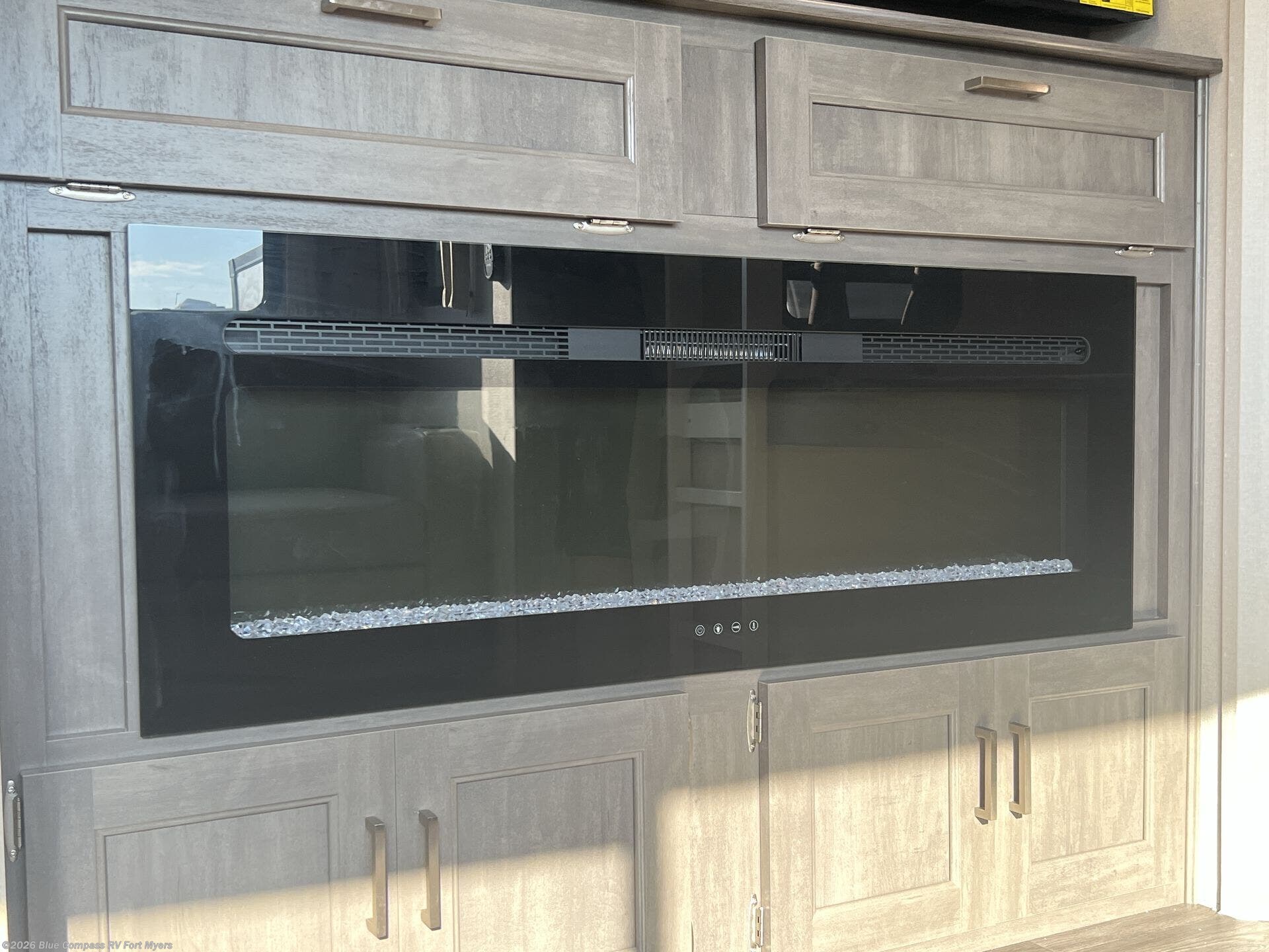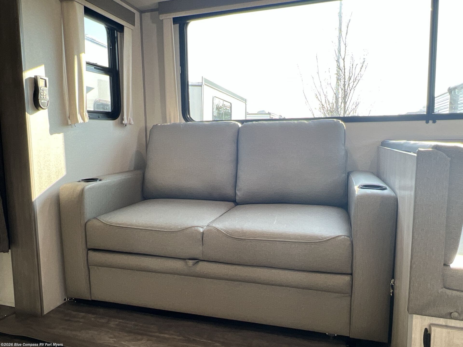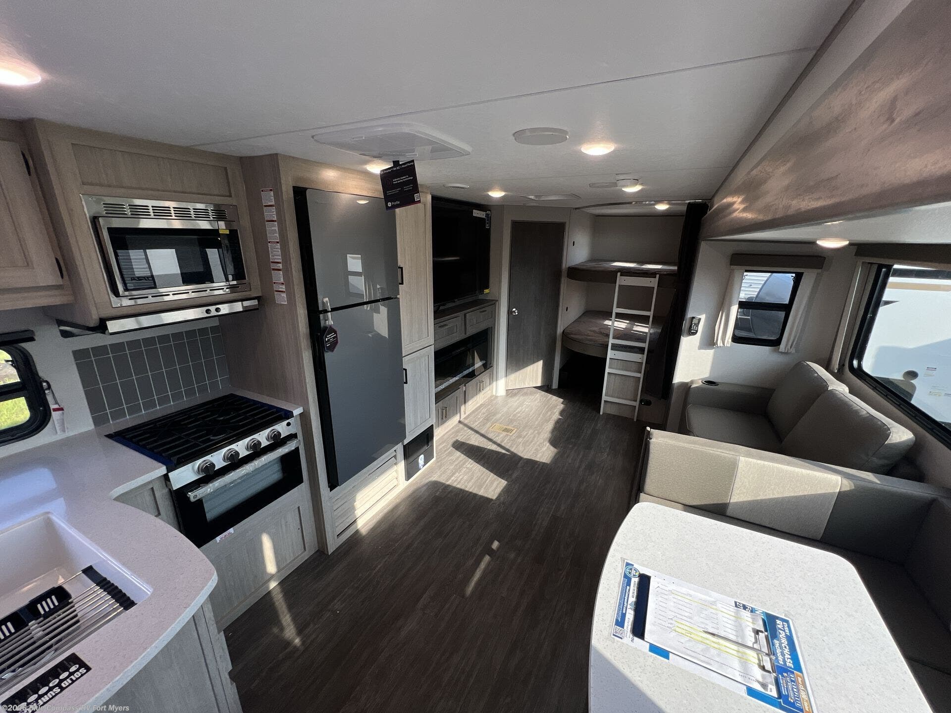 Life is easier in this travel trailer with dual entry doors! One of the entrances is right next to the front private bedroom which has a 60" x 74" queen bed with wardrobes on either side to keep your things tidy. The second entrance leads into the full bath, which also includes a full tub to make bathtime easier for little ones. The living area has everything you need for a cozy evening indoors between the 60" trundle sofa, U-shaped dinette, and entertainment center with a fireplace and 65" TV for cozy movie nights. Cook a sunrise breakfast at the outside camper kitchen with a griddle and mini refrigerator. There is also exterior storage with a fold-down table and a TV hookup if you plan to watch the big game outdoors!