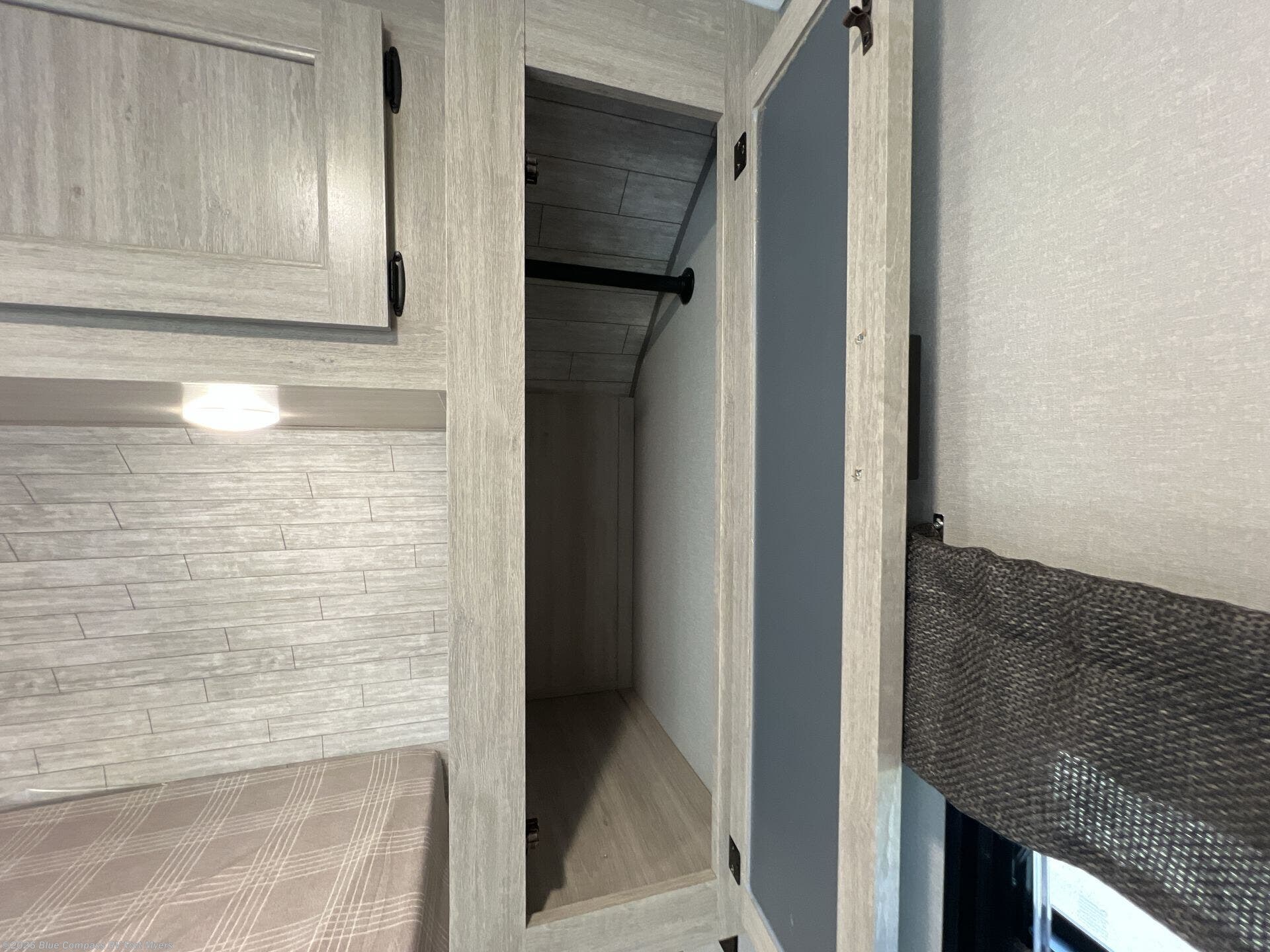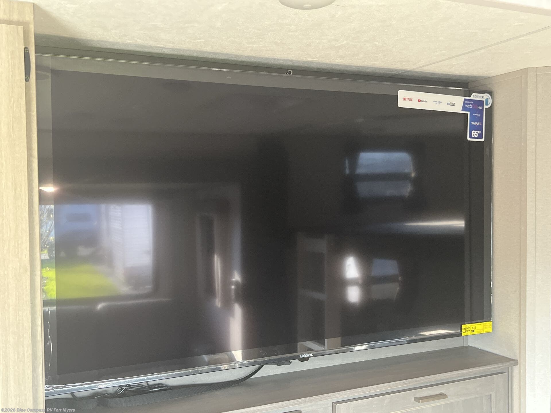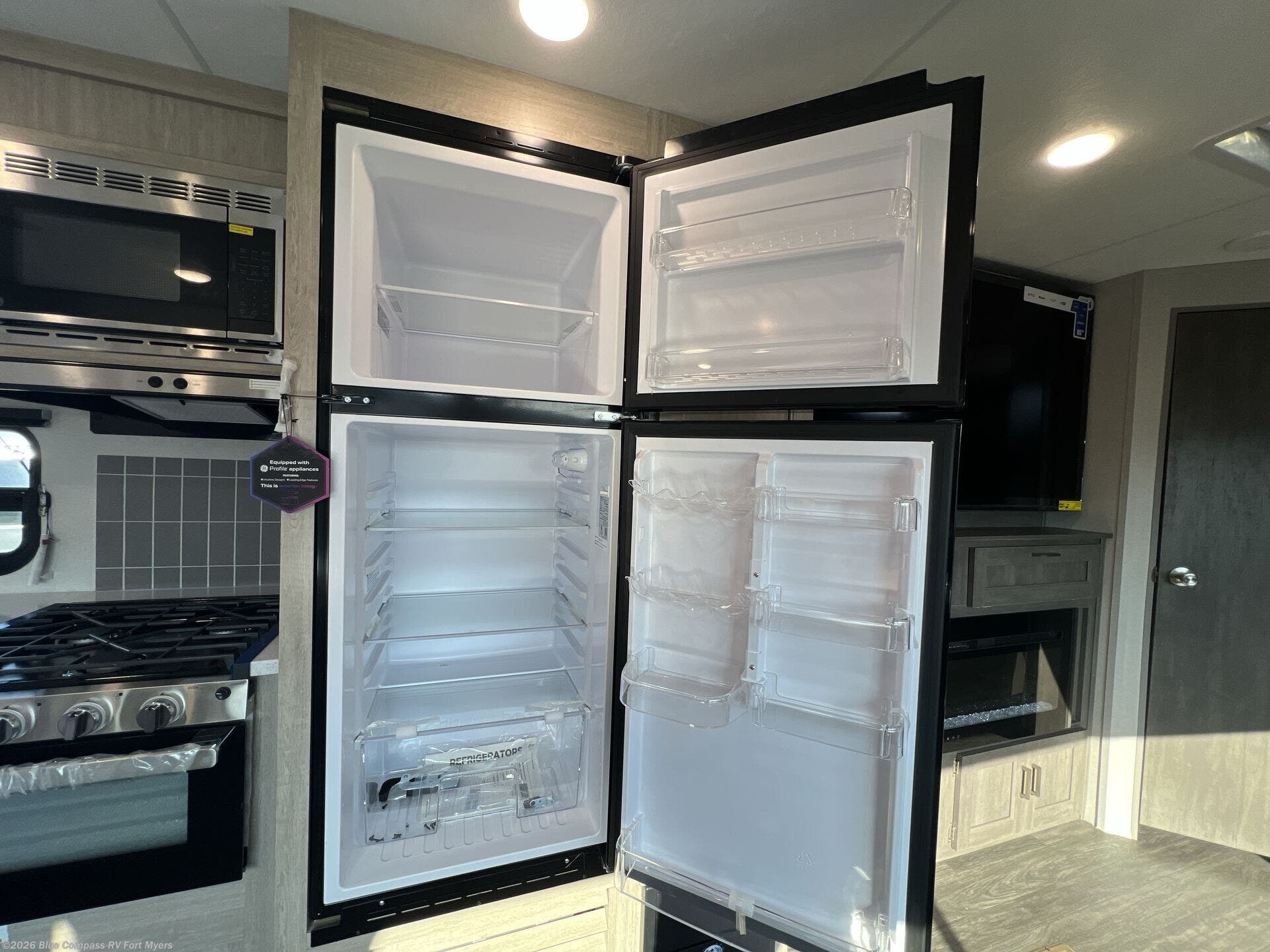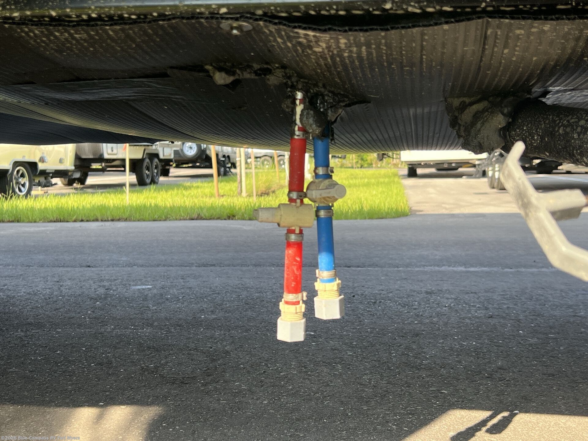 Life is easier in this travel trailer with dual entry doors! One of the entrances is right next to the front private bedroom which has a 60" x 74" queen bed with wardrobes on either side to keep your things tidy. The second entrance leads into the full bath, which also includes a full tub to make bathtime easier for little ones. The living area has everything you need for a cozy evening indoors between the 60" trundle sofa, U-shaped dinette, and entertainment center with a fireplace and 65" TV for cozy movie nights. Cook a sunrise breakfast at the outside camper kitchen with a griddle and mini refrigerator. There is also exterior storage with a fold-down table and a TV hookup if you plan to watch the big game outdoors!