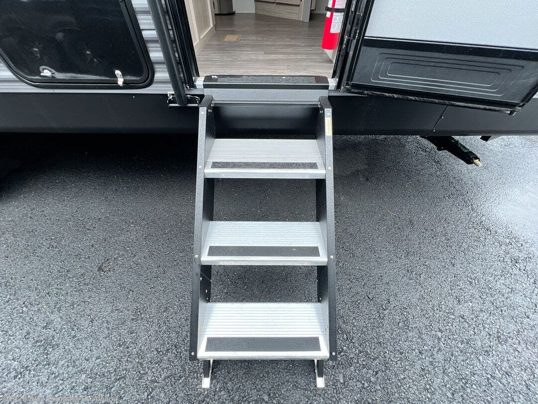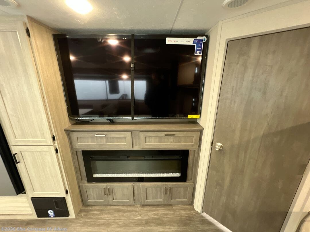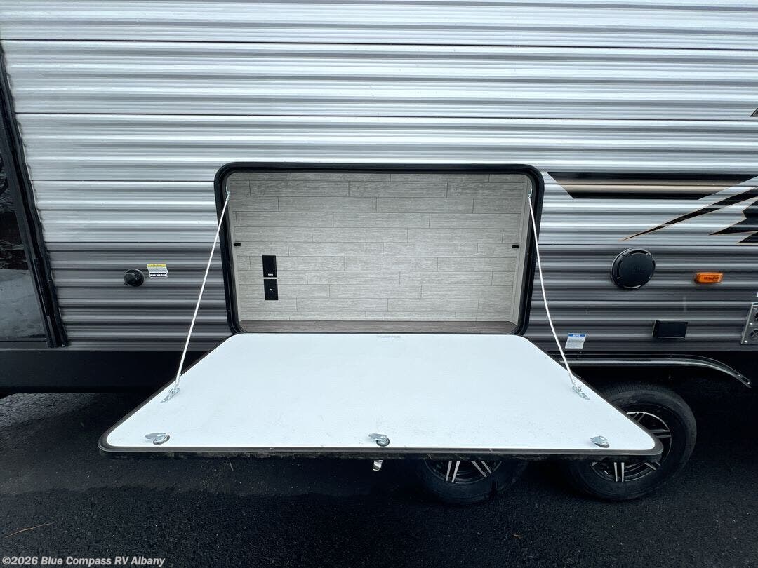 Life is easier in this travel trailer with dual entry doors! One of the entrances is right next to the front private bedroom which has a 60" x 74" queen bed with wardrobes on either side to keep your things tidy. The second entrance leads into the full bath, which also includes a full tub to make bathtime easier for little ones. The living area has everything you need for a cozy evening indoors between the 60" trundle sofa, U-shaped dinette, and entertainment center with a fireplace and 65" TV for cozy movie nights. Cook a sunrise breakfast at the outside camper kitchen with a griddle and mini refrigerator. There is also exterior storage with a fold-down table and a TV hookup if you plan to watch the big game outdoors!