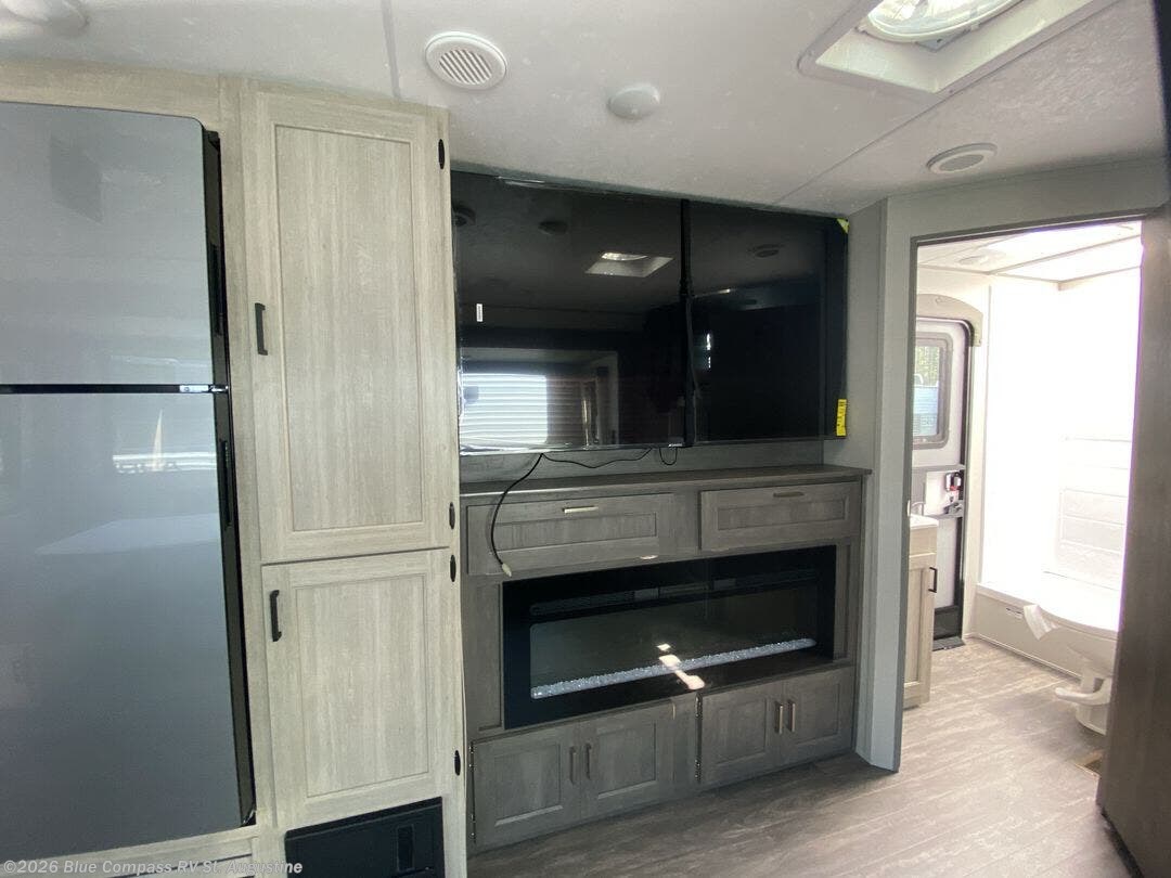 Life is easier in this travel trailer with dual entry doors! One of the entrances is right next to the front private bedroom which has a 60" x 74" queen bed with wardrobes on either side to keep your things tidy. The second entrance leads into the full bath, which also includes a full tub to make bathtime easier for little ones. The living area has everything you need for a cozy evening indoors between the 60" trundle sofa, U-shaped dinette, and entertainment center with a fireplace and 65" TV for cozy movie nights. Cook a sunrise breakfast at the outside camper kitchen with a griddle and mini refrigerator. There is also exterior storage with a fold-down table and a TV hookup if you plan to watch the big game outdoors!