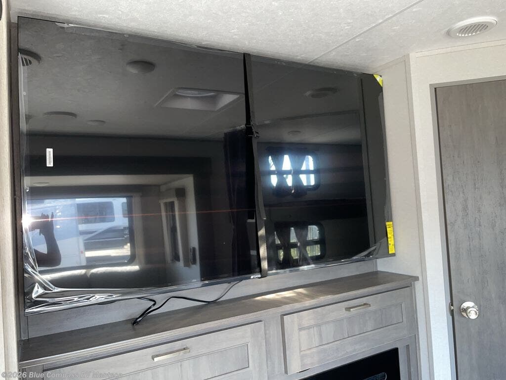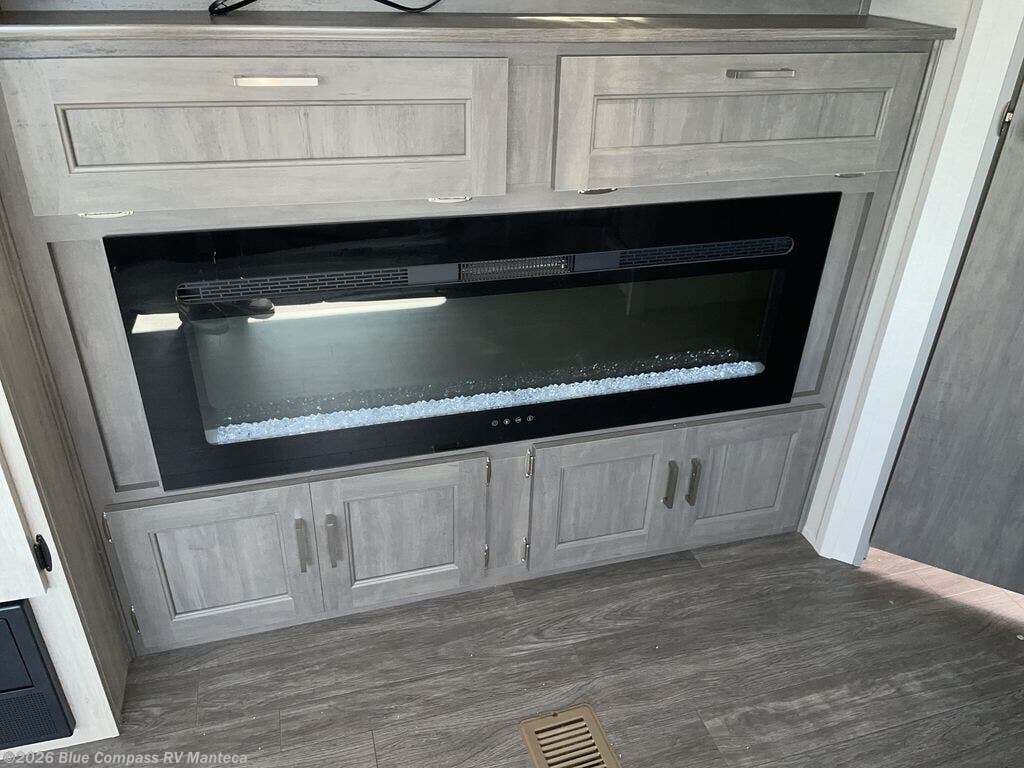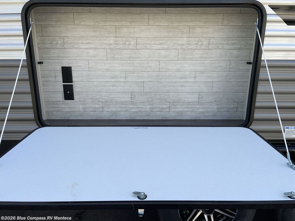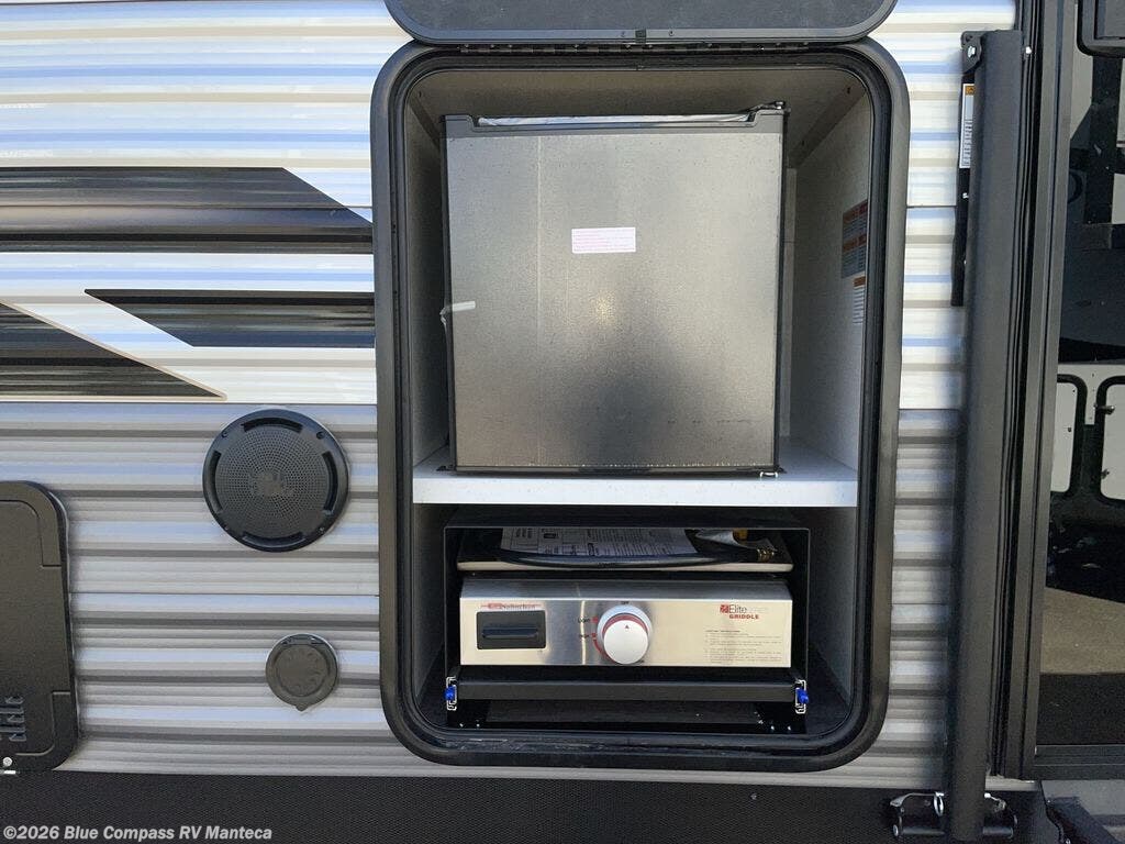 Life is easier in this travel trailer with dual entry doors! One of the entrances is right next to the front private bedroom which has a 60" x 74" queen bed with wardrobes on either side to keep your things tidy. The second entrance leads into the full bath, which also includes a full tub to make bathtime easier for little ones. The living area has everything you need for a cozy evening indoors between the 60" trundle sofa, U-shaped dinette, and entertainment center with a fireplace and 65" TV for cozy movie nights. Cook a sunrise breakfast at the outside camper kitchen with a griddle and mini refrigerator. There is also exterior storage with a fold-down table and a TV hookup if you plan to watch the big game outdoors!