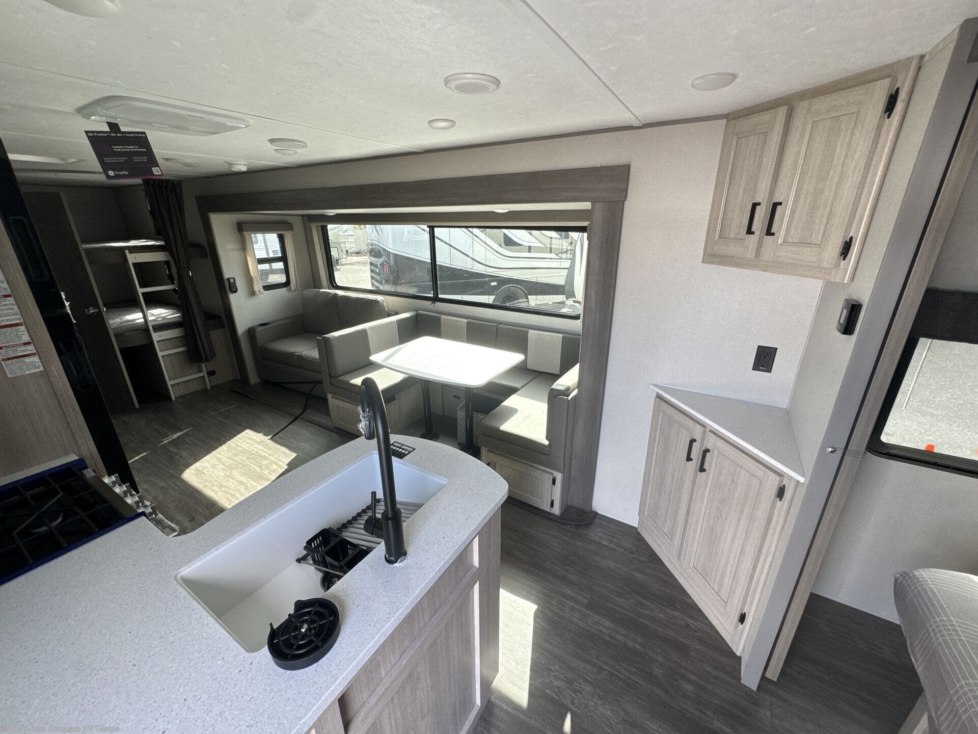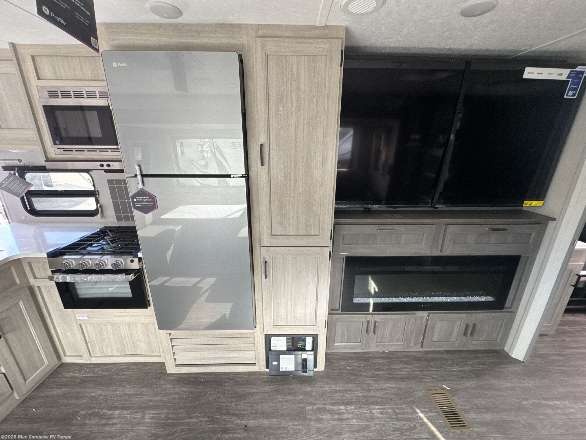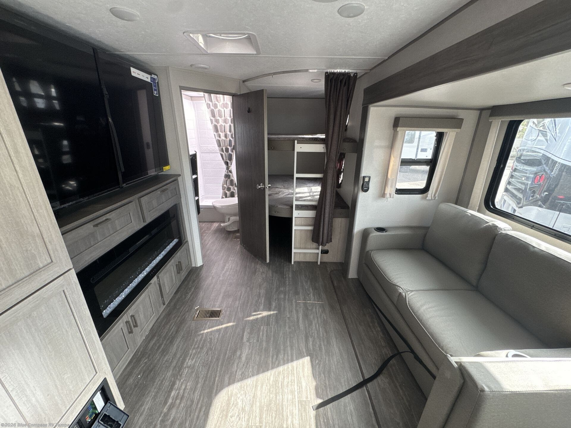 Life is easier in this travel trailer with dual entry doors! One of the entrances is right next to the front private bedroom which has a 60" x 74" queen bed with wardrobes on either side to keep your things tidy. The second entrance leads into the full bath, which also includes a full tub to make bathtime easier for little ones. The living area has everything you need for a cozy evening indoors between the 60" trundle sofa, U-shaped dinette, and entertainment center with a fireplace and 65" TV for cozy movie nights. Cook a sunrise breakfast at the outside camper kitchen with a griddle and mini refrigerator. There is also exterior storage with a fold-down table and a TV hookup if you plan to watch the big game outdoors!
