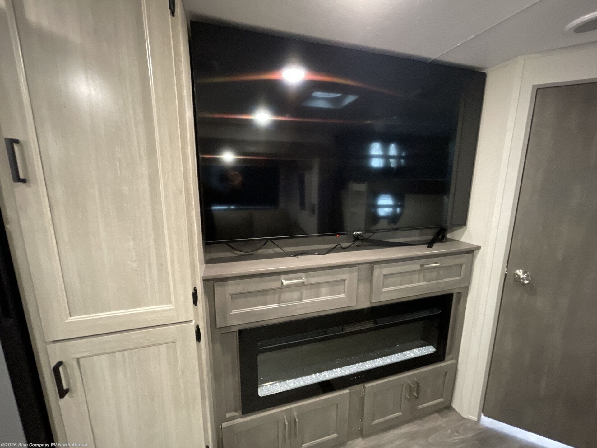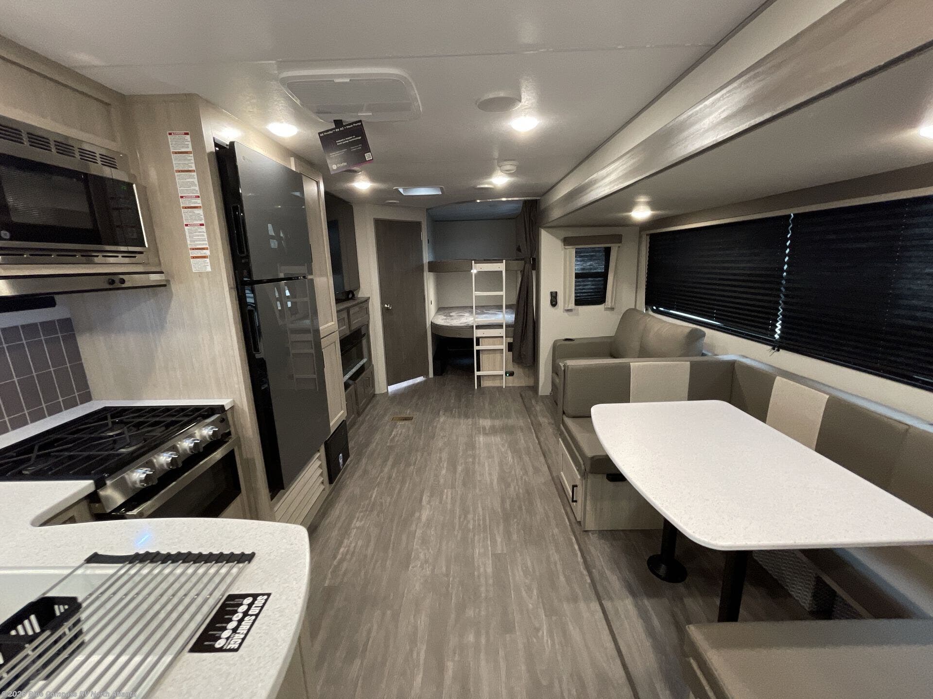 Life is easier in this travel trailer with dual entry doors! One of the entrances is right next to the front private bedroom which has a 60" x 74" queen bed with wardrobes on either side to keep your things tidy. The second entrance leads into the full bath, which also includes a full tub to make bathtime easier for little ones. The living area has everything you need for a cozy evening indoors between the 60" trundle sofa, U-shaped dinette, and entertainment center with a fireplace and 65" TV for cozy movie nights. Cook a sunrise breakfast at the outside camper kitchen with a griddle and mini refrigerator. There is also exterior storage with a fold-down table and a TV hookup if you plan to watch the big game outdoors!