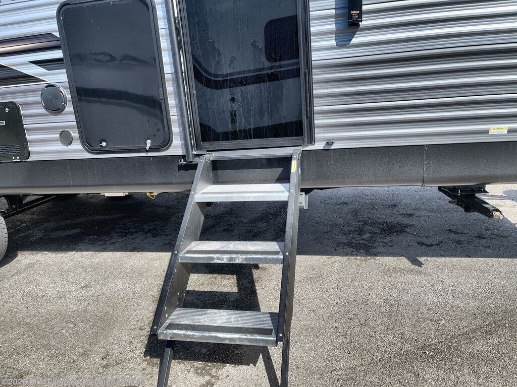 Life is easier in this travel trailer with dual entry doors! One of the entrances is right next to the front private bedroom which has a 60" x 74" queen bed with wardrobes on either side to keep your things tidy. The second entrance leads into the full bath, which also includes a full tub to make bathtime easier for little ones. The living area has everything you need for a cozy evening indoors between the 60" trundle sofa, U-shaped dinette, and entertainment center with a fireplace and 65" TV for cozy movie nights. Cook a sunrise breakfast at the outside camper kitchen with a griddle and mini refrigerator. There is also exterior storage with a fold-down table and a TV hookup if you plan to watch the big game outdoors!