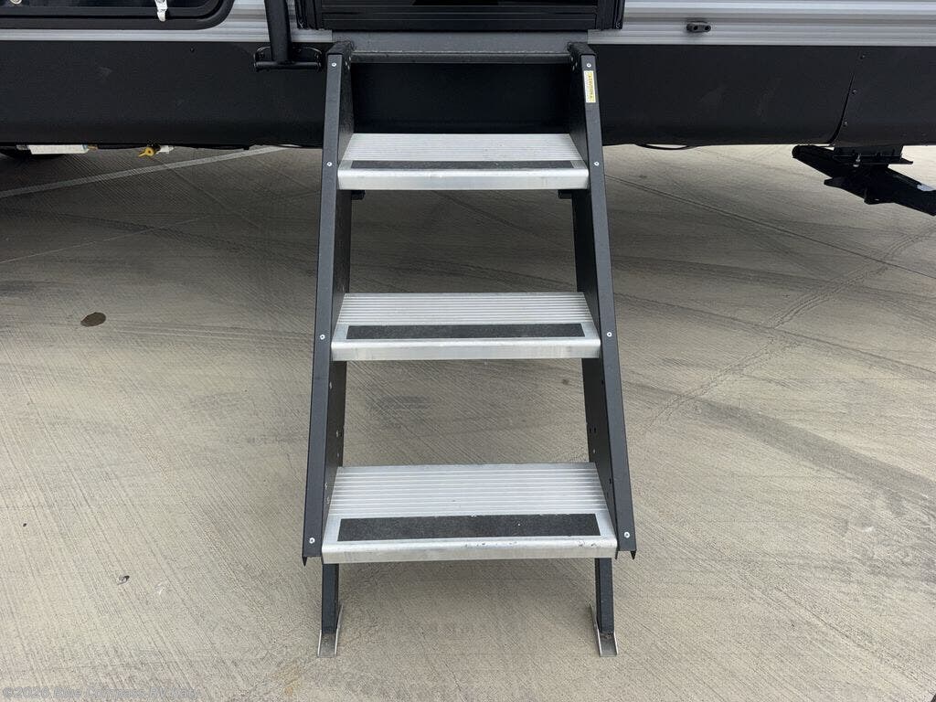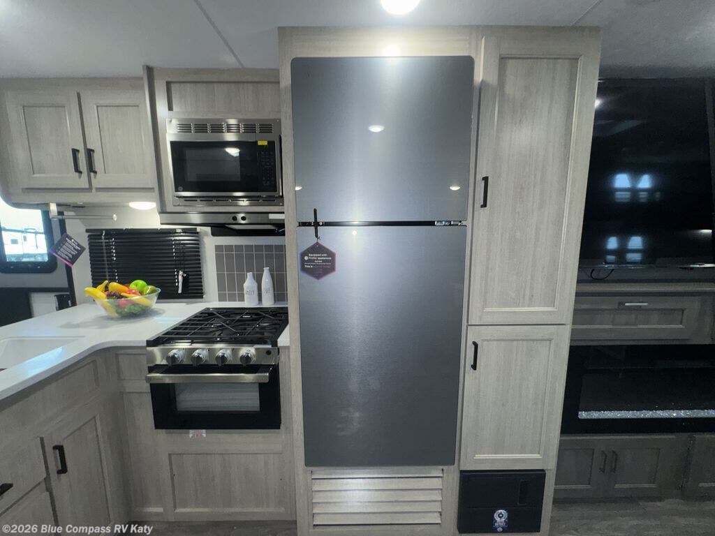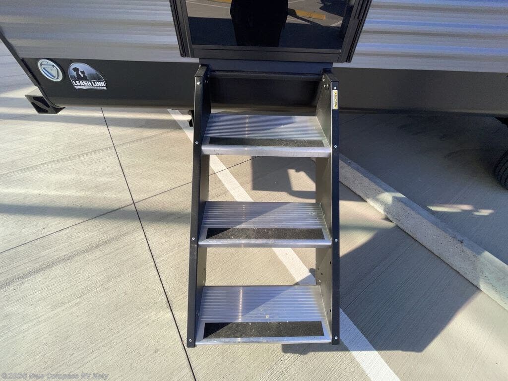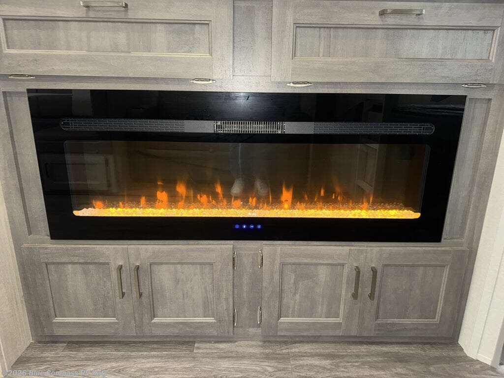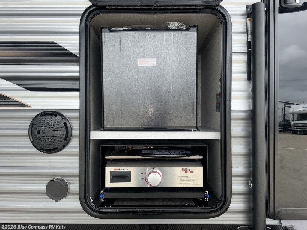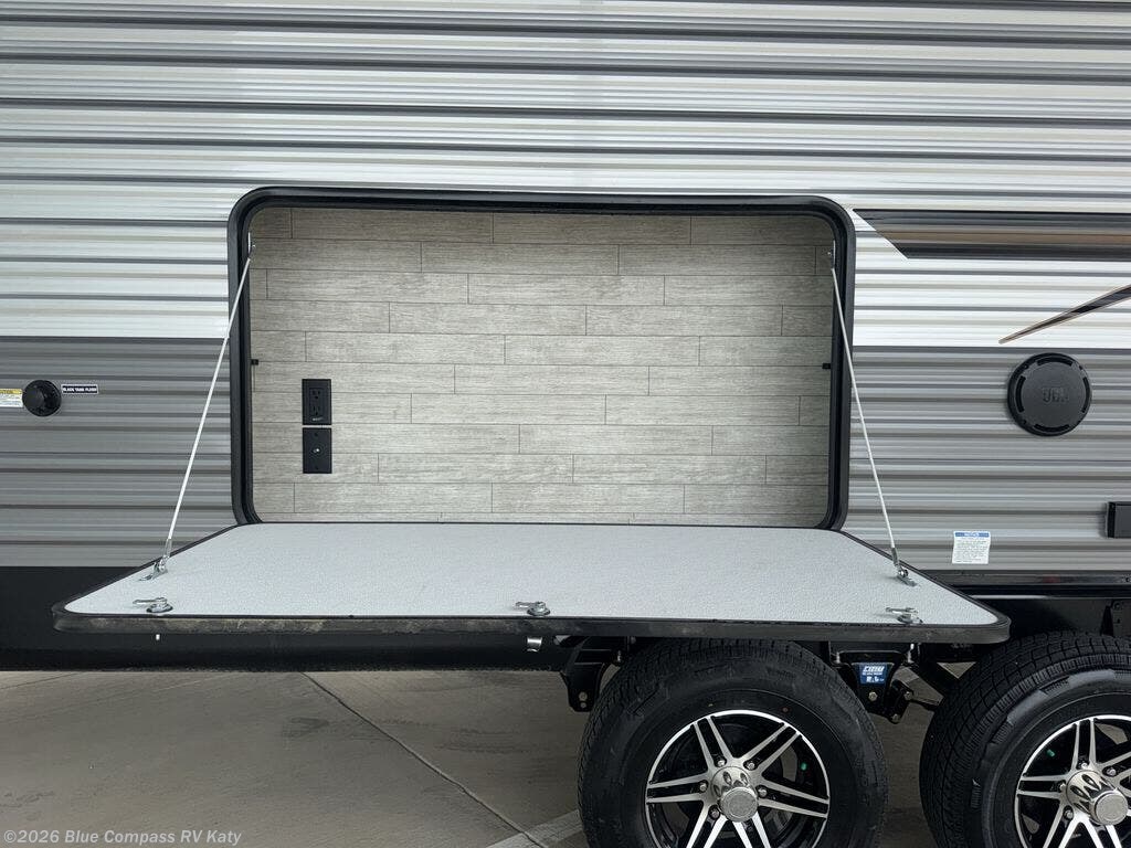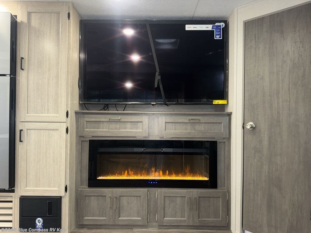 Life is easier in this travel trailer with dual entry doors! One of the entrances is right next to the front private bedroom which has a 60" x 74" queen bed with wardrobes on either side to keep your things tidy. The second entrance leads into the full bath, which also includes a full tub to make bathtime easier for little ones. The living area has everything you need for a cozy evening indoors between the 60" trundle sofa, U-shaped dinette, and entertainment center with a fireplace and 65" TV for cozy movie nights. Cook a sunrise breakfast at the outside camper kitchen with a griddle and mini refrigerator. There is also exterior storage with a fold-down table and a TV hookup if you plan to watch the big game outdoors!