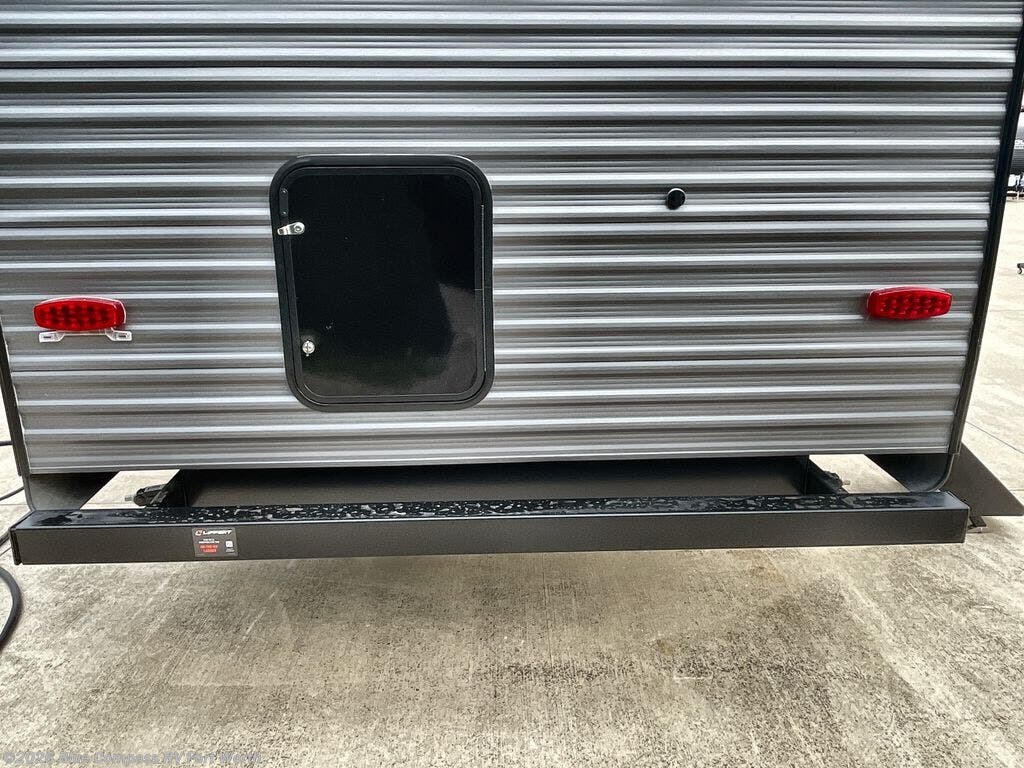Life is easier in this travel trailer with dual entry doors! One of the entrances is right next to the front private bedroom which has a 60" x 74" queen bed with wardrobes on either side to keep your things tidy. The second entrance leads into the full bath, which also includes a full tub to make bathtime easier for little ones. The living area has everything you need for a cozy evening indoors between the 60" trundle sofa, U-shaped dinette, and entertainment center with a fireplace and 65" TV for cozy movie nights. Cook a sunrise breakfast at the outside camper kitchen with a griddle and mini refrigerator. There is also exterior storage with a fold-down table and a TV hookup if you plan to watch the big game outdoors!