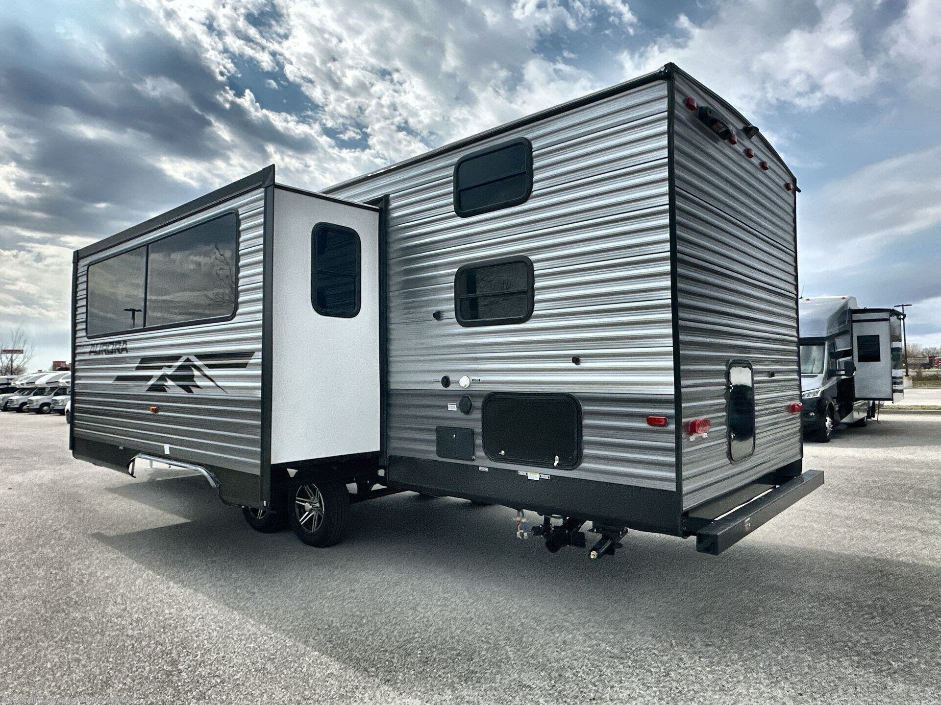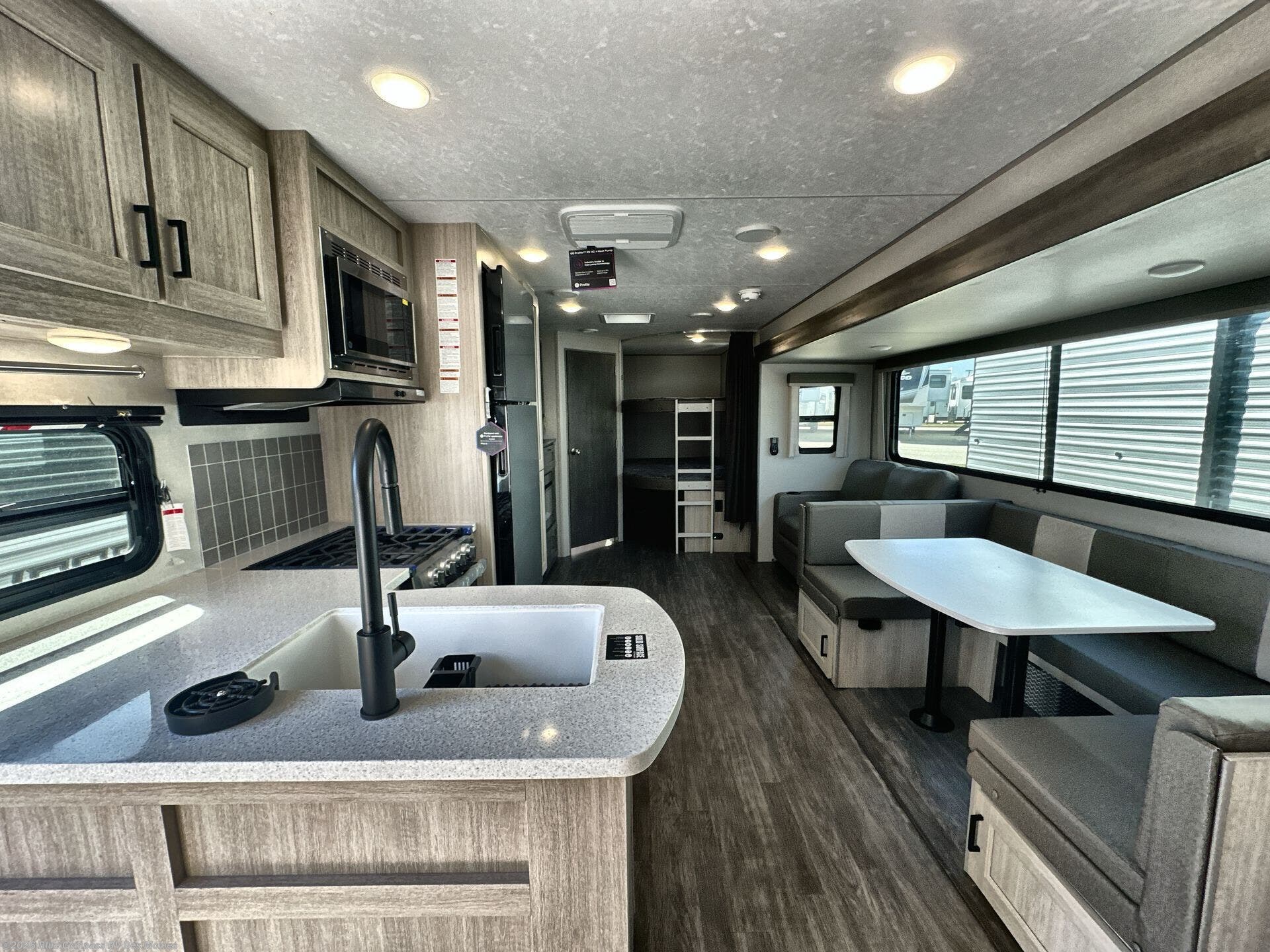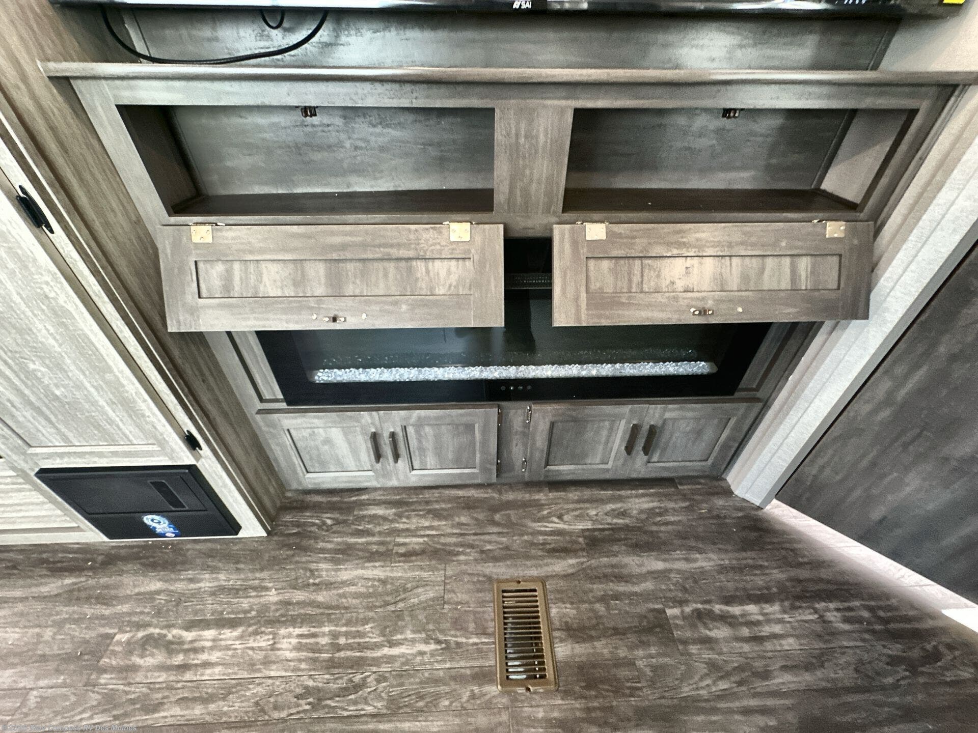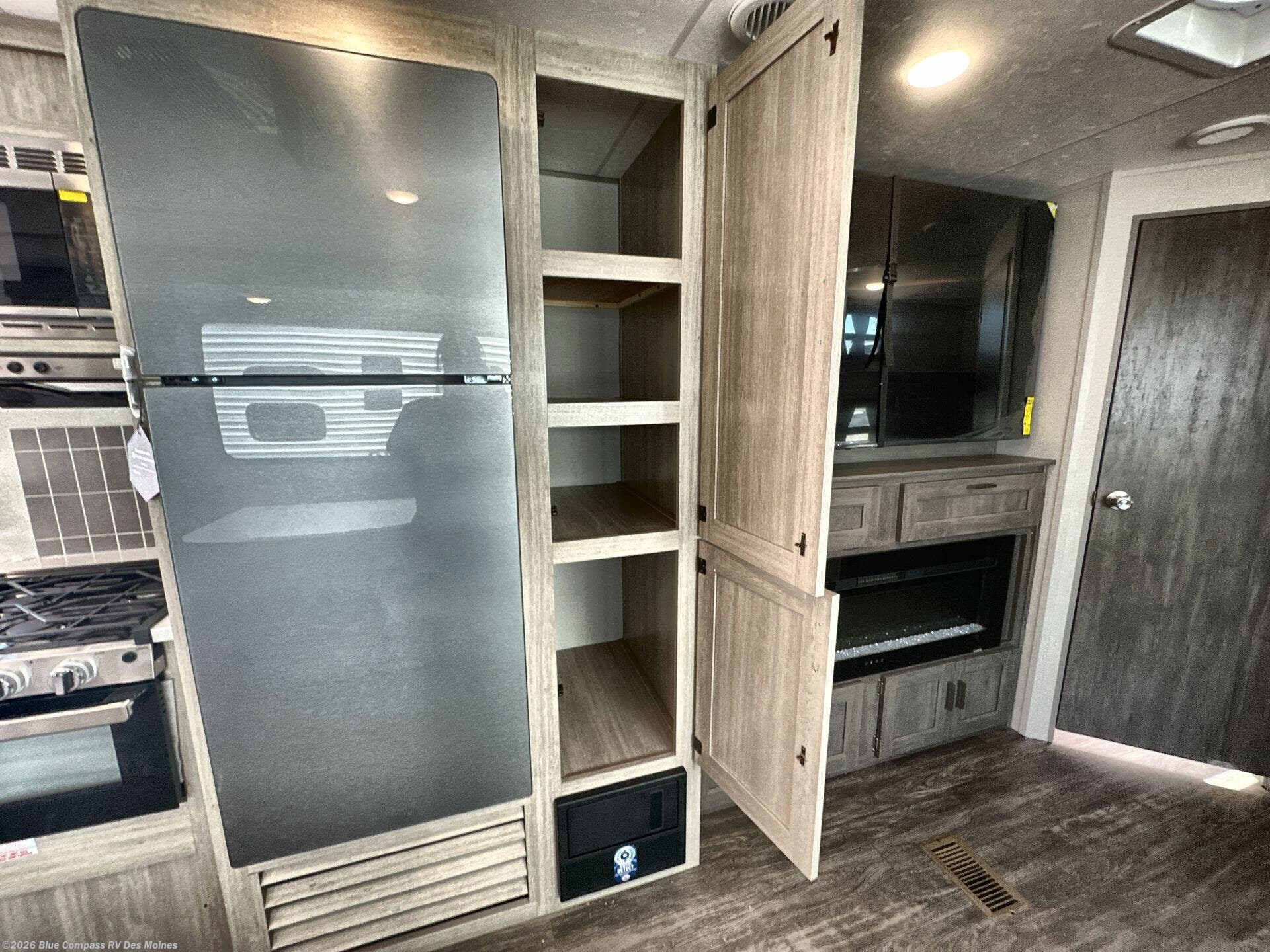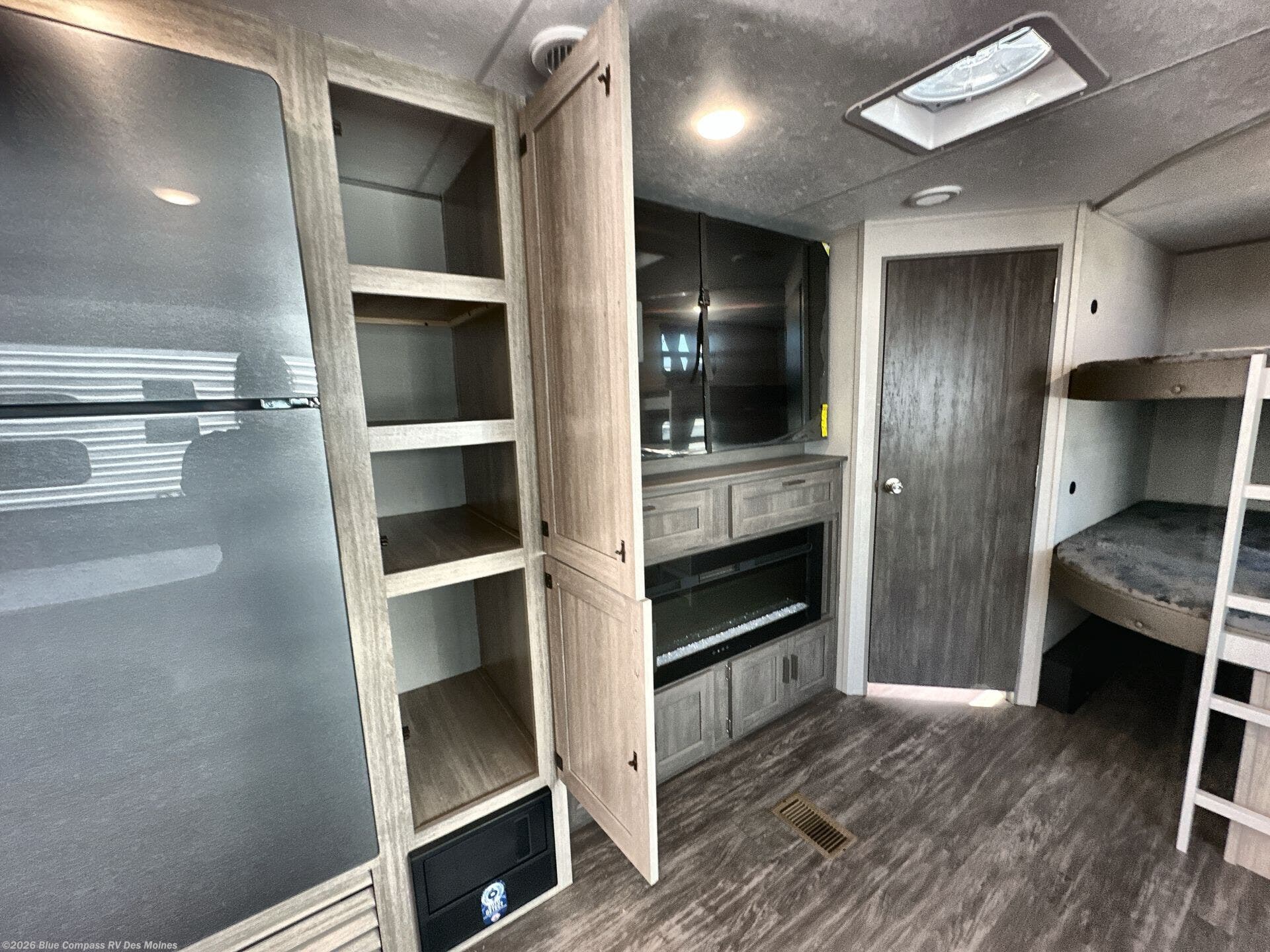 Life is easier in this travel trailer with dual entry doors! One of the entrances is right next to the front private bedroom which has a 60" x 74" queen bed with wardrobes on either side to keep your things tidy. The second entrance leads into the full bath, which also includes a full tub to make bathtime easier for little ones. The living area has everything you need for a cozy evening indoors between the 60" trundle sofa, U-shaped dinette, and entertainment center with a fireplace and 65" TV for cozy movie nights. Cook a sunrise breakfast at the outside camper kitchen with a griddle and mini refrigerator. There is also exterior storage with a fold-down table and a TV hookup if you plan to watch the big game outdoors!