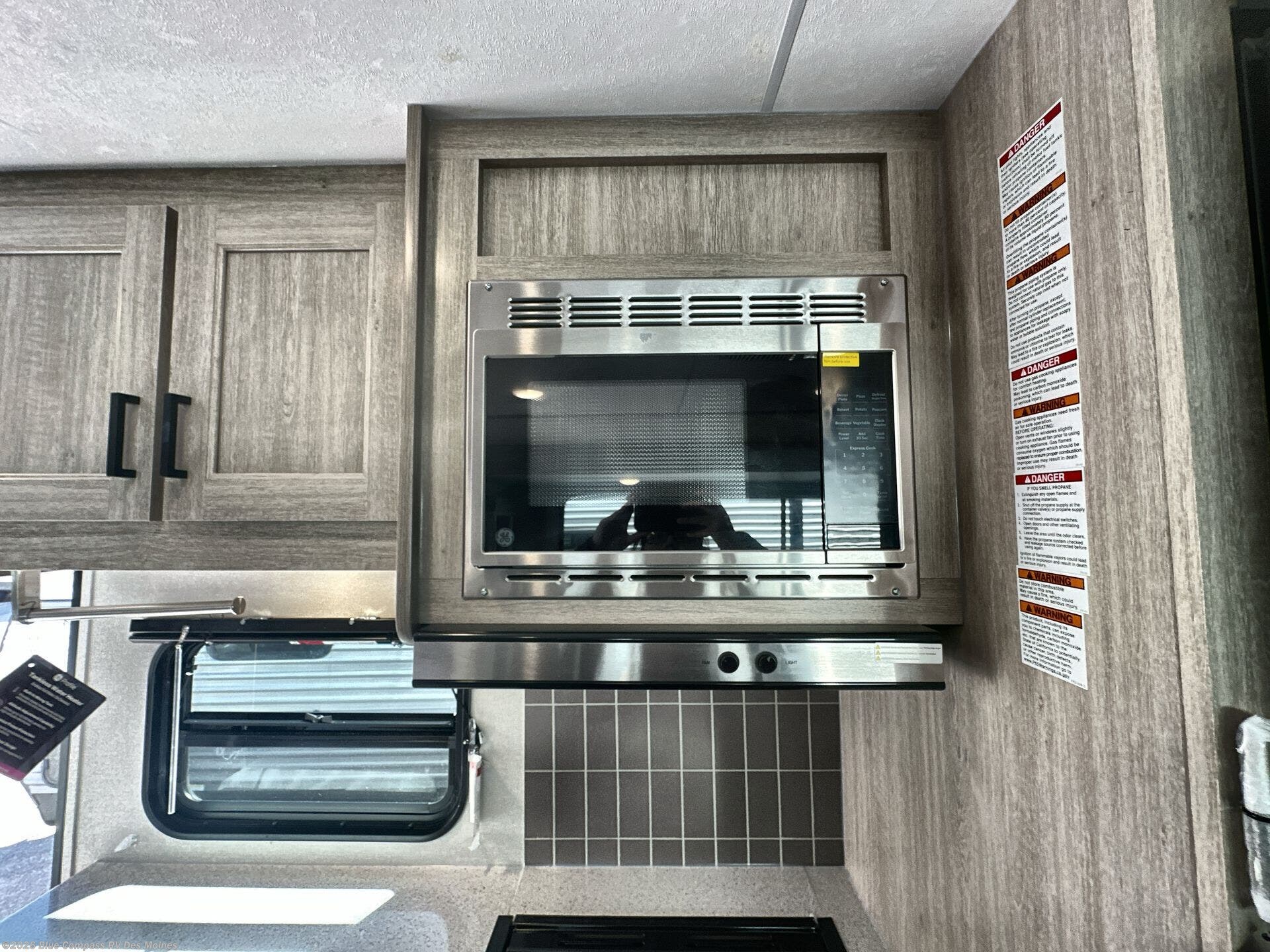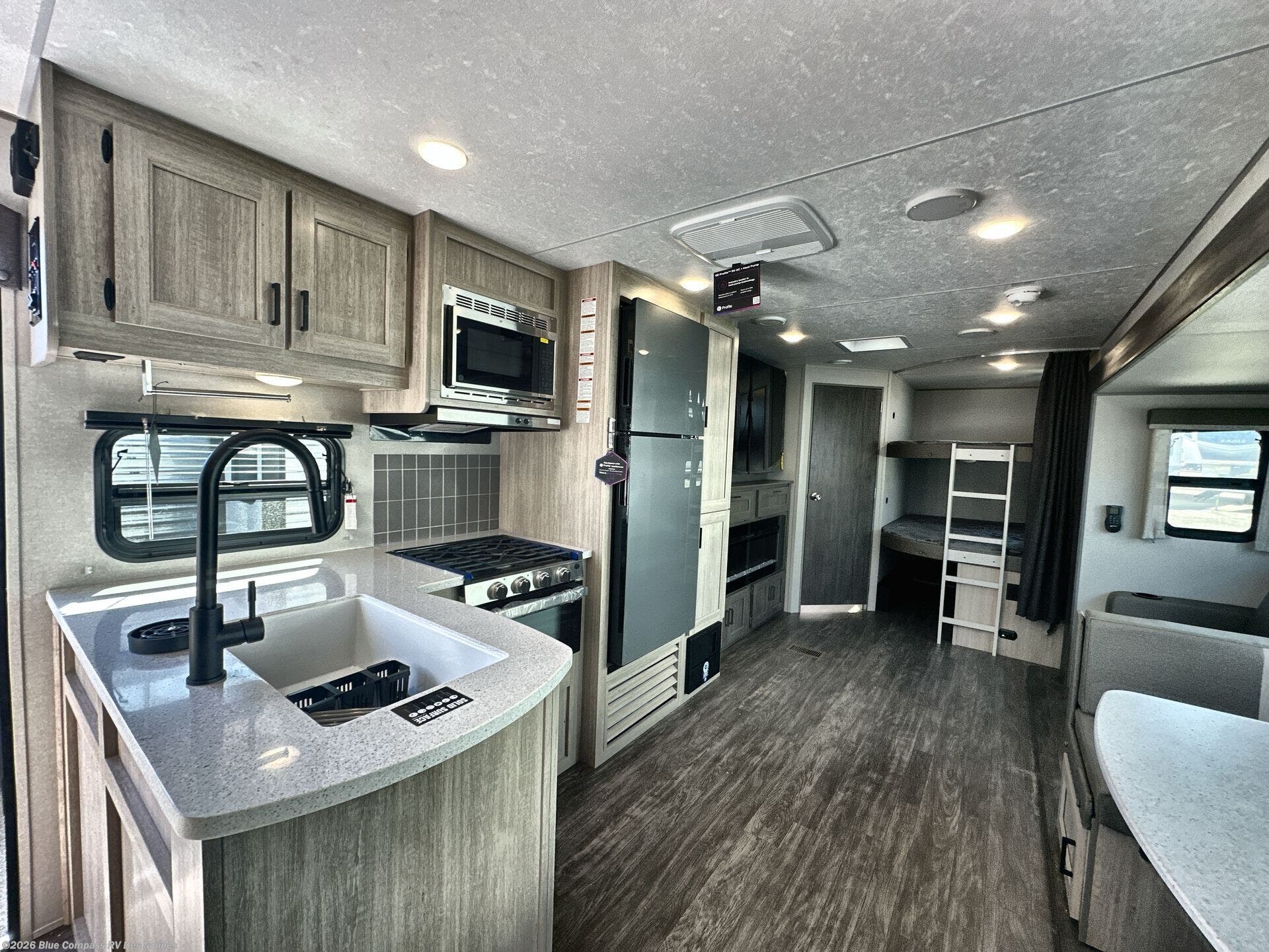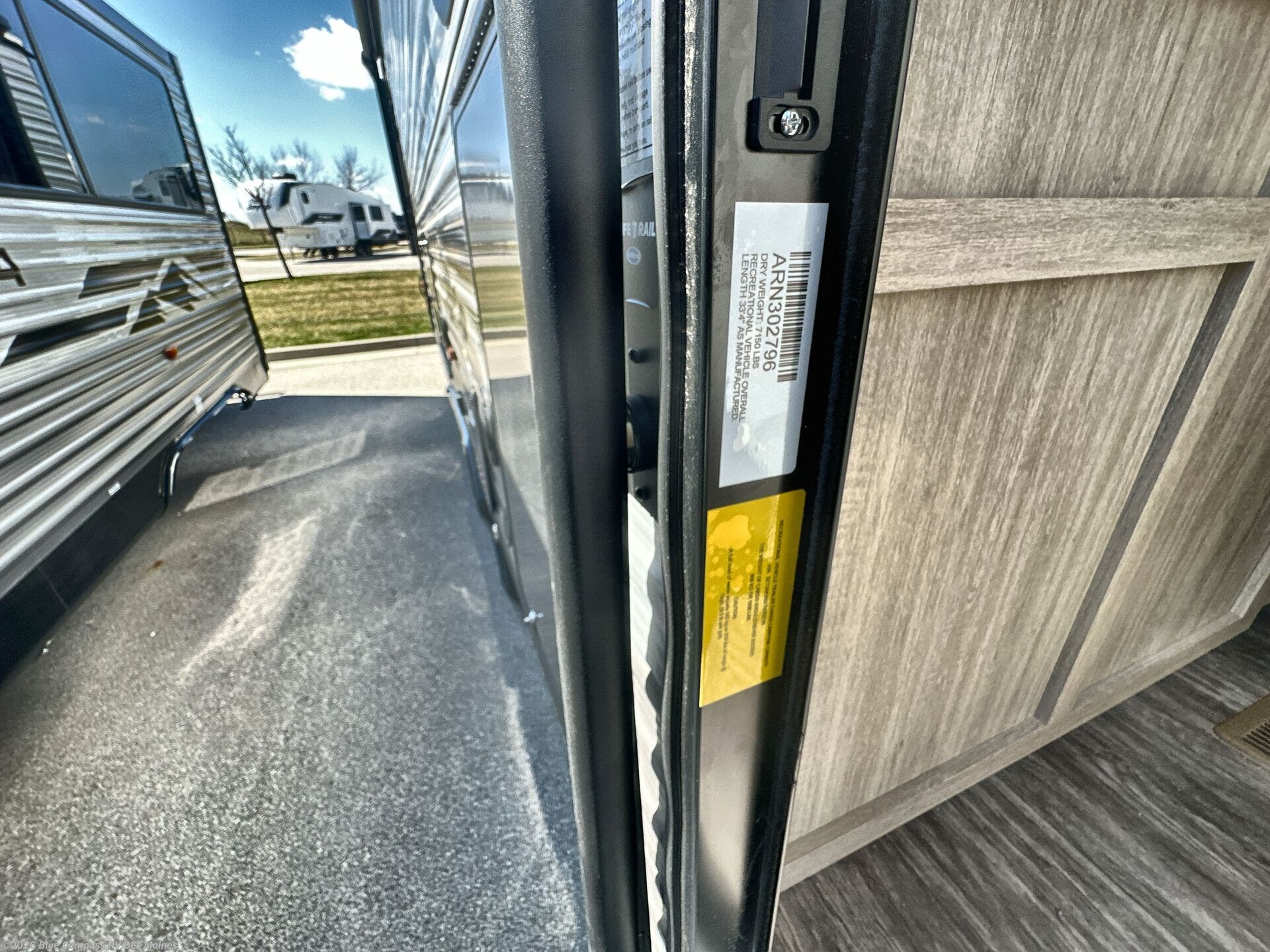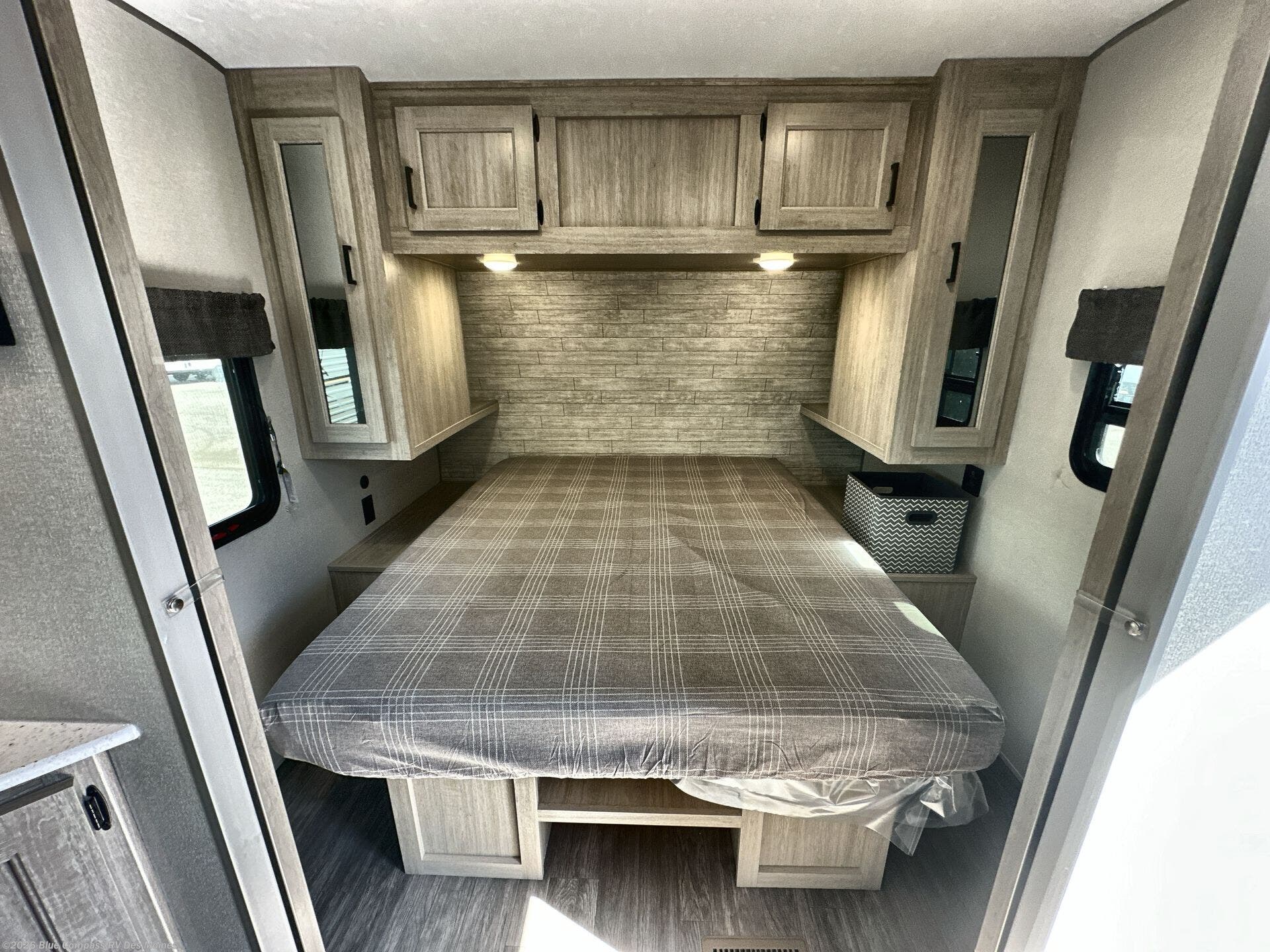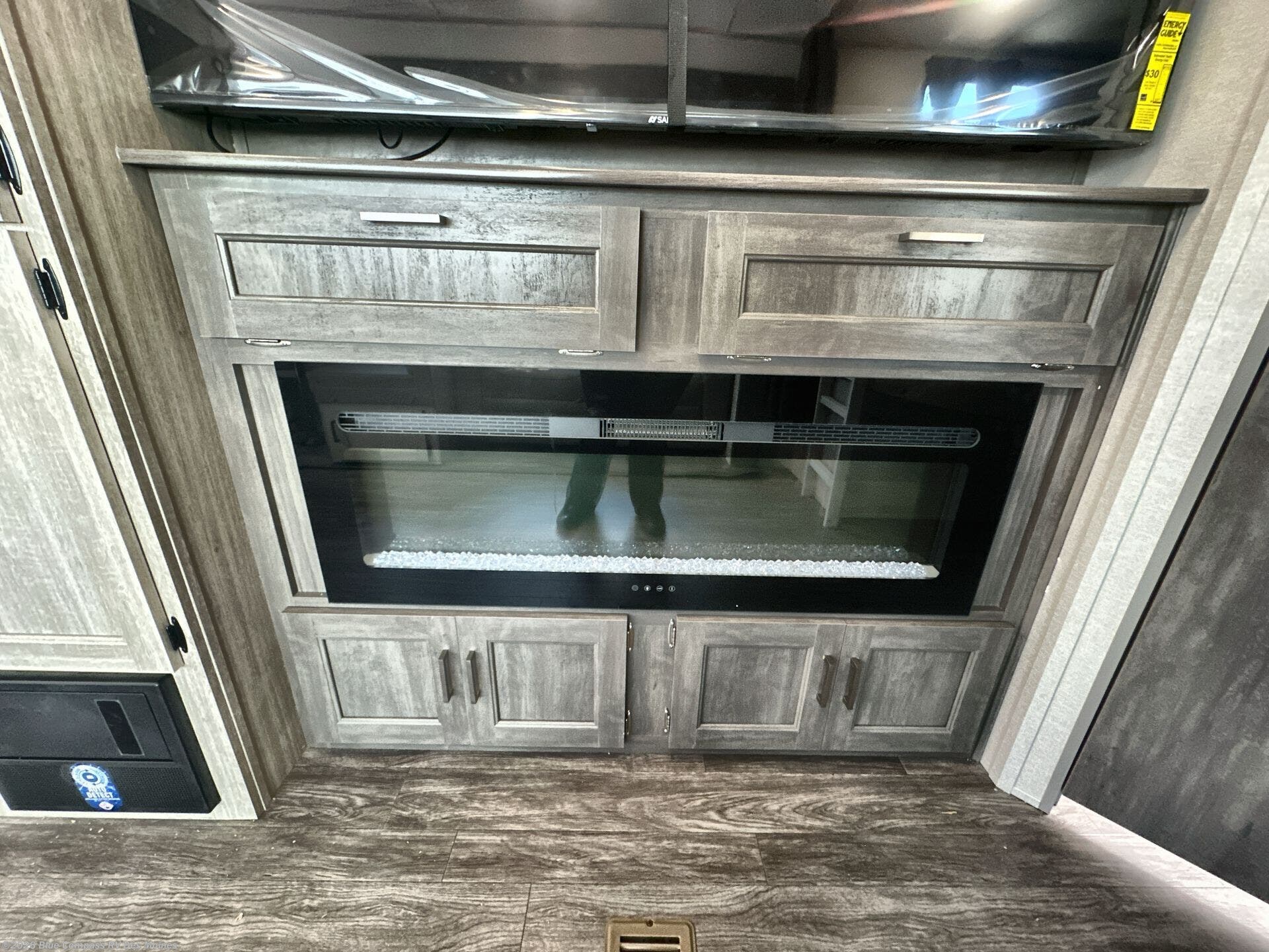 Life is easier in this travel trailer with dual entry doors! One of the entrances is right next to the front private bedroom which has a 60" x 74" queen bed with wardrobes on either side to keep your things tidy. The second entrance leads into the full bath, which also includes a full tub to make bathtime easier for little ones. The living area has everything you need for a cozy evening indoors between the 60" trundle sofa, U-shaped dinette, and entertainment center with a fireplace and 65" TV for cozy movie nights. Cook a sunrise breakfast at the outside camper kitchen with a griddle and mini refrigerator. There is also exterior storage with a fold-down table and a TV hookup if you plan to watch the big game outdoors!