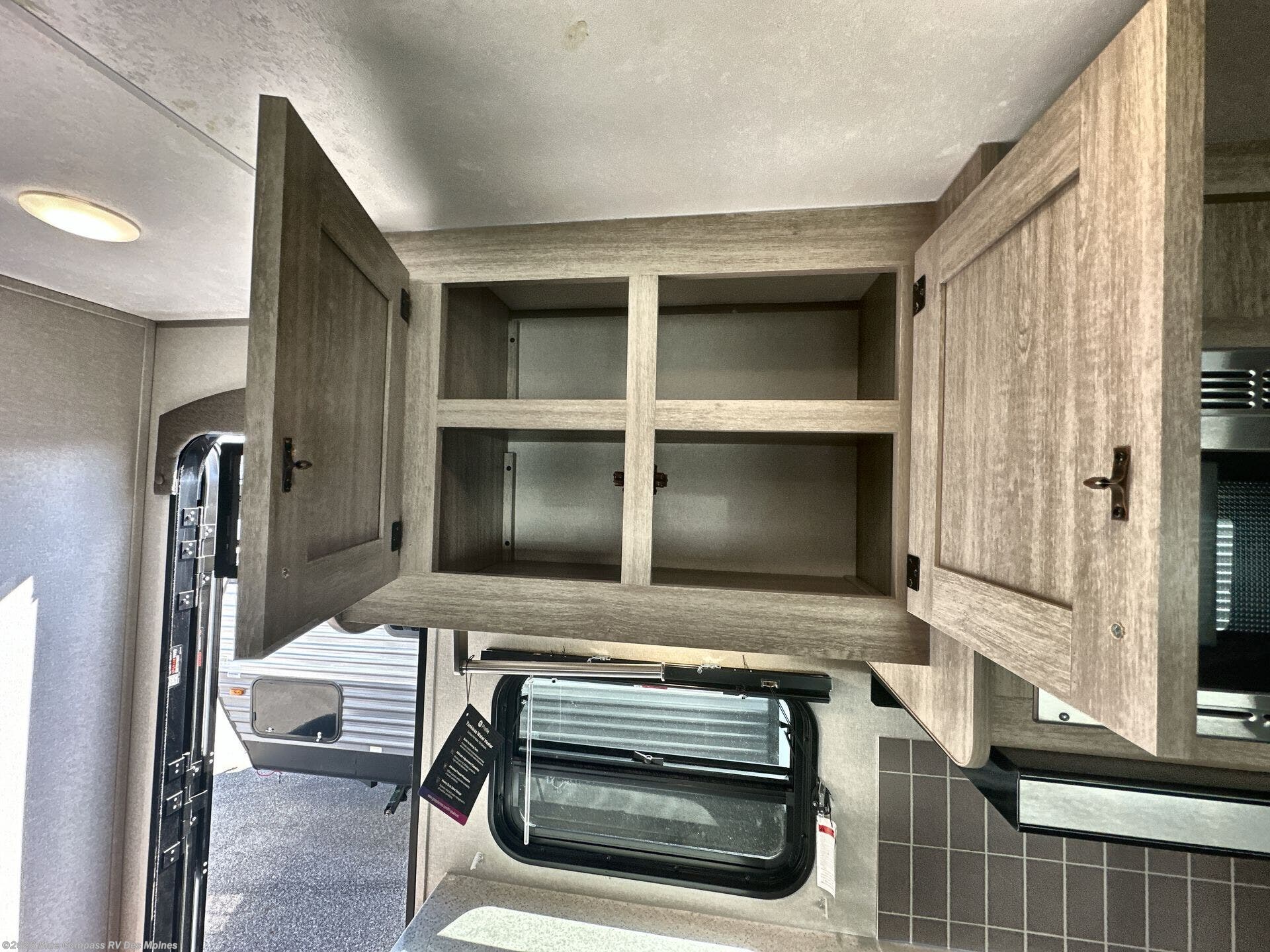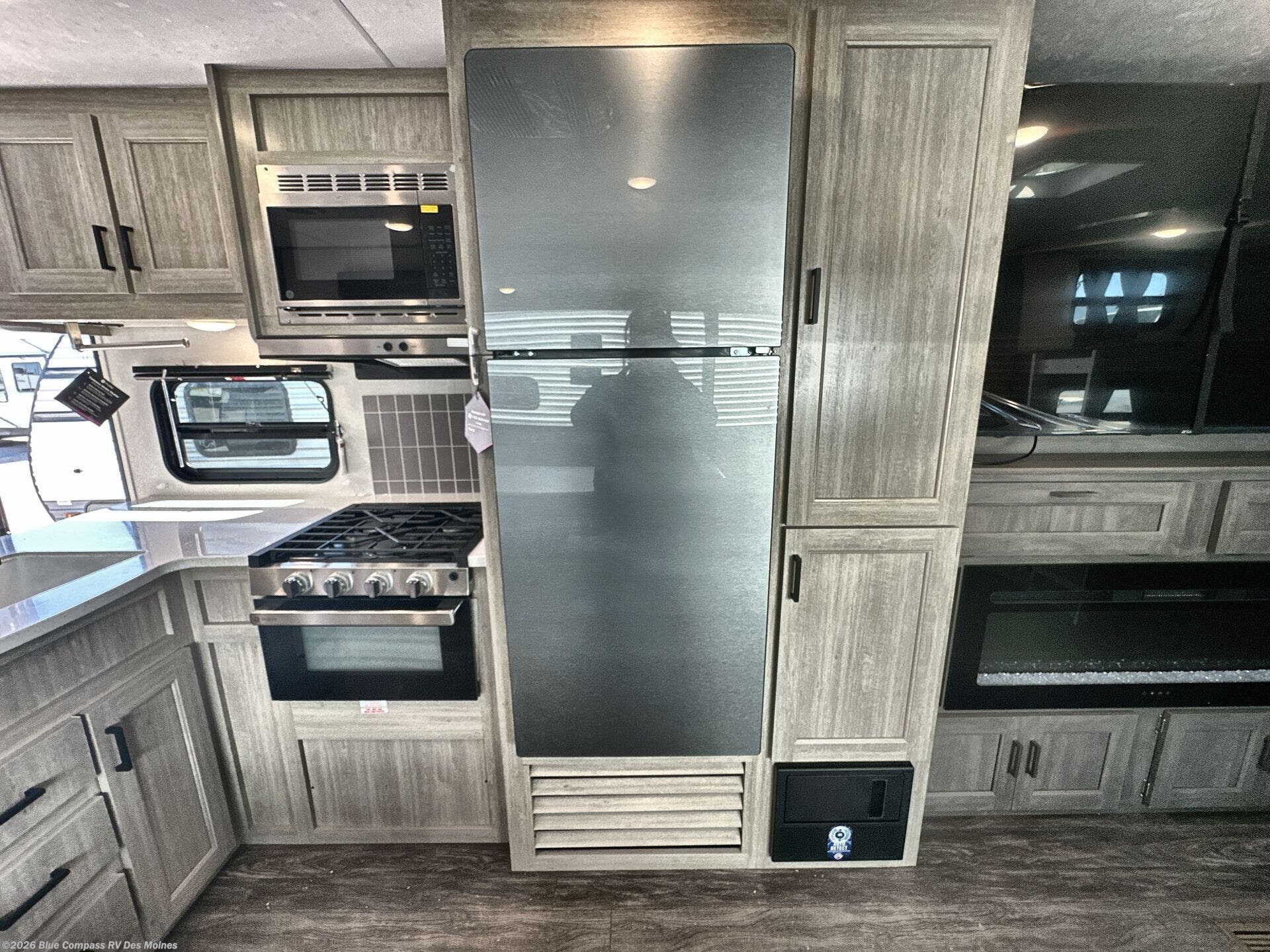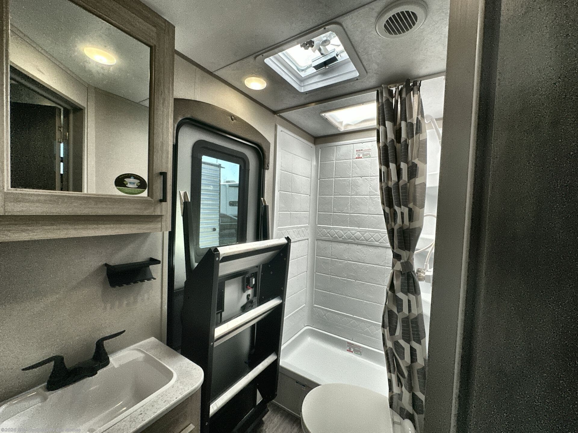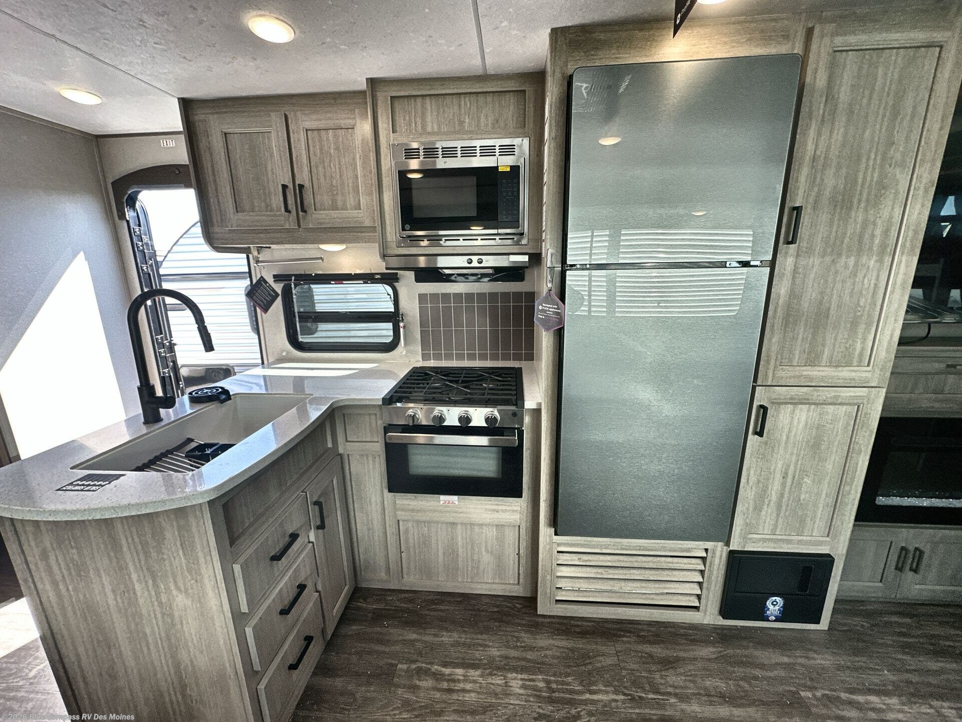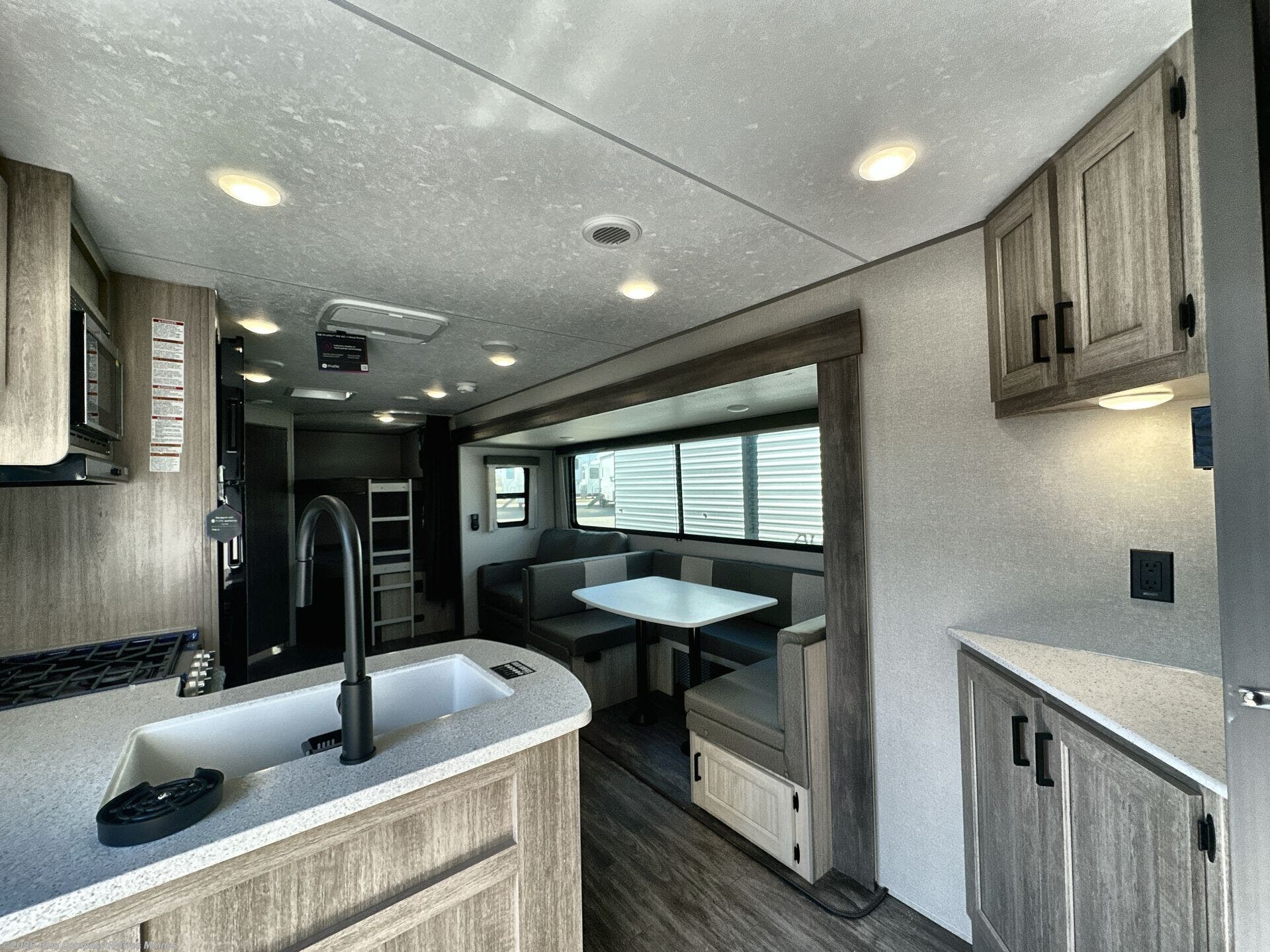 Life is easier in this travel trailer with dual entry doors! One of the entrances is right next to the front private bedroom which has a 60" x 74" queen bed with wardrobes on either side to keep your things tidy. The second entrance leads into the full bath, which also includes a full tub to make bathtime easier for little ones. The living area has everything you need for a cozy evening indoors between the 60" trundle sofa, U-shaped dinette, and entertainment center with a fireplace and 65" TV for cozy movie nights. Cook a sunrise breakfast at the outside camper kitchen with a griddle and mini refrigerator. There is also exterior storage with a fold-down table and a TV hookup if you plan to watch the big game outdoors!