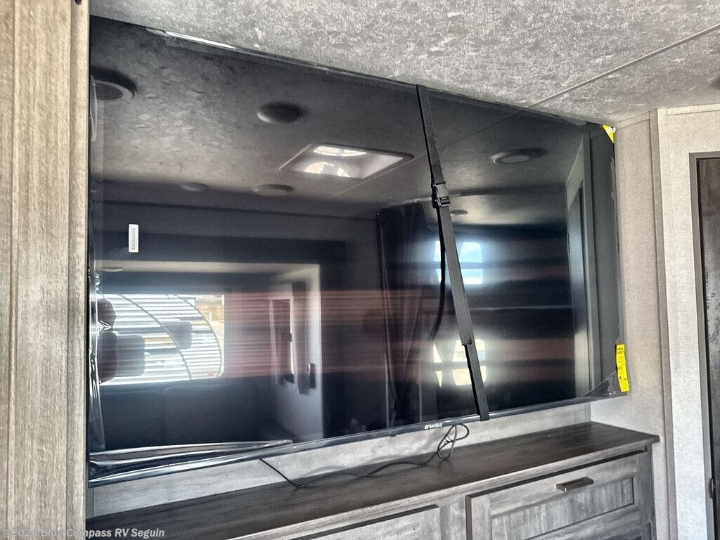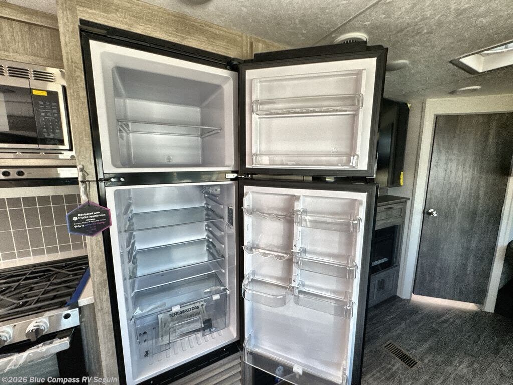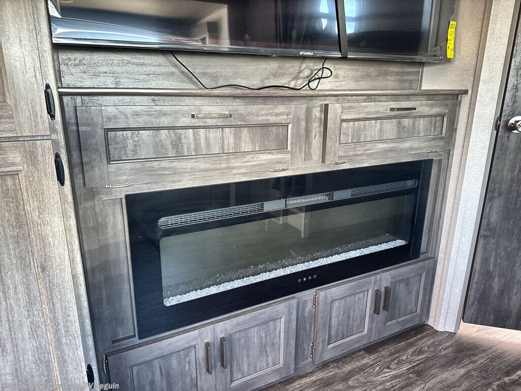 Life is easier in this travel trailer with dual entry doors! One of the entrances is right next to the front private bedroom which has a 60" x 74" queen bed with wardrobes on either side to keep your things tidy. The second entrance leads into the full bath, which also includes a full tub to make bathtime easier for little ones. The living area has everything you need for a cozy evening indoors between the 60" trundle sofa, U-shaped dinette, and entertainment center with a fireplace and 65" TV for cozy movie nights. Cook a sunrise breakfast at the outside camper kitchen with a griddle and mini refrigerator. There is also exterior storage with a fold-down table and a TV hookup if you plan to watch the big game outdoors!