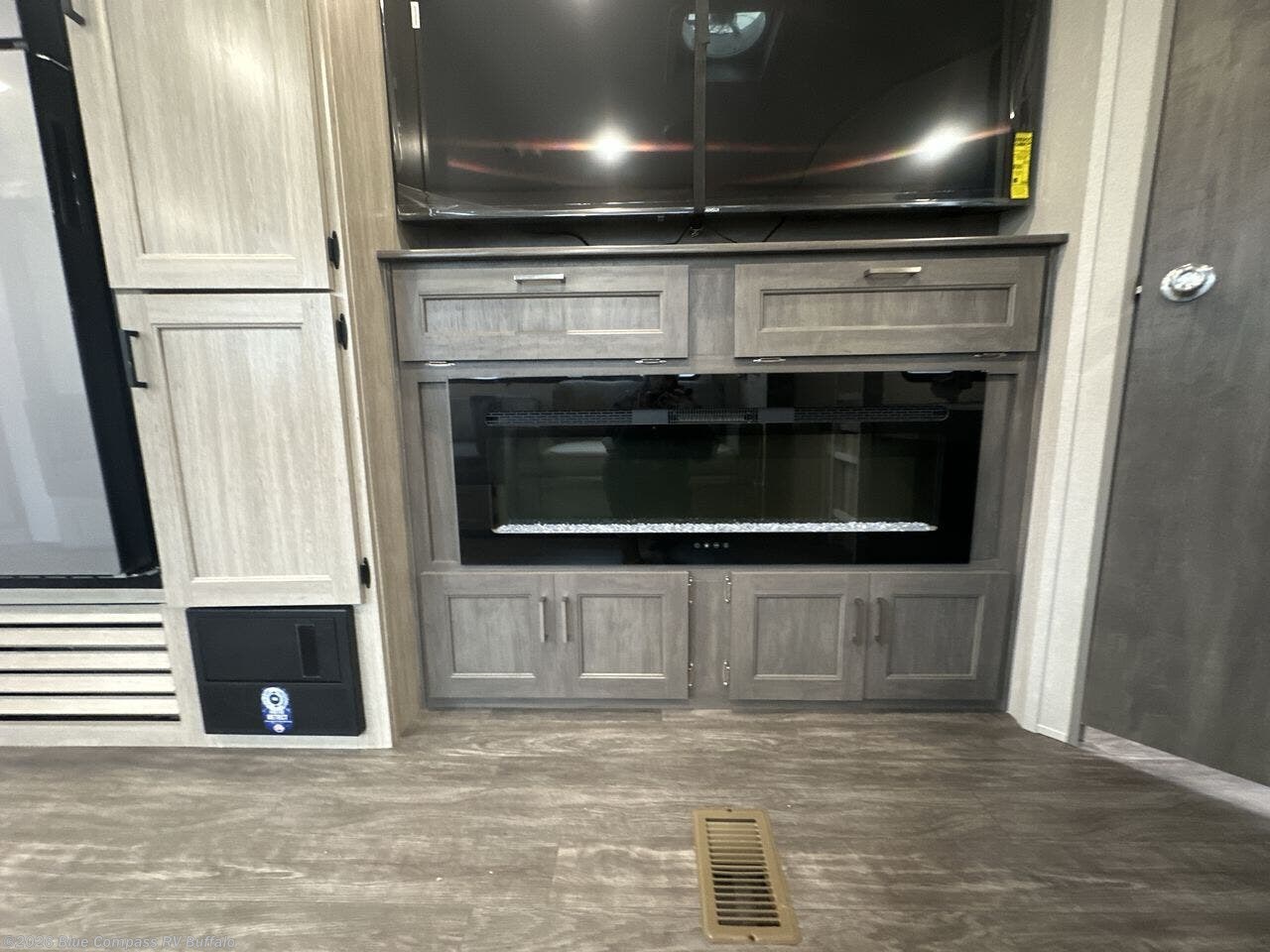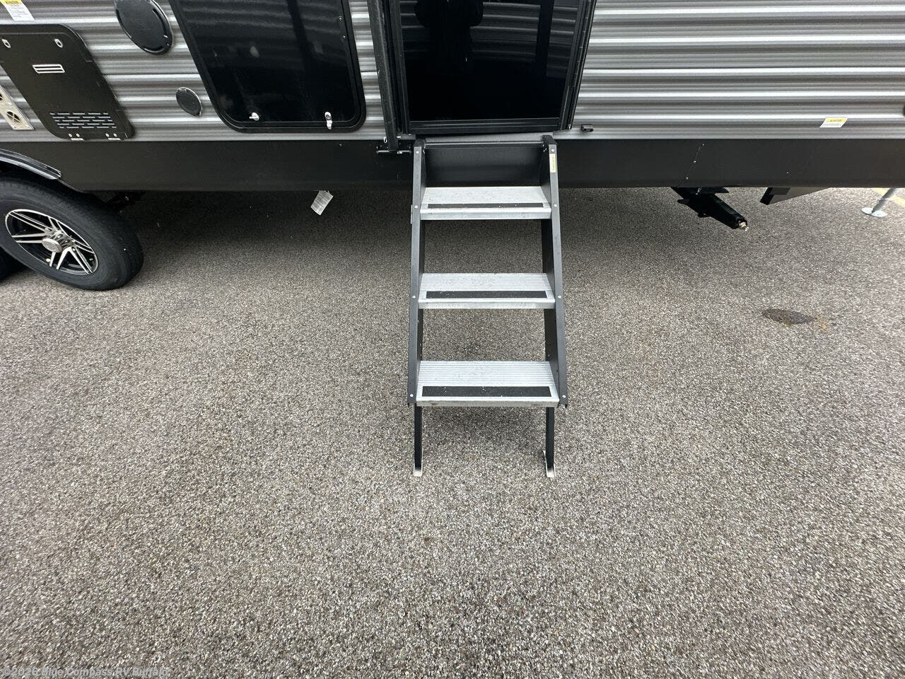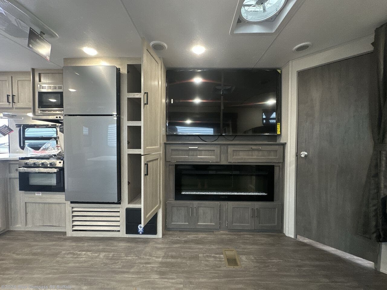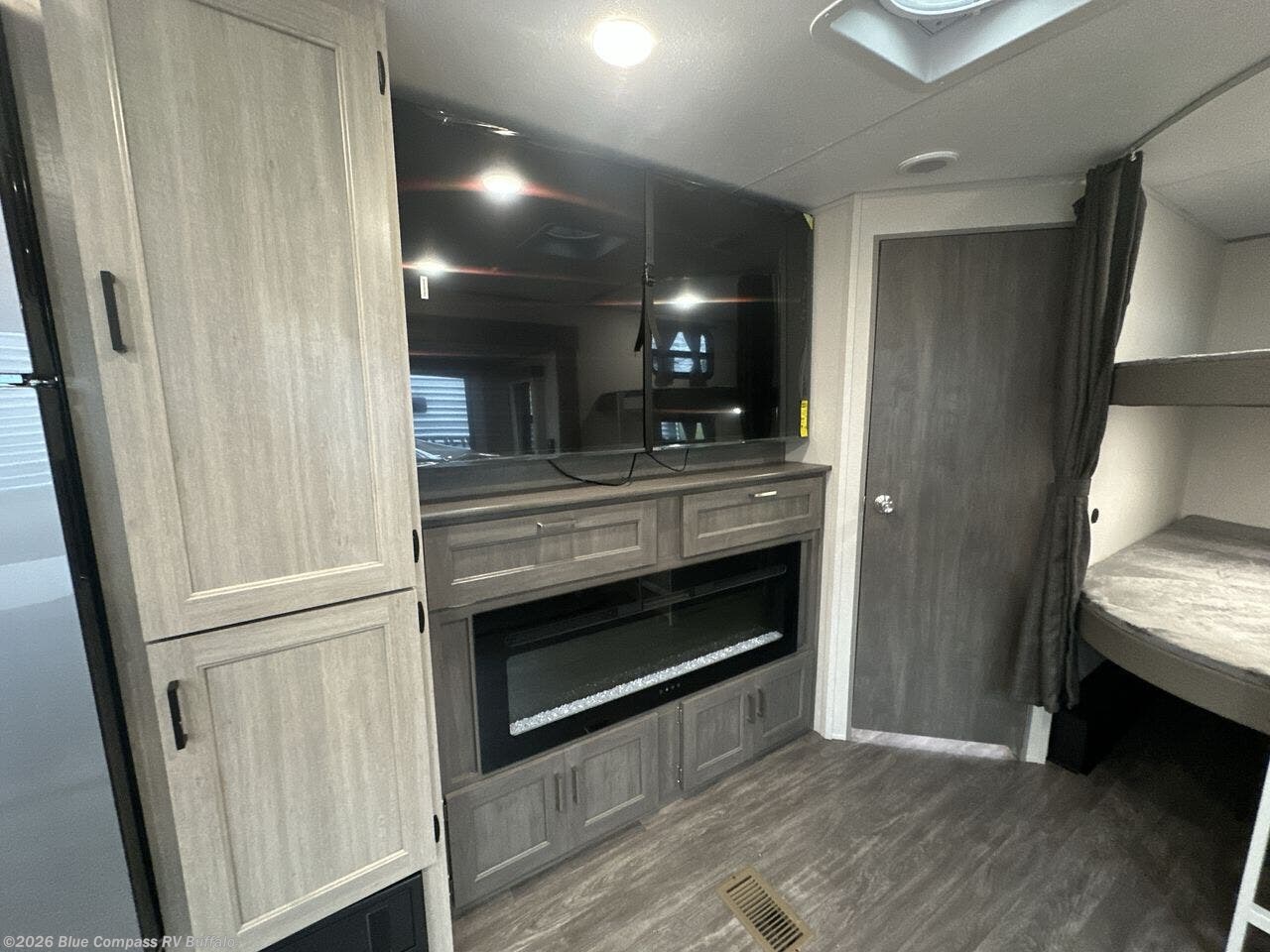 Life is easier in this travel trailer with dual entry doors! One of the entrances is right next to the front private bedroom which has a 60" x 74" queen bed with wardrobes on either side to keep your things tidy. The second entrance leads into the full bath, which also includes a full tub to make bathtime easier for little ones. The living area has everything you need for a cozy evening indoors between the 60" trundle sofa, U-shaped dinette, and entertainment center with a fireplace and 65" TV for cozy movie nights. Cook a sunrise breakfast at the outside camper kitchen with a griddle and mini refrigerator. There is also exterior storage with a fold-down table and a TV hookup if you plan to watch the big game outdoors!