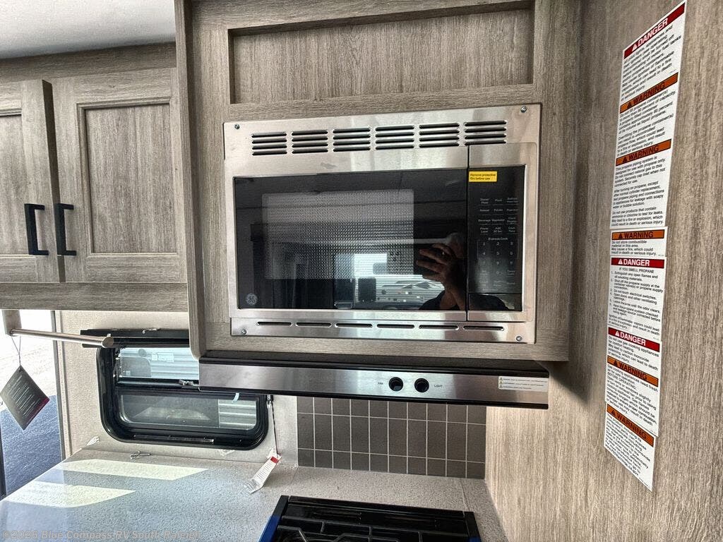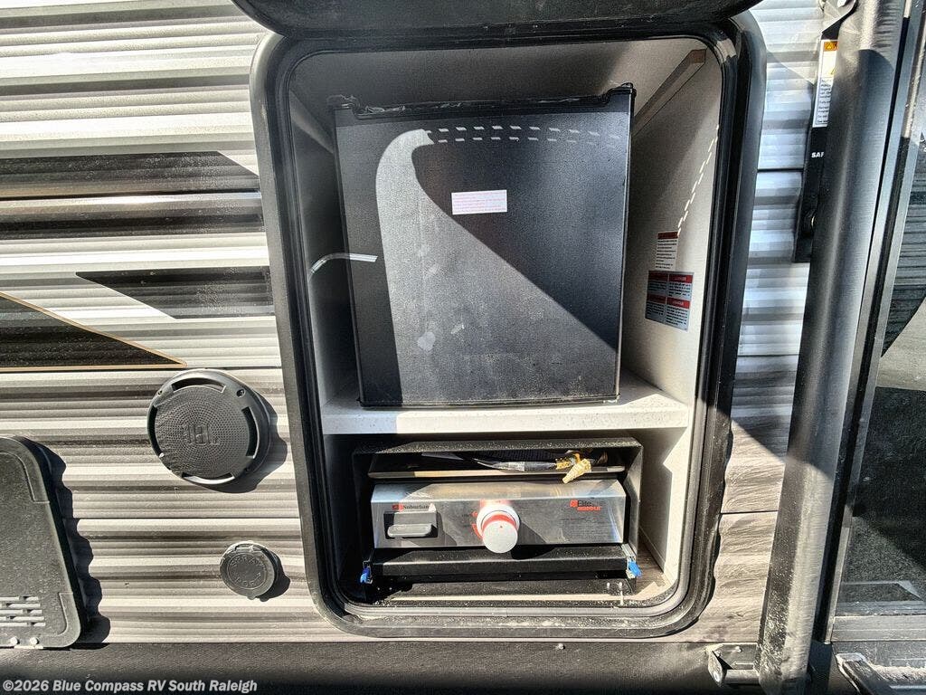 Life is easier in this travel trailer with dual entry doors! One of the entrances is right next to the front private bedroom which has a 60" x 74" queen bed with wardrobes on either side to keep your things tidy. The second entrance leads into the full bath, which also includes a full tub to make bathtime easier for little ones. The living area has everything you need for a cozy evening indoors between the 60" trundle sofa, U-shaped dinette, and entertainment center with a fireplace and 65" TV for cozy movie nights. Cook a sunrise breakfast at the outside camper kitchen with a griddle and mini refrigerator. There is also exterior storage with a fold-down table and a TV hookup if you plan to watch the big game outdoors!