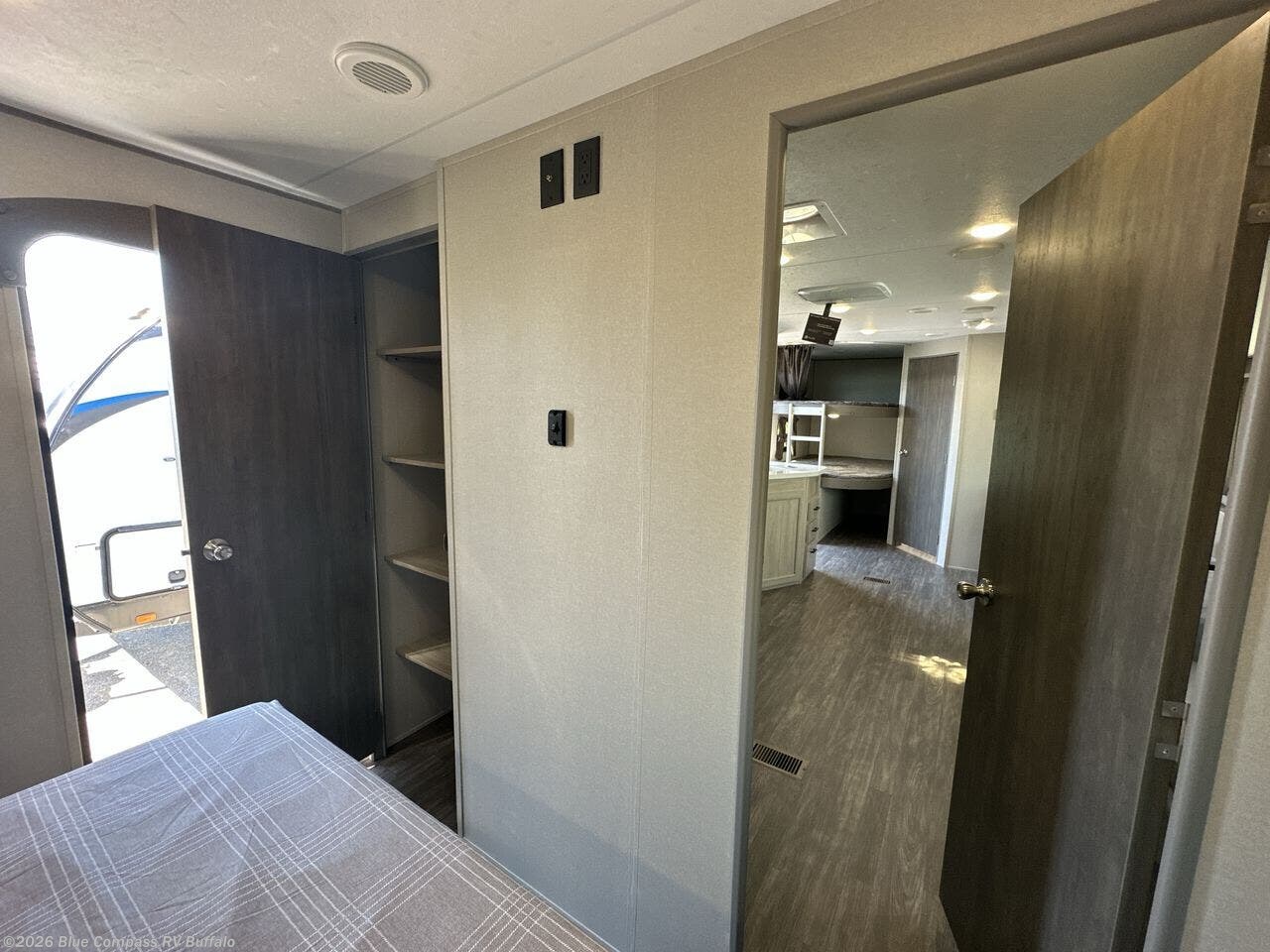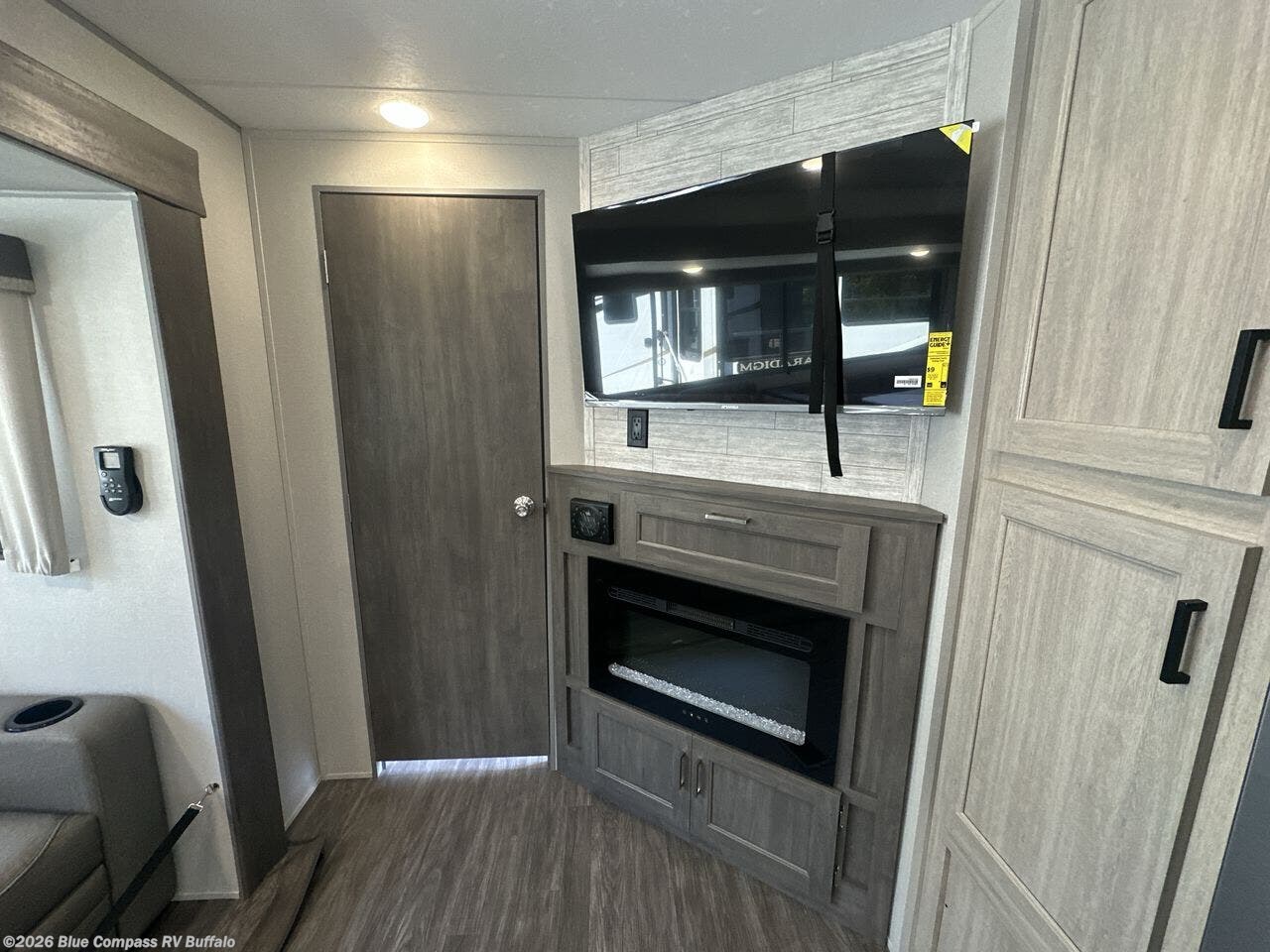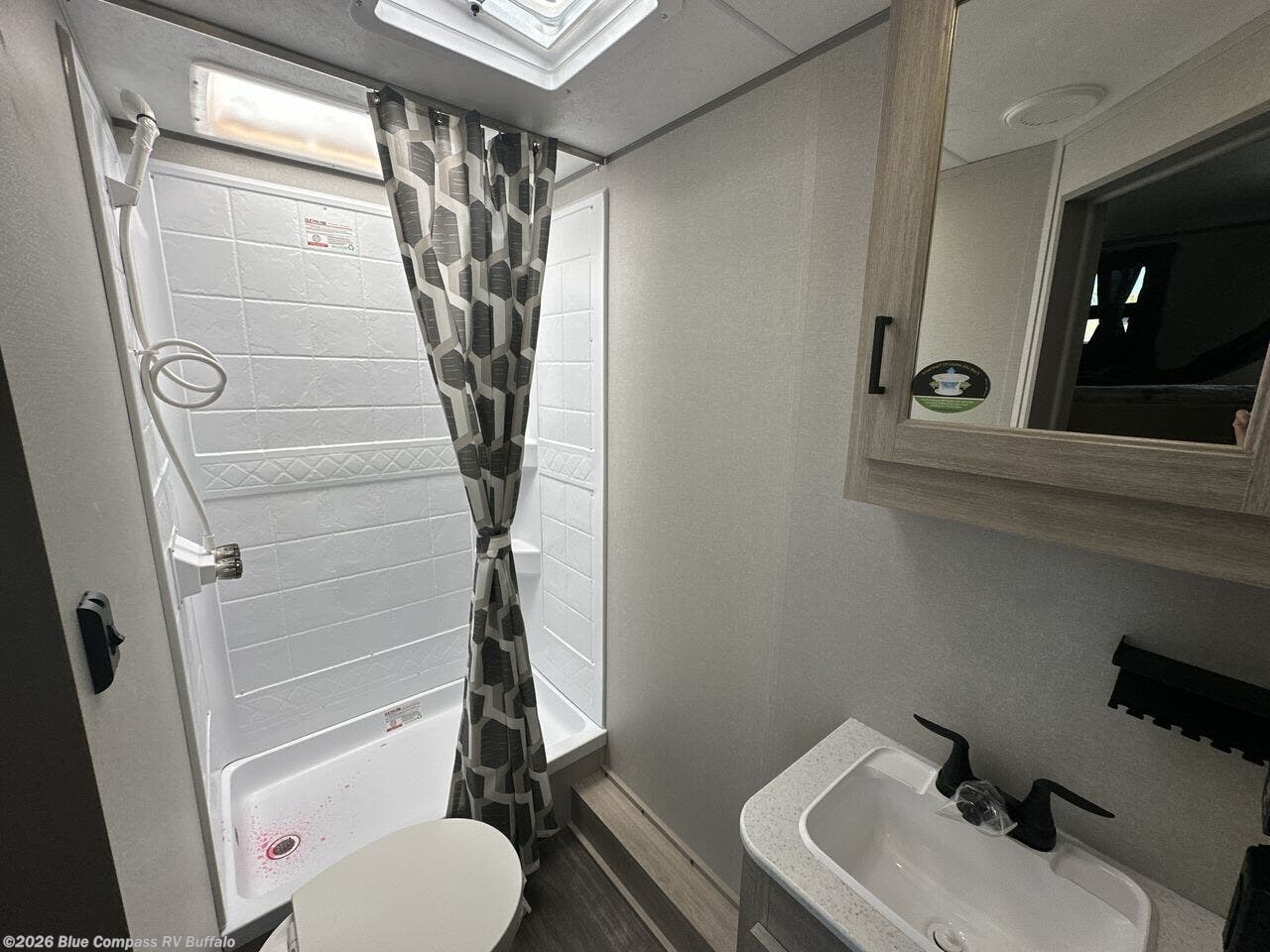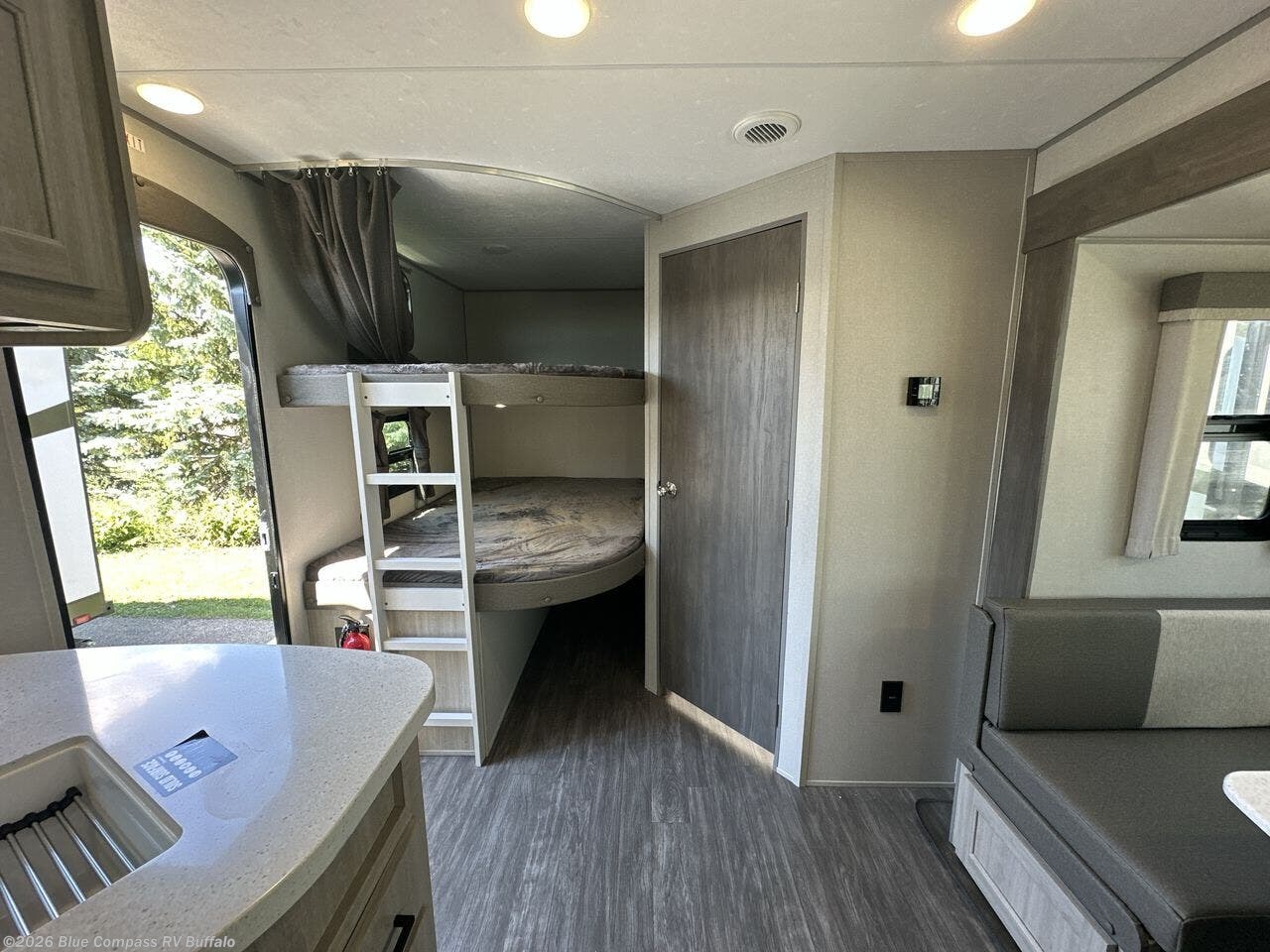 Life is easier in this travel trailer with dual entry doors! One of the entrances leads directly into the front private bedroom which has a 60" x 74" queen bed with wardrobes on either side to hang your clothes and a coat closet. The second entrance is right by the double-size bunks and rear corner bathroom that has a tub/shower with skylight above for a shower with a view when you look up. The living area has everything you need for a cozy evening indoors between the 68" sofa with an arm rest/cupholder to set your drink while you enjoy the optional fireplace at the entertainment center or you can play a few card games at the U-shaped dinette. Cook a sunrise breakfast at the outside camper kitchen with the pull out griddle, a cabinet for storage, and a refrigerator for cold orange juice!