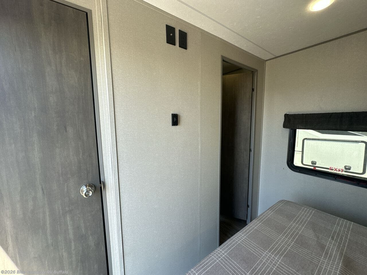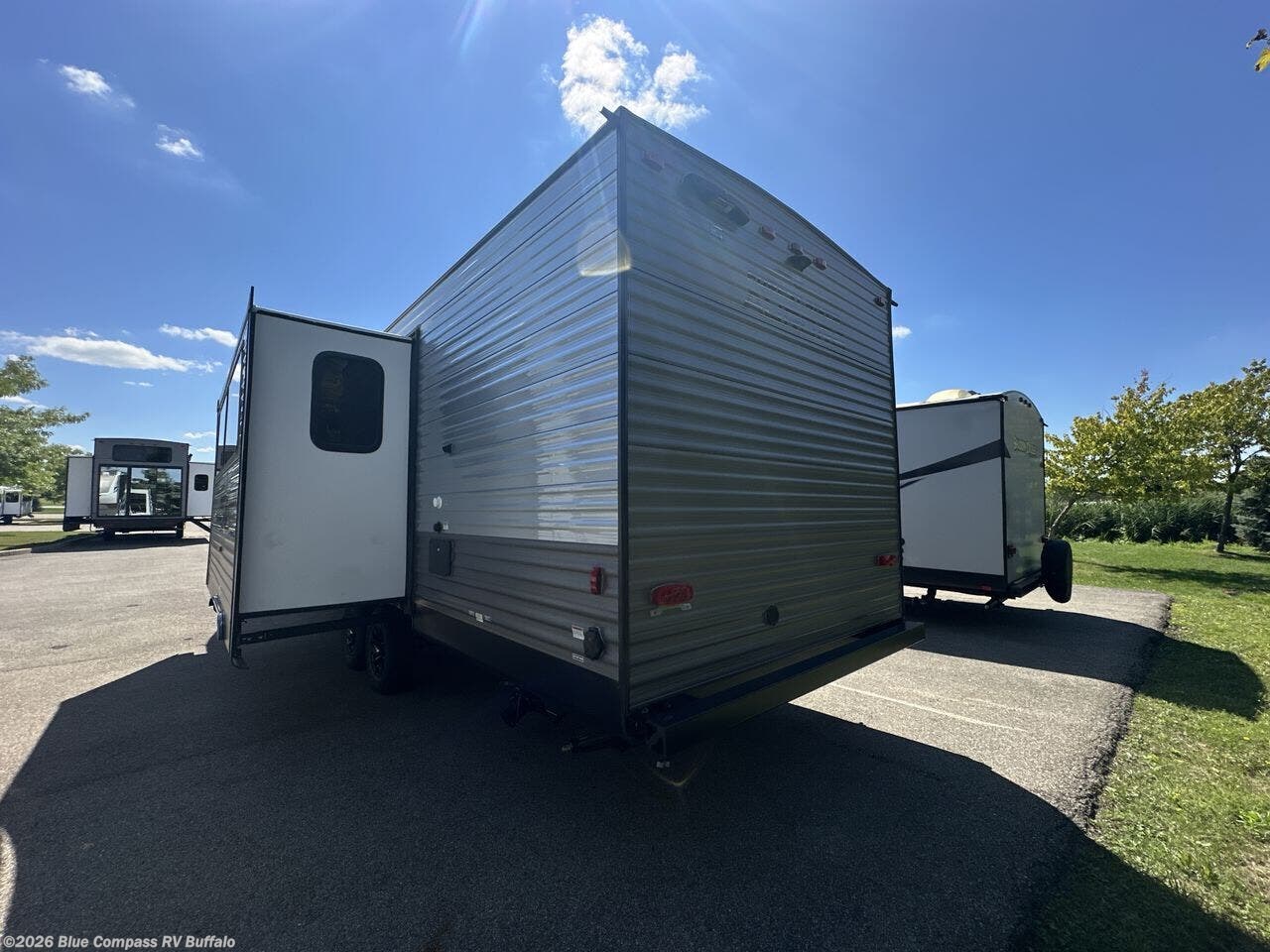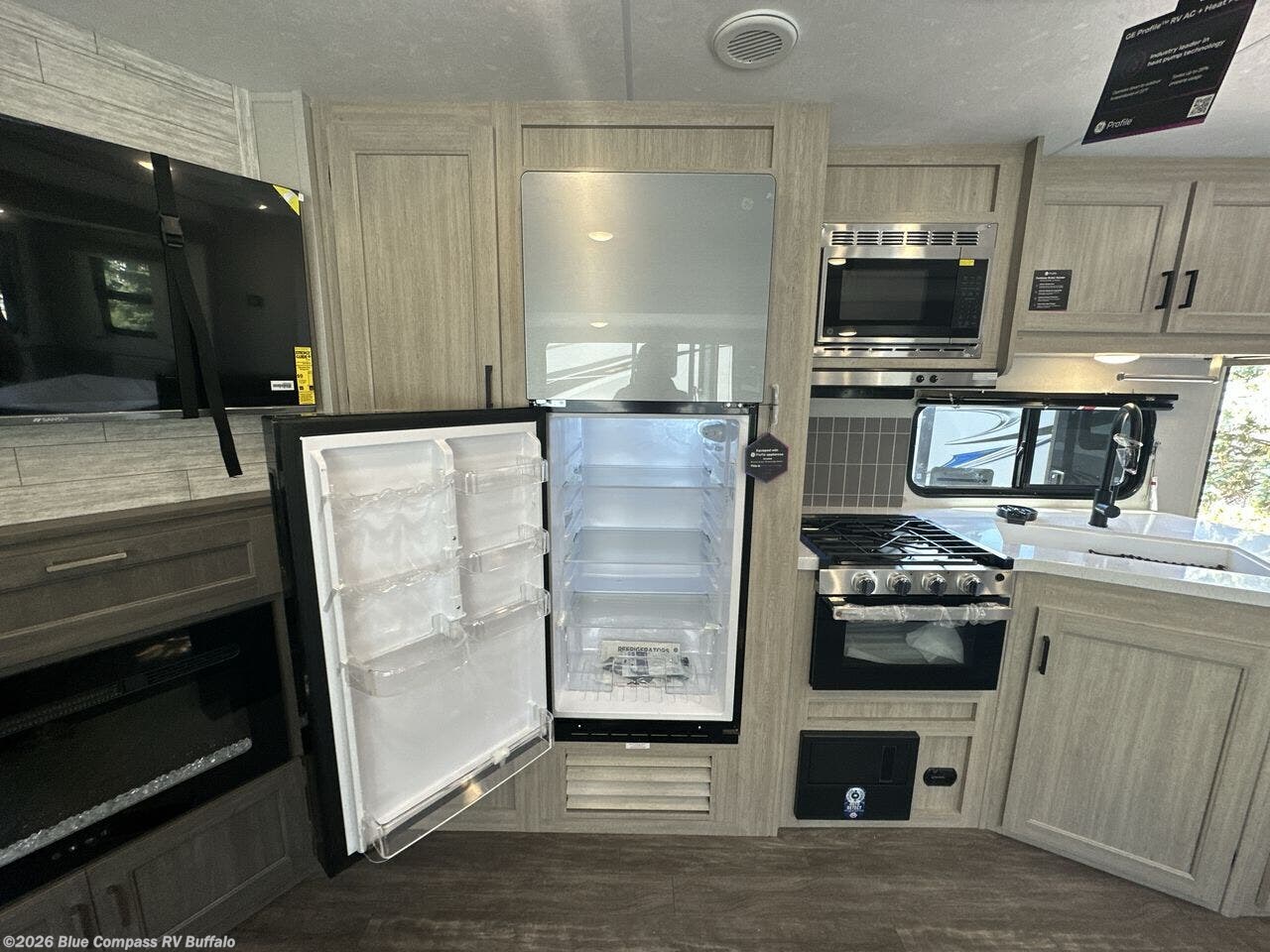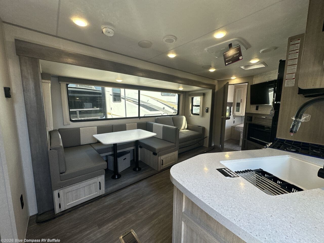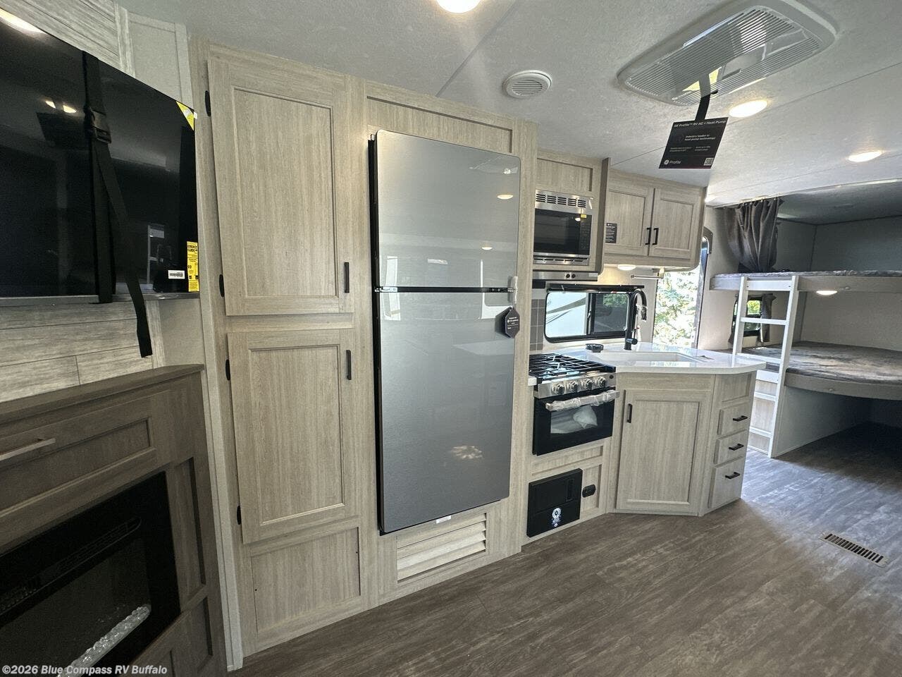 Life is easier in this travel trailer with dual entry doors! One of the entrances leads directly into the front private bedroom which has a 60" x 74" queen bed with wardrobes on either side to hang your clothes and a coat closet. The second entrance is right by the double-size bunks and rear corner bathroom that has a tub/shower with skylight above for a shower with a view when you look up. The living area has everything you need for a cozy evening indoors between the 68" sofa with an arm rest/cupholder to set your drink while you enjoy the optional fireplace at the entertainment center or you can play a few card games at the U-shaped dinette. Cook a sunrise breakfast at the outside camper kitchen with the pull out griddle, a cabinet for storage, and a refrigerator for cold orange juice!