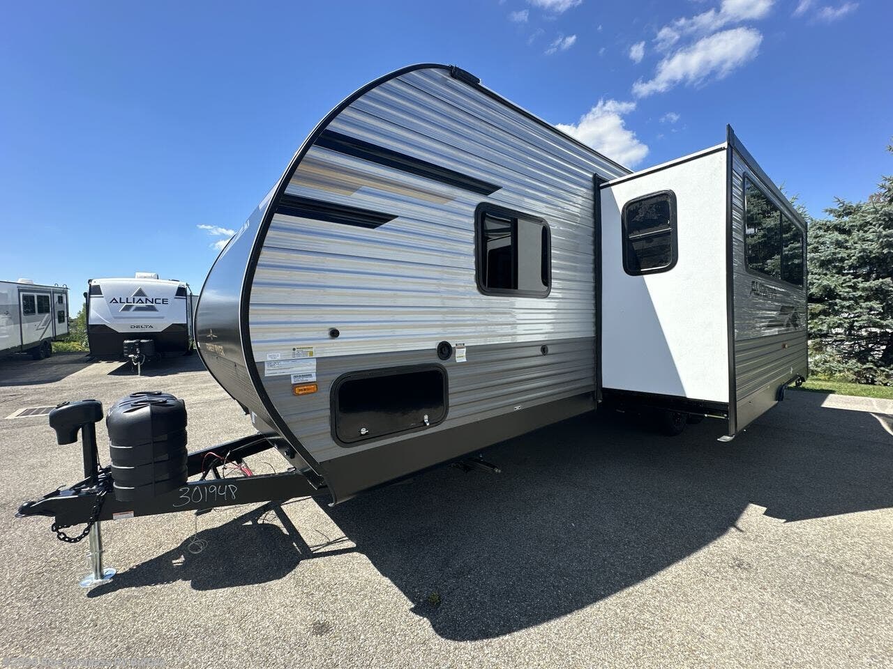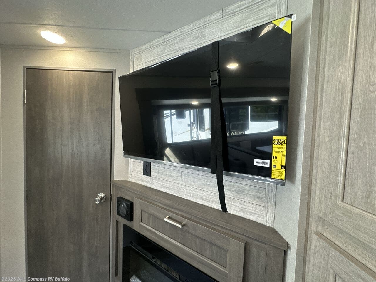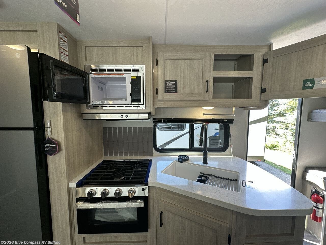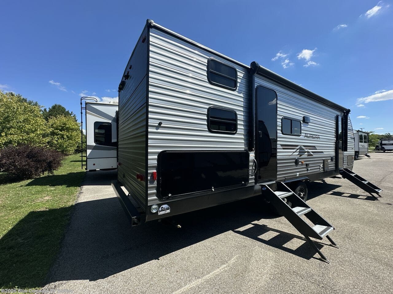 Life is easier in this travel trailer with dual entry doors! One of the entrances leads directly into the front private bedroom which has a 60" x 74" queen bed with wardrobes on either side to hang your clothes and a coat closet. The second entrance is right by the double-size bunks and rear corner bathroom that has a tub/shower with skylight above for a shower with a view when you look up. The living area has everything you need for a cozy evening indoors between the 68" sofa with an arm rest/cupholder to set your drink while you enjoy the optional fireplace at the entertainment center or you can play a few card games at the U-shaped dinette. Cook a sunrise breakfast at the outside camper kitchen with the pull out griddle, a cabinet for storage, and a refrigerator for cold orange juice!