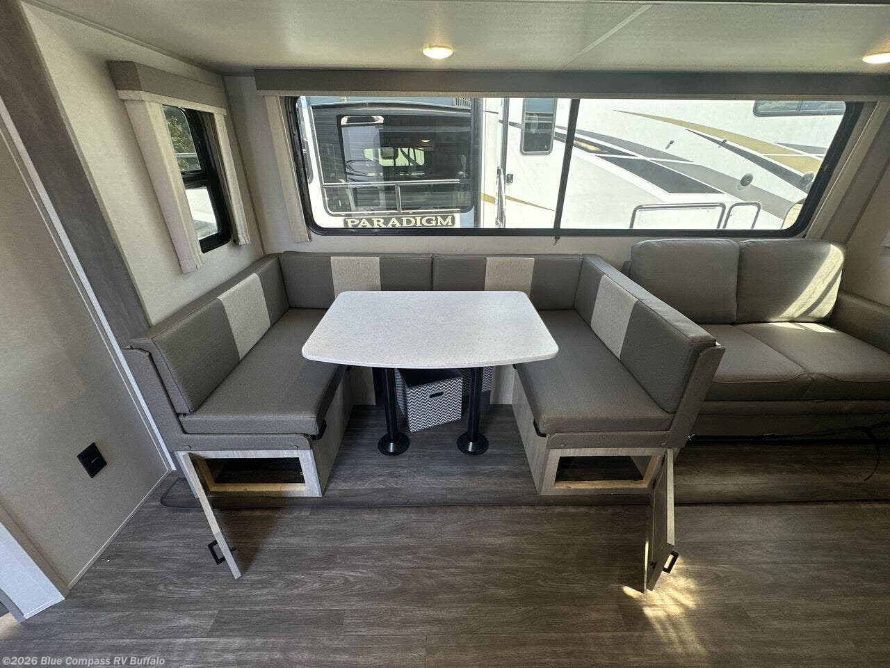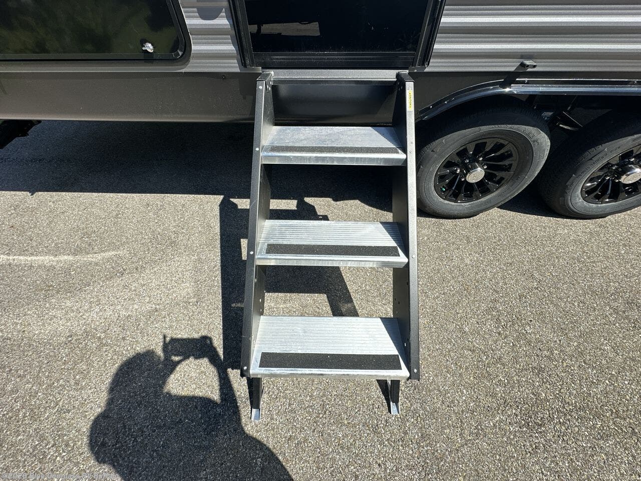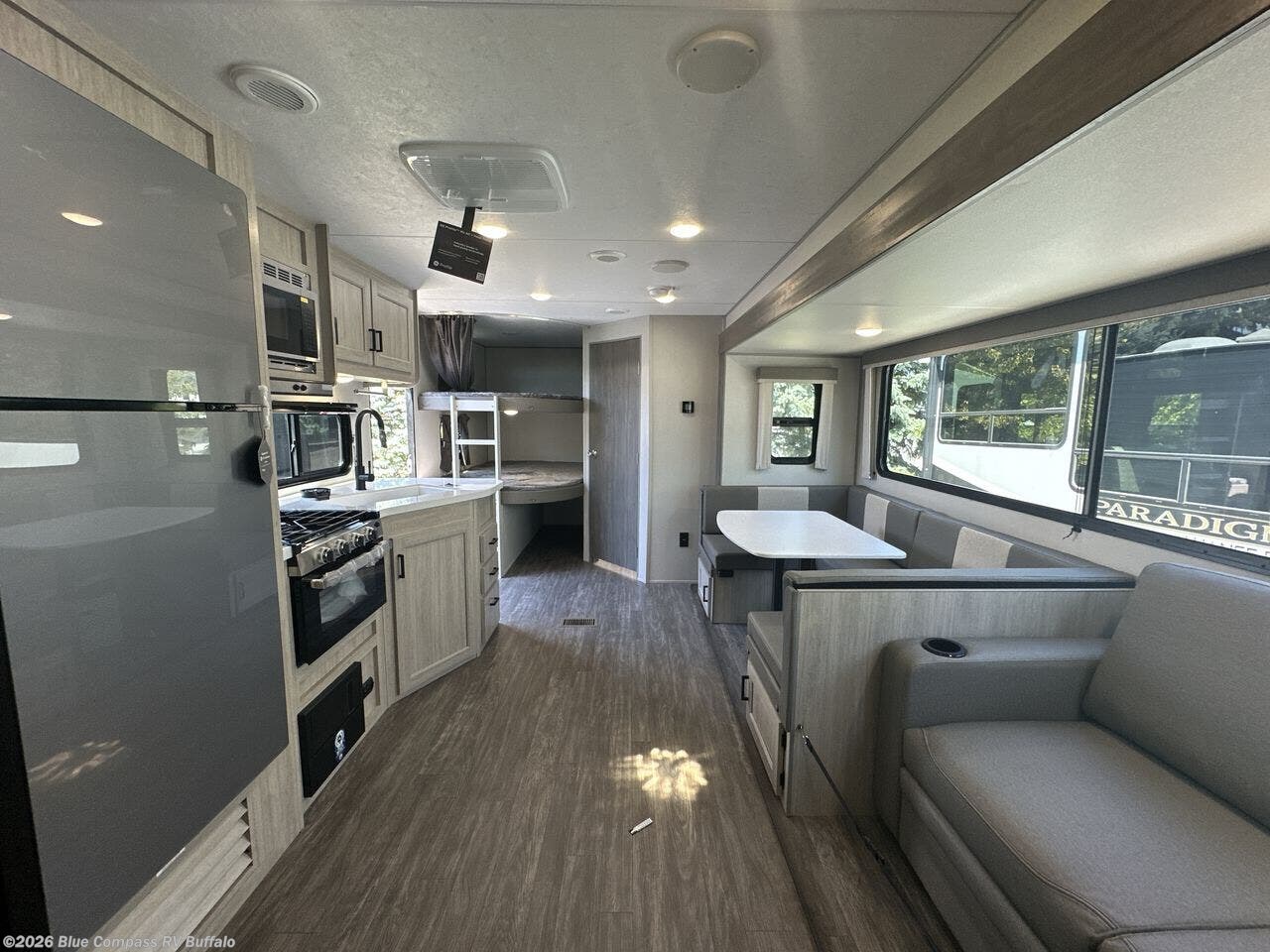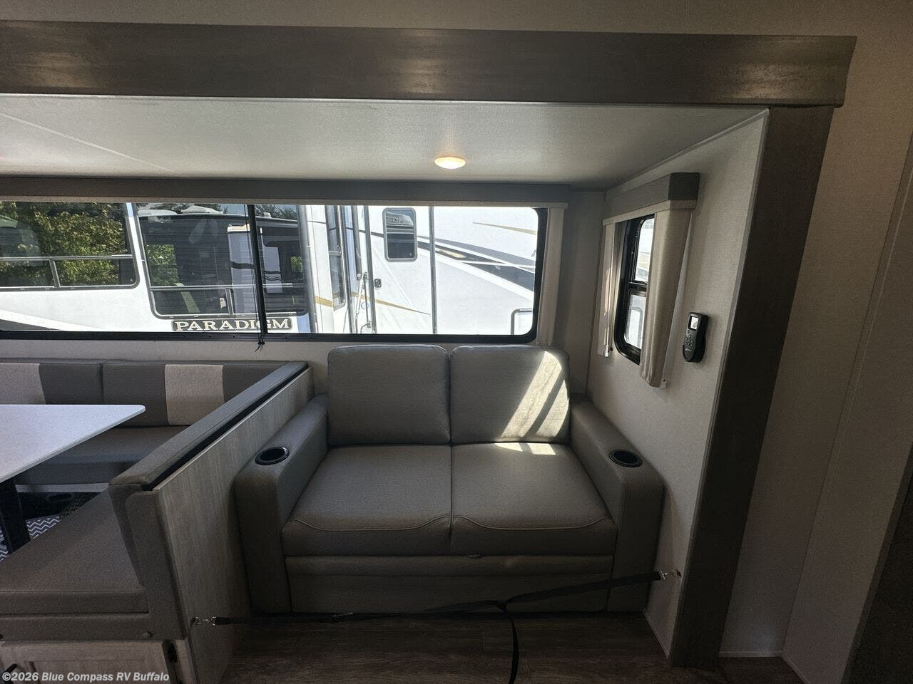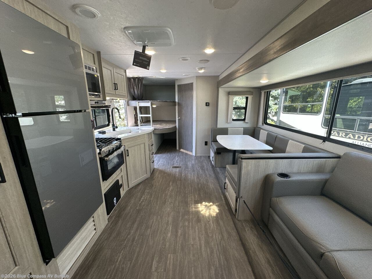 Life is easier in this travel trailer with dual entry doors! One of the entrances leads directly into the front private bedroom which has a 60" x 74" queen bed with wardrobes on either side to hang your clothes and a coat closet. The second entrance is right by the double-size bunks and rear corner bathroom that has a tub/shower with skylight above for a shower with a view when you look up. The living area has everything you need for a cozy evening indoors between the 68" sofa with an arm rest/cupholder to set your drink while you enjoy the optional fireplace at the entertainment center or you can play a few card games at the U-shaped dinette. Cook a sunrise breakfast at the outside camper kitchen with the pull out griddle, a cabinet for storage, and a refrigerator for cold orange juice!