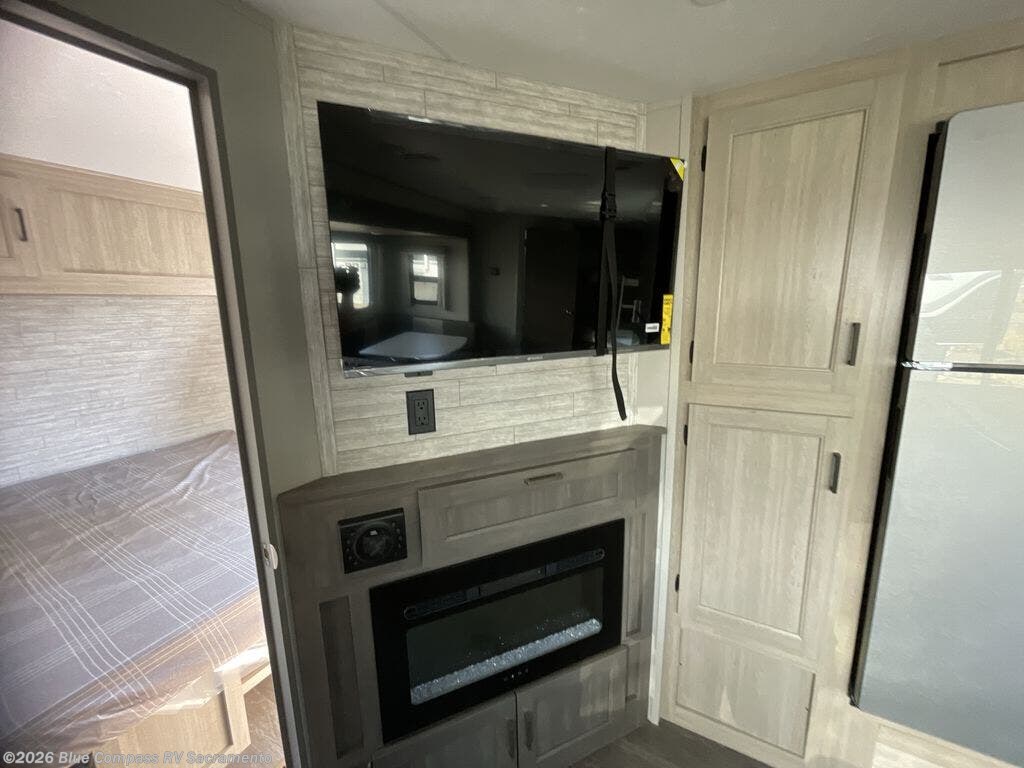 Life is easier in this travel trailer with dual entry doors! One of the entrances leads directly into the front private bedroom which has a 60" x 74" queen bed with wardrobes on either side to hang your clothes and a coat closet. The second entrance is right by the double-size bunks and rear corner bathroom that has a tub/shower with skylight above for a shower with a view when you look up. The living area has everything you need for a cozy evening indoors between the 68" sofa with an arm rest/cupholder to set your drink while you enjoy the optional fireplace at the entertainment center or you can play a few card games at the U-shaped dinette. Cook a sunrise breakfast at the outside camper kitchen with the pull out griddle, a cabinet for storage, and a refrigerator for cold orange juice!