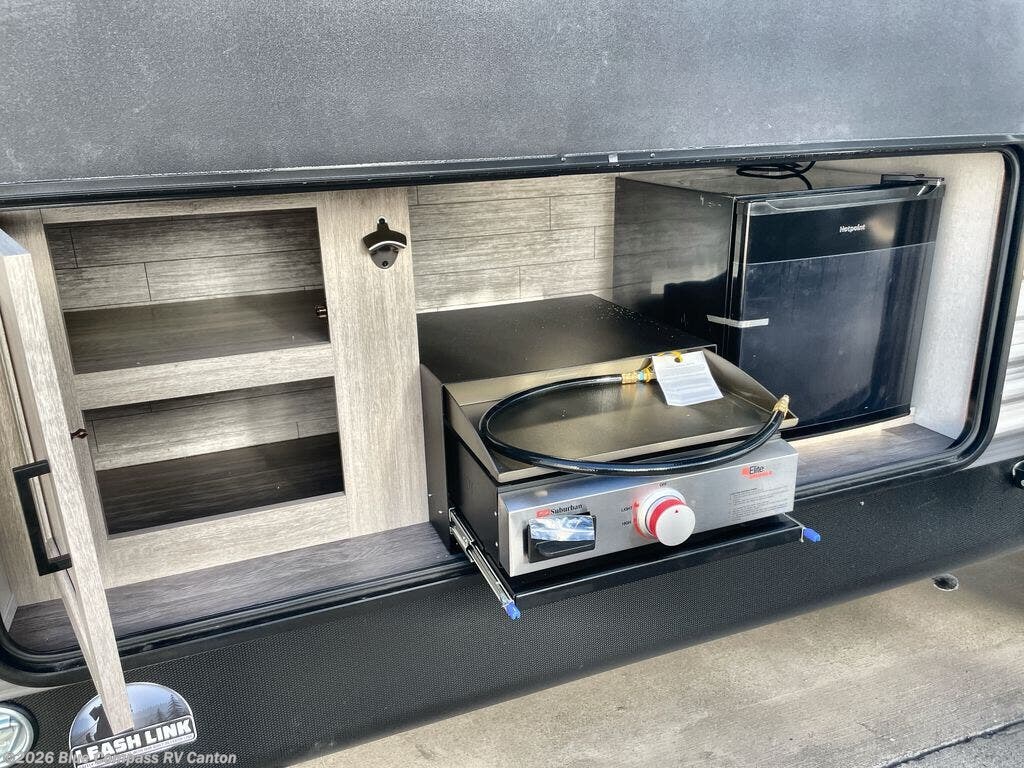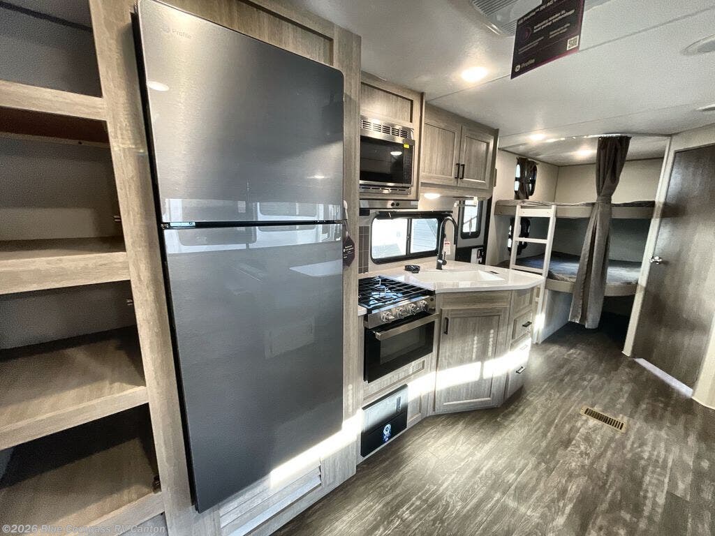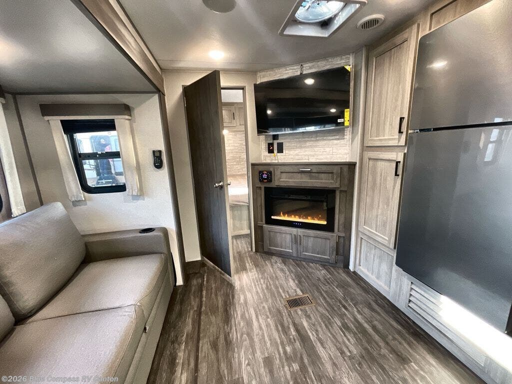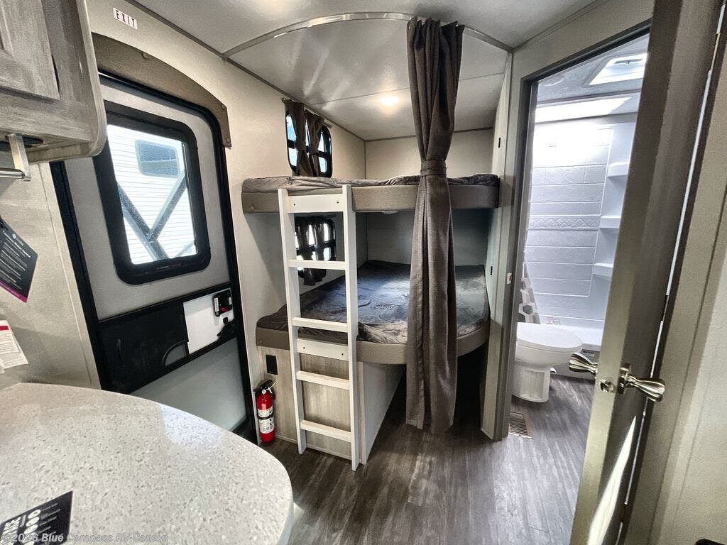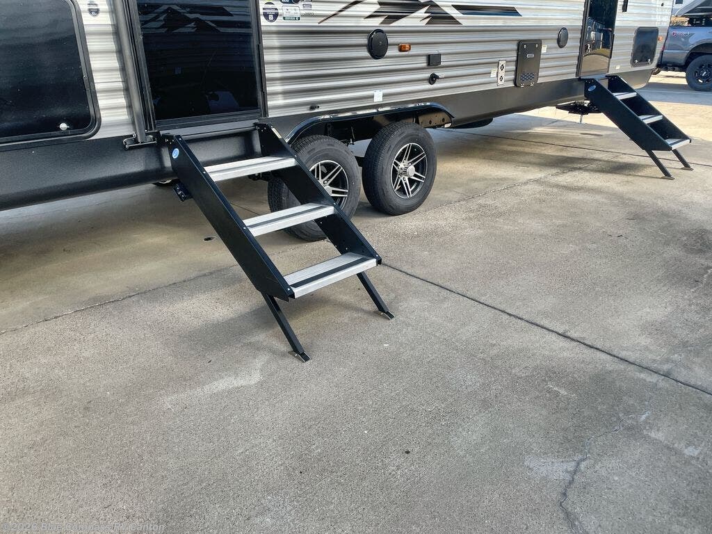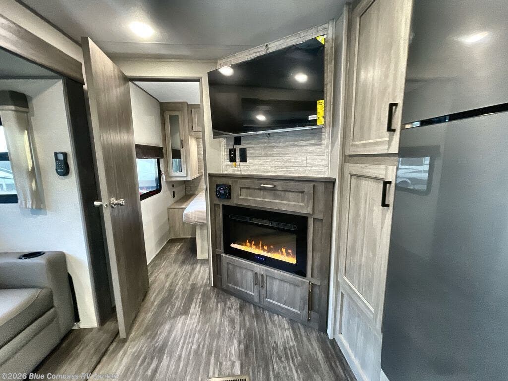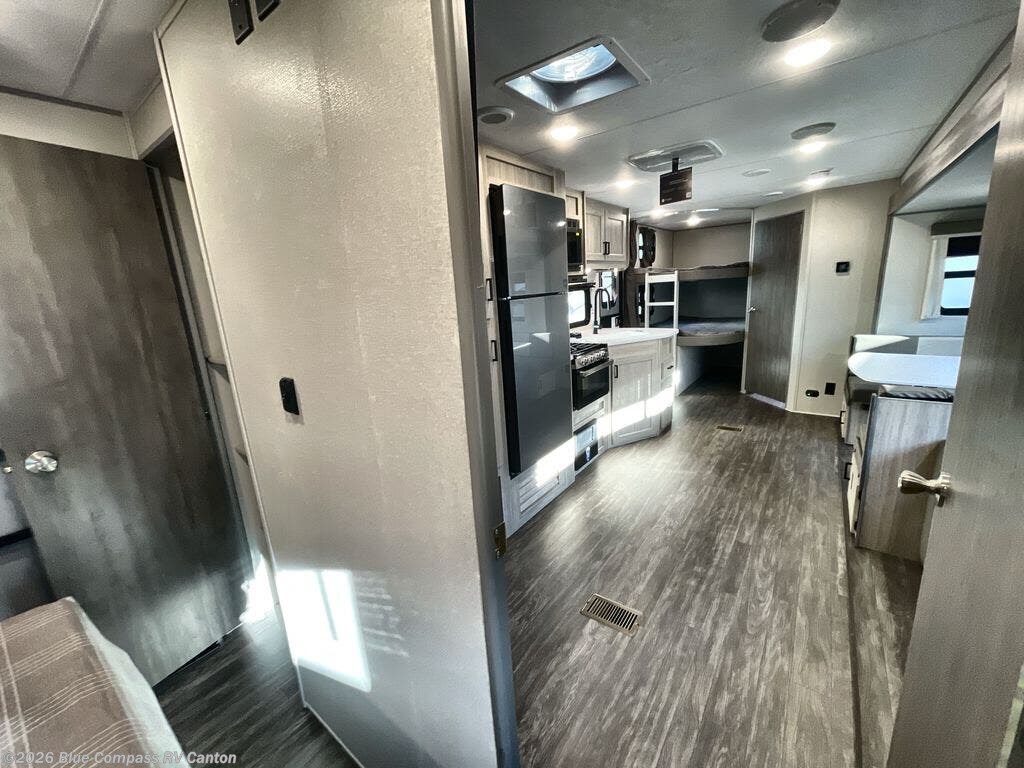 Life is easier in this travel trailer with dual entry doors! One of the entrances leads directly into the front private bedroom which has a 60" x 74" queen bed with wardrobes on either side to hang your clothes and a coat closet. The second entrance is right by the double-size bunks and rear corner bathroom that has a tub/shower with skylight above for a shower with a view when you look up. The living area has everything you need for a cozy evening indoors between the 68" sofa with an arm rest/cupholder to set your drink while you enjoy the optional fireplace at the entertainment center or you can play a few card games at the U-shaped dinette. Cook a sunrise breakfast at the outside camper kitchen with the pull out griddle, a cabinet for storage, and a refrigerator for cold orange juice!