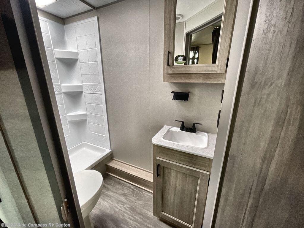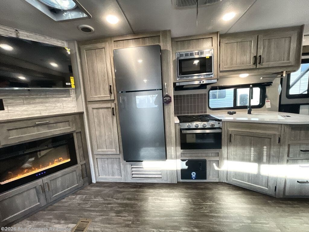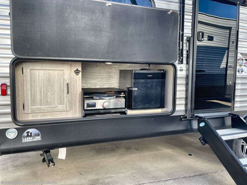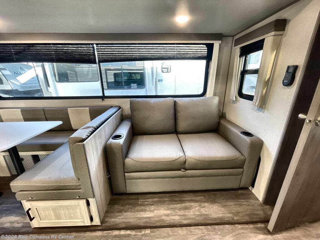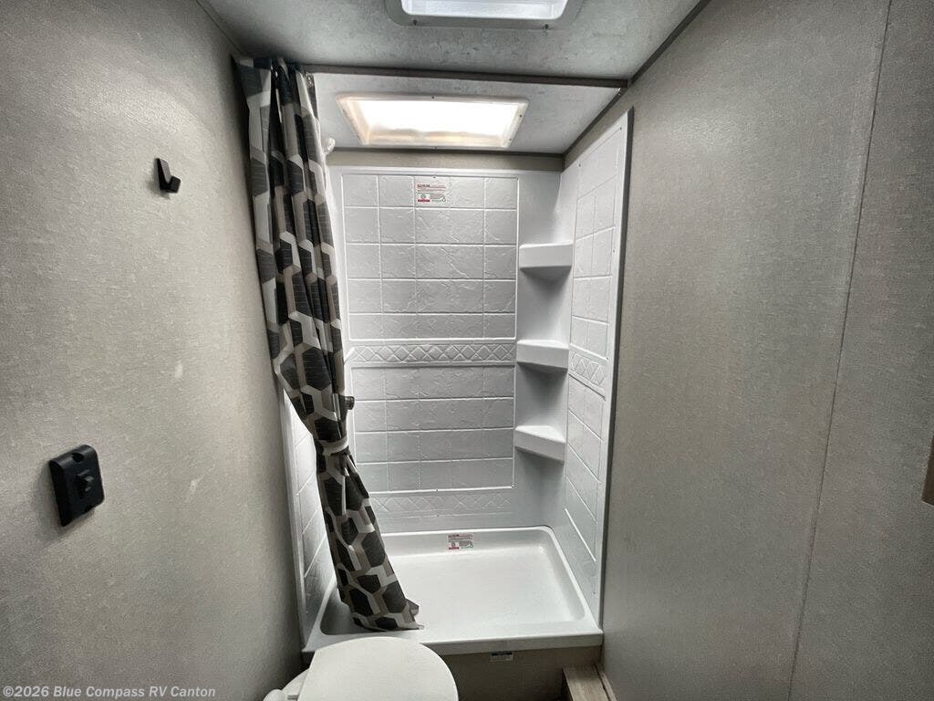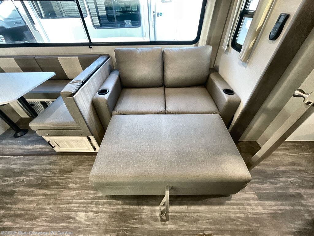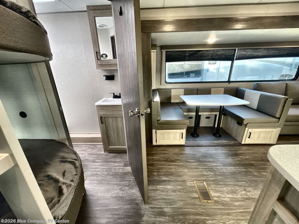 Life is easier in this travel trailer with dual entry doors! One of the entrances leads directly into the front private bedroom which has a 60" x 74" queen bed with wardrobes on either side to hang your clothes and a coat closet. The second entrance is right by the double-size bunks and rear corner bathroom that has a tub/shower with skylight above for a shower with a view when you look up. The living area has everything you need for a cozy evening indoors between the 68" sofa with an arm rest/cupholder to set your drink while you enjoy the optional fireplace at the entertainment center or you can play a few card games at the U-shaped dinette. Cook a sunrise breakfast at the outside camper kitchen with the pull out griddle, a cabinet for storage, and a refrigerator for cold orange juice!
