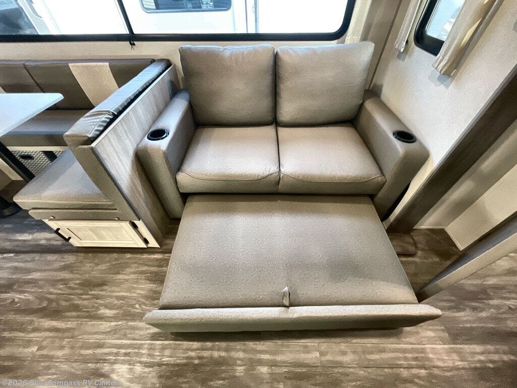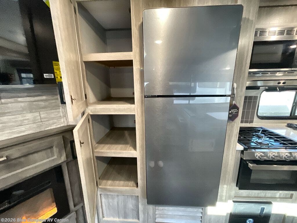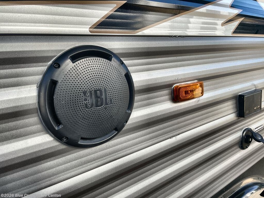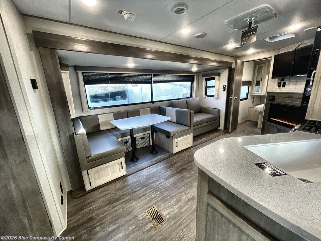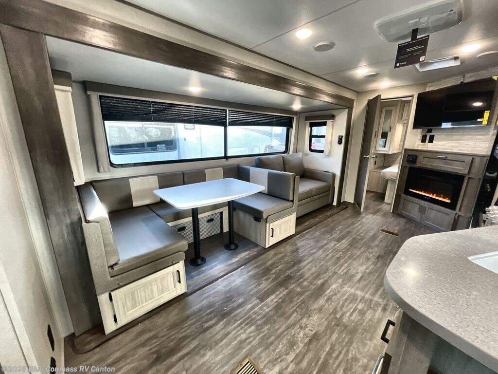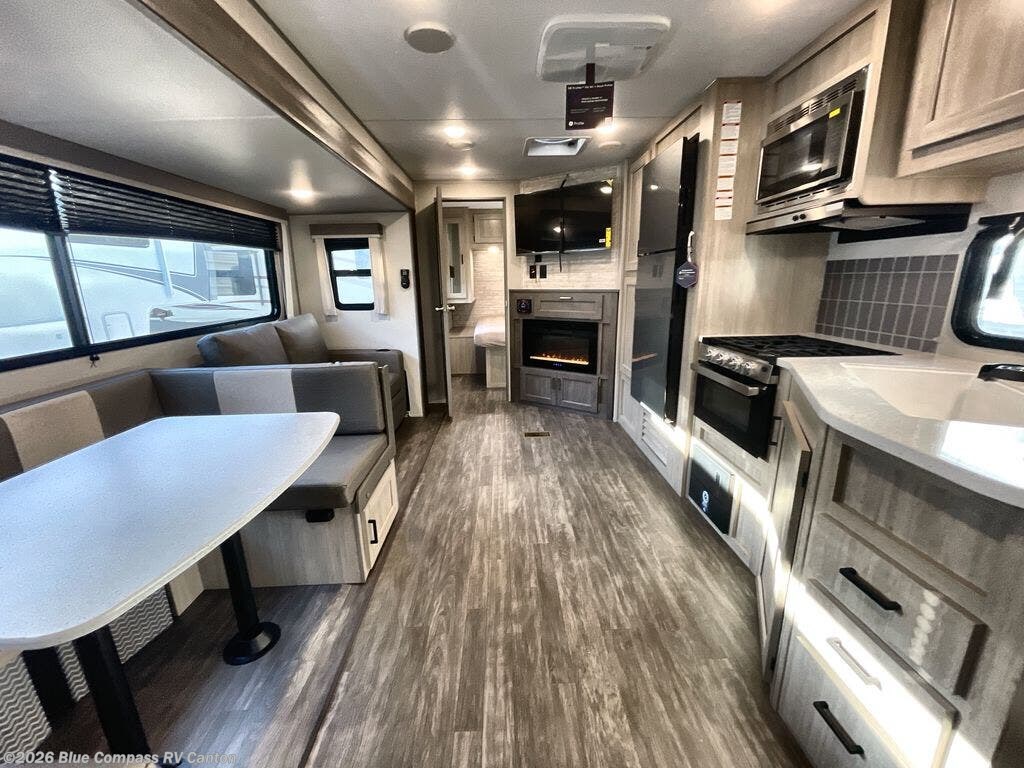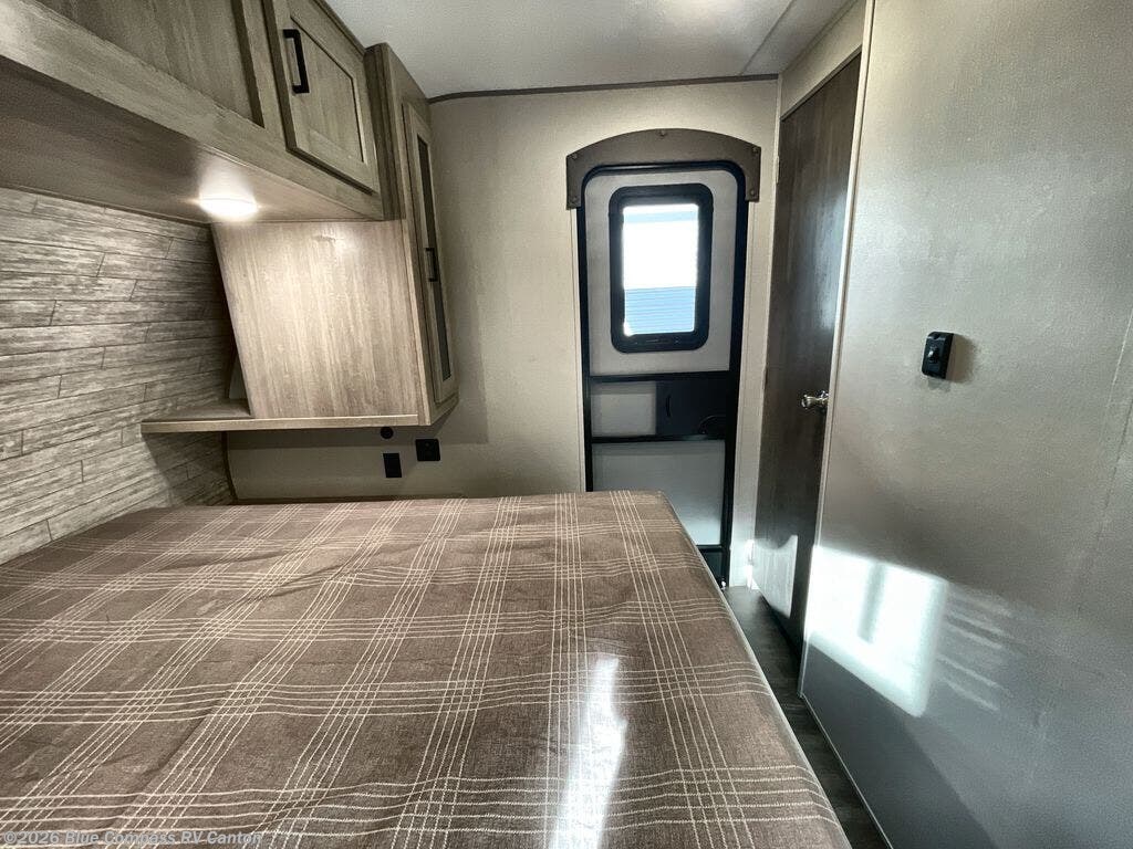 Life is easier in this travel trailer with dual entry doors! One of the entrances leads directly into the front private bedroom which has a 60" x 74" queen bed with wardrobes on either side to hang your clothes and a coat closet. The second entrance is right by the double-size bunks and rear corner bathroom that has a tub/shower with skylight above for a shower with a view when you look up. The living area has everything you need for a cozy evening indoors between the 68" sofa with an arm rest/cupholder to set your drink while you enjoy the optional fireplace at the entertainment center or you can play a few card games at the U-shaped dinette. Cook a sunrise breakfast at the outside camper kitchen with the pull out griddle, a cabinet for storage, and a refrigerator for cold orange juice!