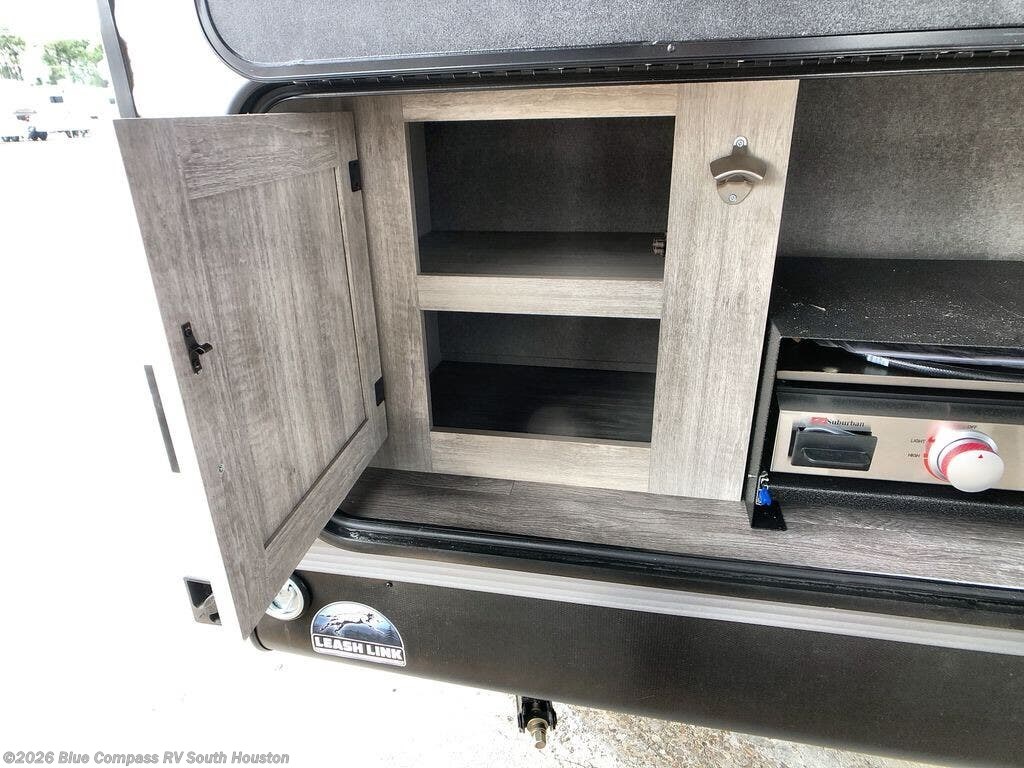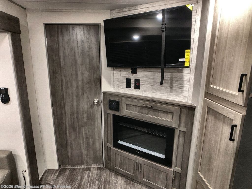 Life is easier in this travel trailer with dual entry doors! One of the entrances leads directly into the front private bedroom which has a 60" x 74" queen bed with wardrobes on either side to hang your clothes and a coat closet. The second entrance is right by the double-size bunks and rear corner bathroom that has a tub/shower with skylight above for a shower with a view when you look up. The living area has everything you need for a cozy evening indoors between the 68" sofa with an arm rest/cupholder to set your drink while you enjoy the optional fireplace at the entertainment center or you can play a few card games at the U-shaped dinette. Cook a sunrise breakfast at the outside camper kitchen with the pull out griddle, a cabinet for storage, and a refrigerator for cold orange juice!