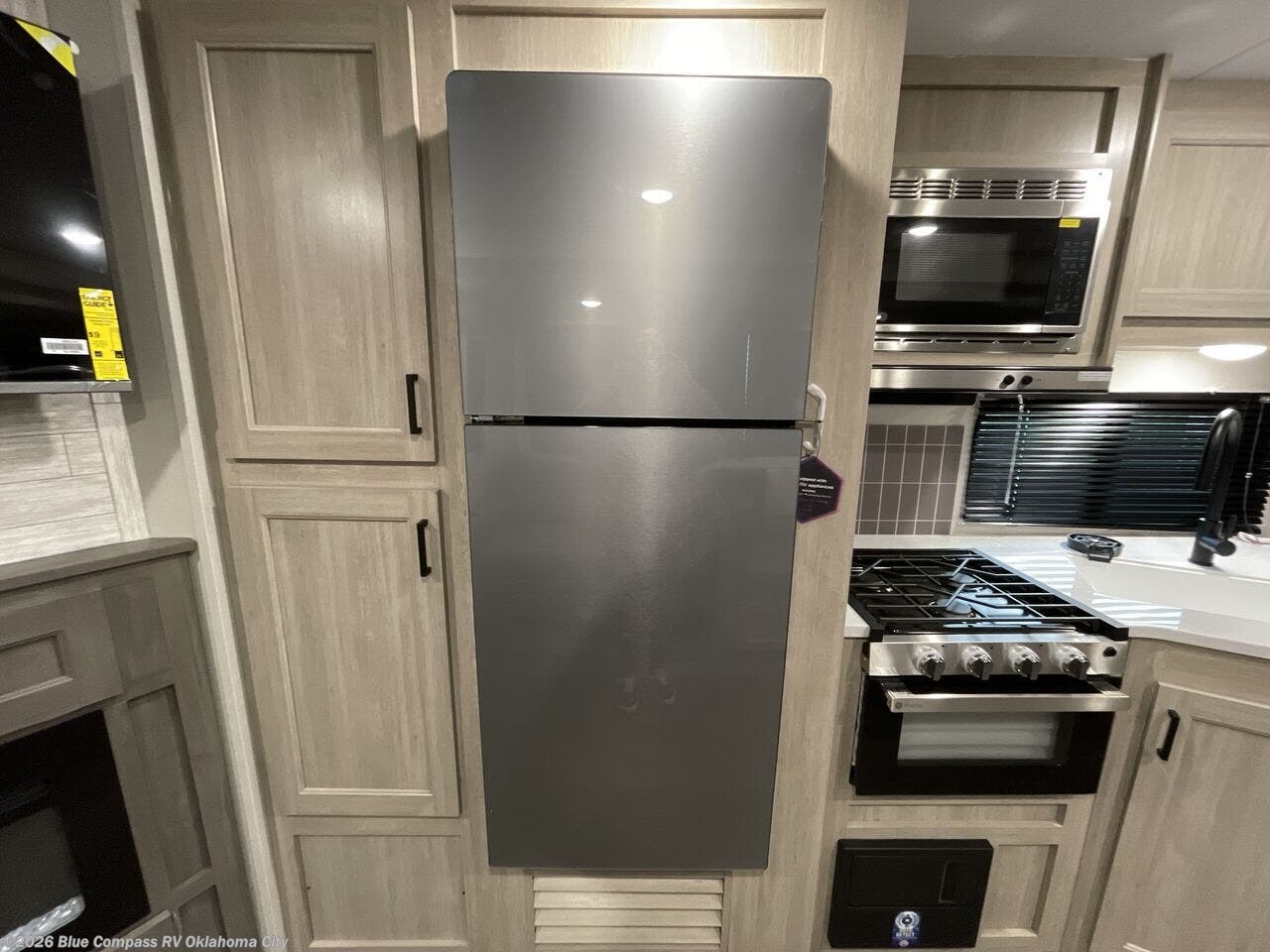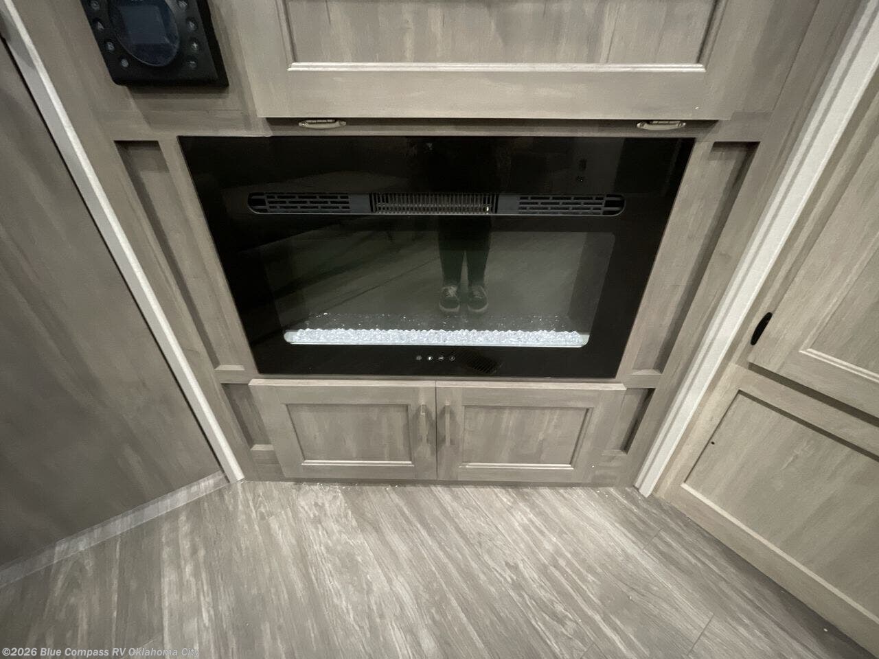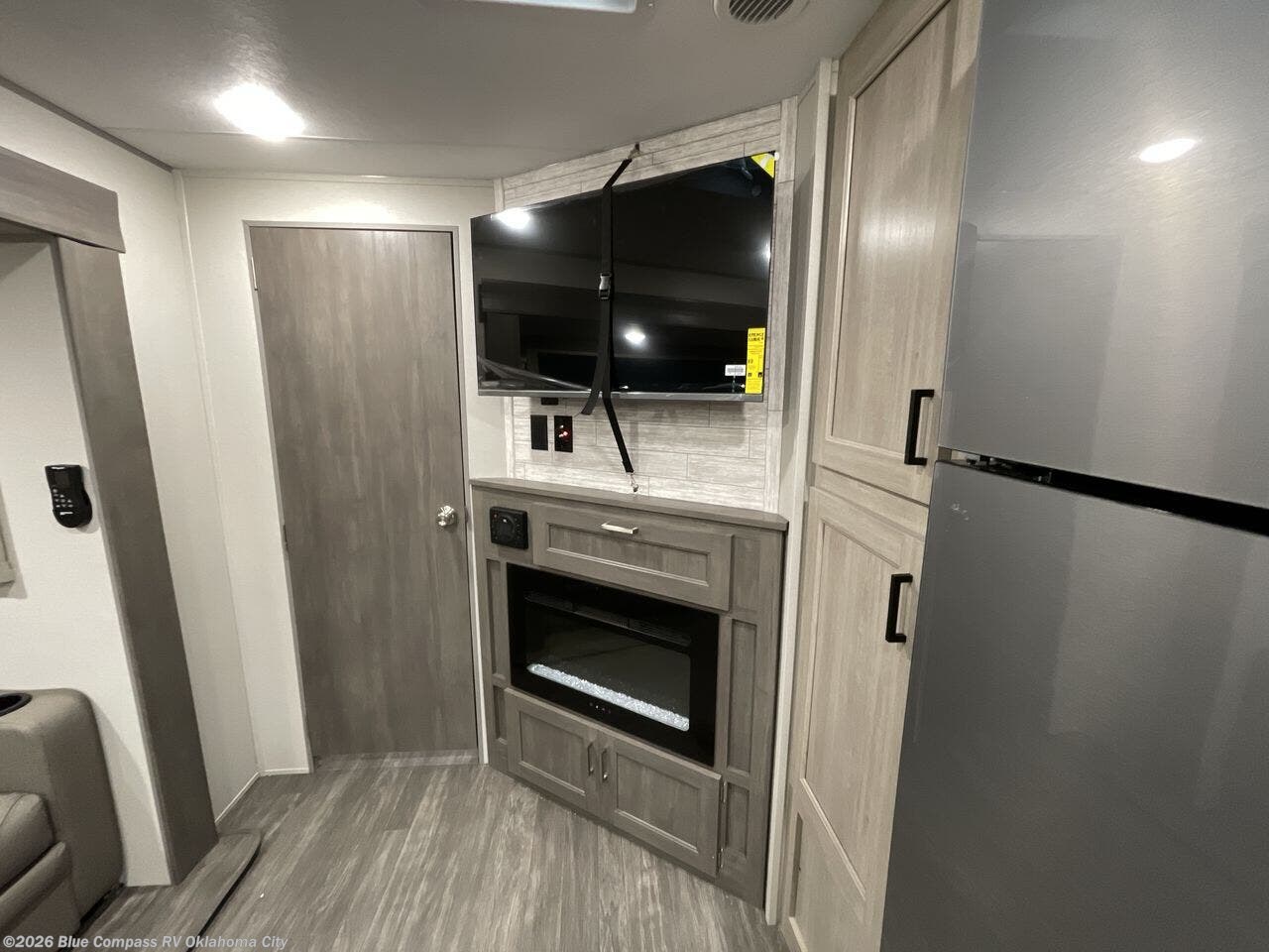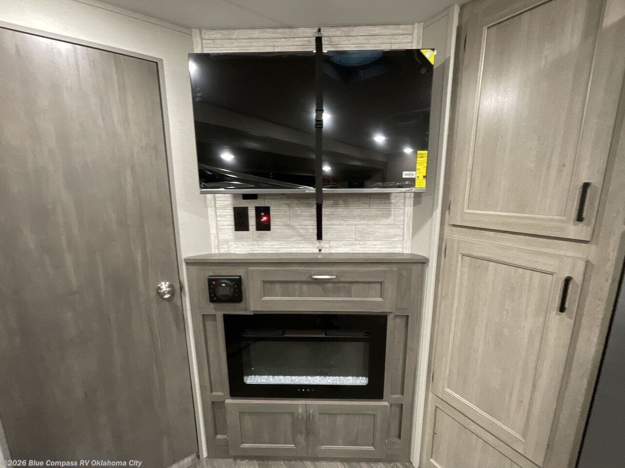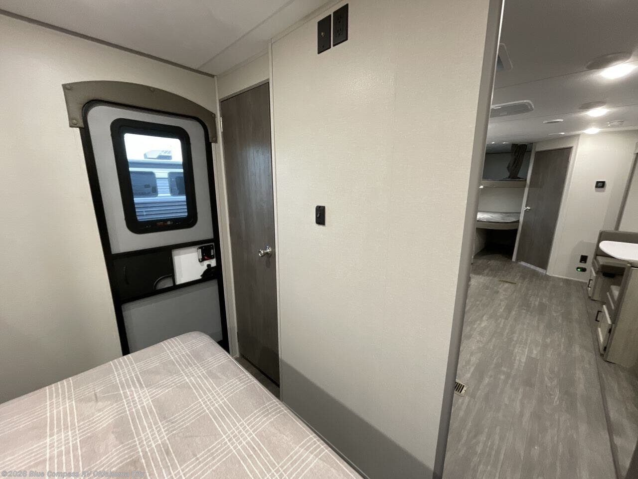 Life is easier in this travel trailer with dual entry doors! One of the entrances leads directly into the front private bedroom which has a 60" x 74" queen bed with wardrobes on either side to hang your clothes and a coat closet. The second entrance is right by the double-size bunks and rear corner bathroom that has a tub/shower with skylight above for a shower with a view when you look up. The living area has everything you need for a cozy evening indoors between the 68" sofa with an arm rest/cupholder to set your drink while you enjoy the optional fireplace at the entertainment center or you can play a few card games at the U-shaped dinette. Cook a sunrise breakfast at the outside camper kitchen with the pull out griddle, a cabinet for storage, and a refrigerator for cold orange juice!