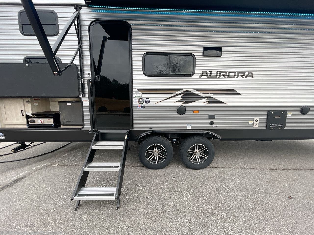 Comfortability, usability, and quality is what you will find in each one of these Forest River Aurora travel trailers, toy haulers or destination trailers! They are designed with a superior build and packed full with industry leading, functional, and distinctive standard features. SolidStep entrance steps and a Safe-T rail door assist on main entry door to help you safely enter and exit the unit. The diamond plate rock guard will protect your unit from road debris and the nitrogen filled radial tires, which keep their pressure longer, offer better fuel economy. You will also find upgraded JBL Elite exterior speakers outside, an electric awning with multicolor lights and remote, plus flush mount baggage doors for easy packing. The interiors are beautifully designed with a deep undermount farm style sink, stainless steel appliances, and linoleum flooring in the slide outs which will be easy to clean. Come find your favorite model today!