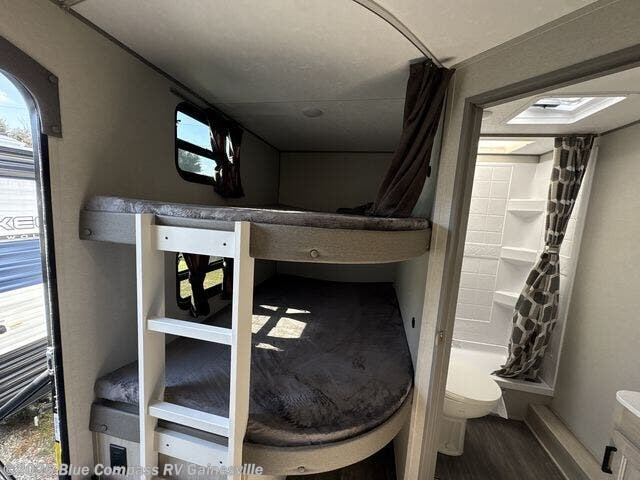 Life is easier in this travel trailer with dual entry doors! One of the entrances leads directly into the front private bedroom which has a 60" x 74" queen bed with wardrobes on either side to hang your clothes and a coat closet. The second entrance is right by the double-size bunks and rear corner bathroom that has a tub/shower with skylight above for a shower with a view when you look up. The living area has everything you need for a cozy evening indoors between the 68" sofa with an arm rest/cupholder to set your drink while you enjoy the optional fireplace at the entertainment center or you can play a few card games at the U-shaped dinette. Cook a sunrise breakfast at the outside camper kitchen with the pull out griddle, a cabinet for storage, and a refrigerator for cold orange juice!
