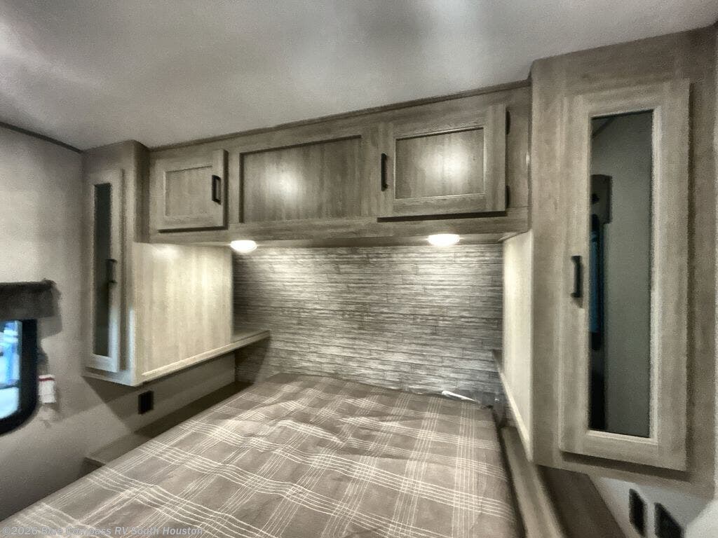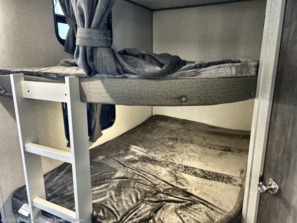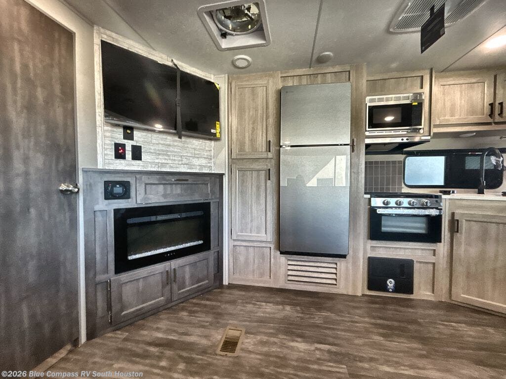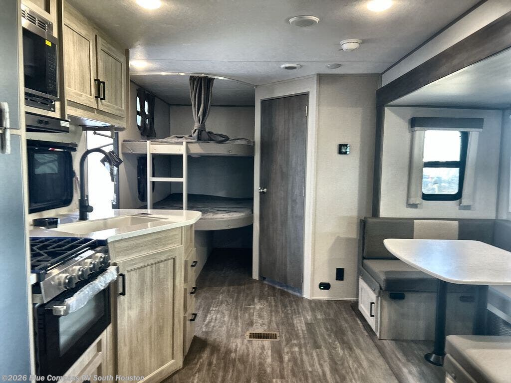 Life is easier in this travel trailer with dual entry doors! One of the entrances leads directly into the front private bedroom which has a 60" x 74" queen bed with wardrobes on either side to hang your clothes and a coat closet. The second entrance is right by the double-size bunks and rear corner bathroom that has a tub/shower with skylight above for a shower with a view when you look up. The living area has everything you need for a cozy evening indoors between the 68" sofa with an arm rest/cupholder to set your drink while you enjoy the optional fireplace at the entertainment center or you can play a few card games at the U-shaped dinette. Cook a sunrise breakfast at the outside camper kitchen with the pull out griddle, a cabinet for storage, and a refrigerator for cold orange juice!