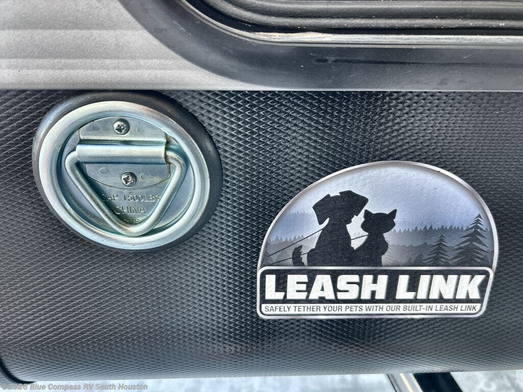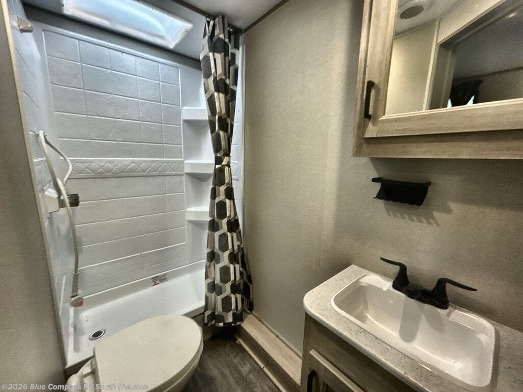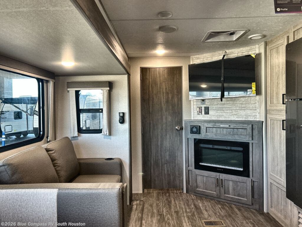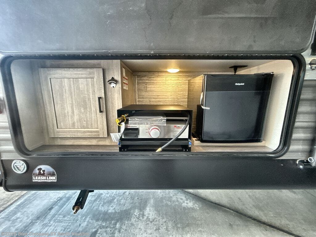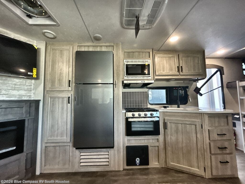 Life is easier in this travel trailer with dual entry doors! One of the entrances leads directly into the front private bedroom which has a 60" x 74" queen bed with wardrobes on either side to hang your clothes and a coat closet. The second entrance is right by the double-size bunks and rear corner bathroom that has a tub/shower with skylight above for a shower with a view when you look up. The living area has everything you need for a cozy evening indoors between the 68" sofa with an arm rest/cupholder to set your drink while you enjoy the optional fireplace at the entertainment center or you can play a few card games at the U-shaped dinette. Cook a sunrise breakfast at the outside camper kitchen with the pull out griddle, a cabinet for storage, and a refrigerator for cold orange juice!