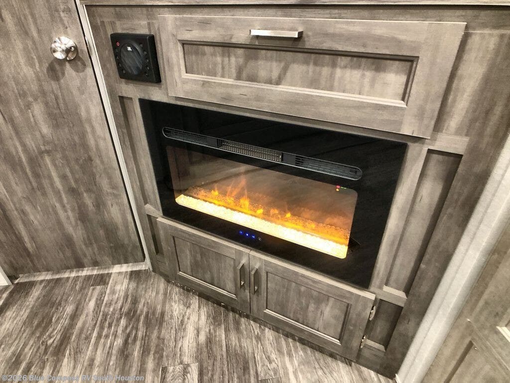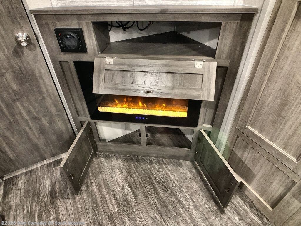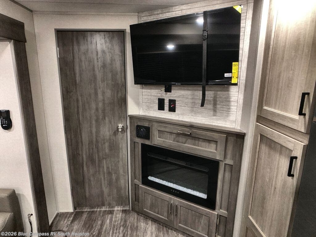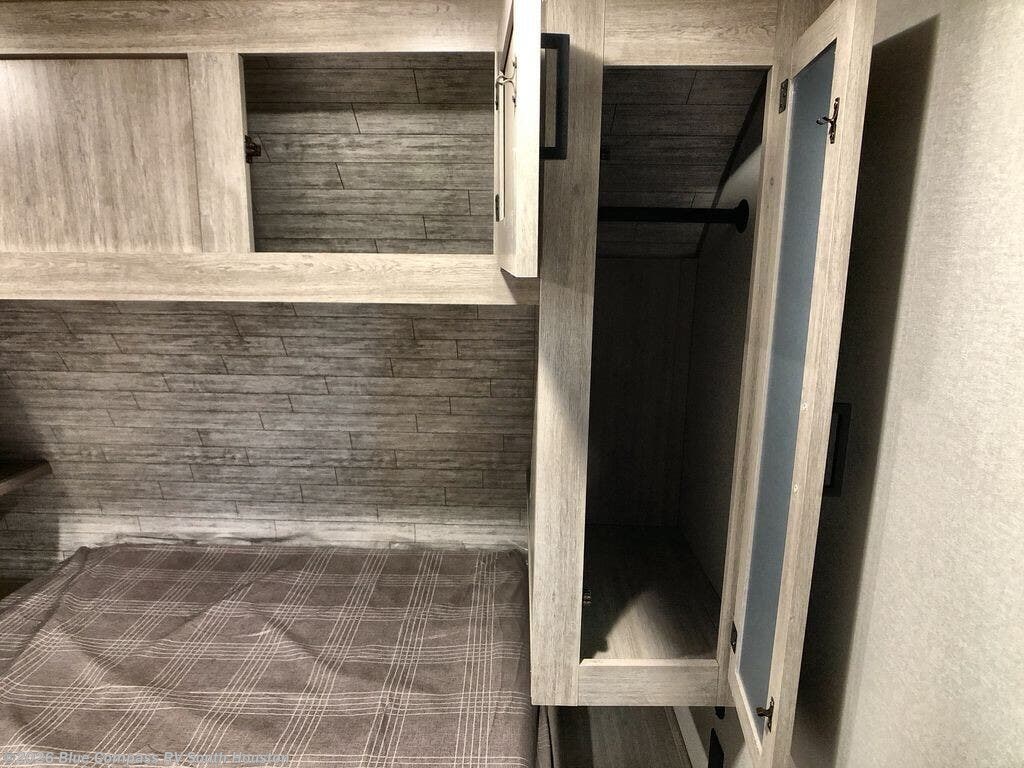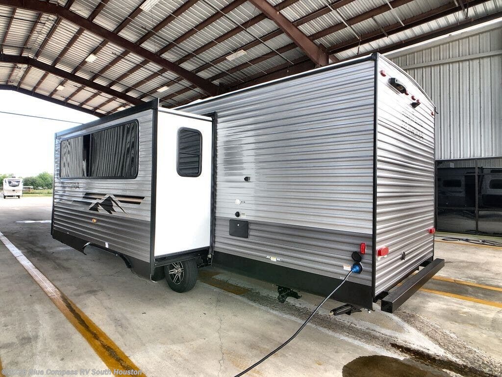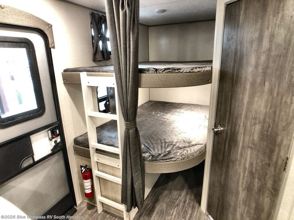Life is easier in this travel trailer with dual entry doors! One of the entrances leads directly into the front private bedroom which has a 60" x 74" queen bed with wardrobes on either side to hang your clothes and a coat closet. The second entrance is right by the double-size bunks and rear corner bathroom that has a tub/shower with skylight above for a shower with a view when you look up. The living area has everything you need for a cozy evening indoors between the 60" trundle sofa with an arm rest/cupholder to set your drink while you enjoy the optional fireplace at the entertainment center or you can play a few card games at the U-shaped dinette. Cook a sunrise breakfast at the outside camper kitchen with the pull-out griddle, a cabinet for storage, and a refrigerator for cold orange juice!