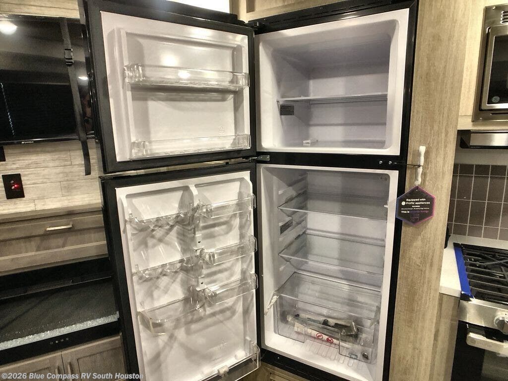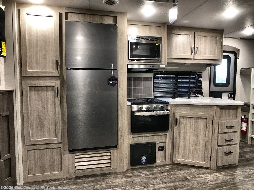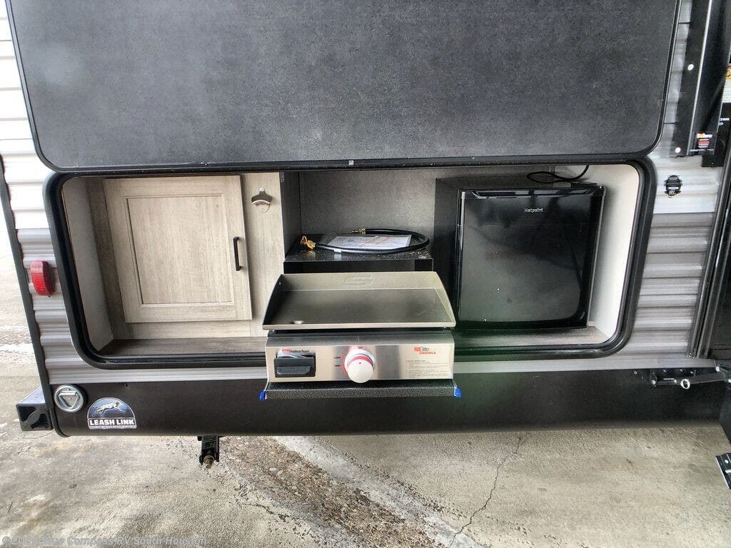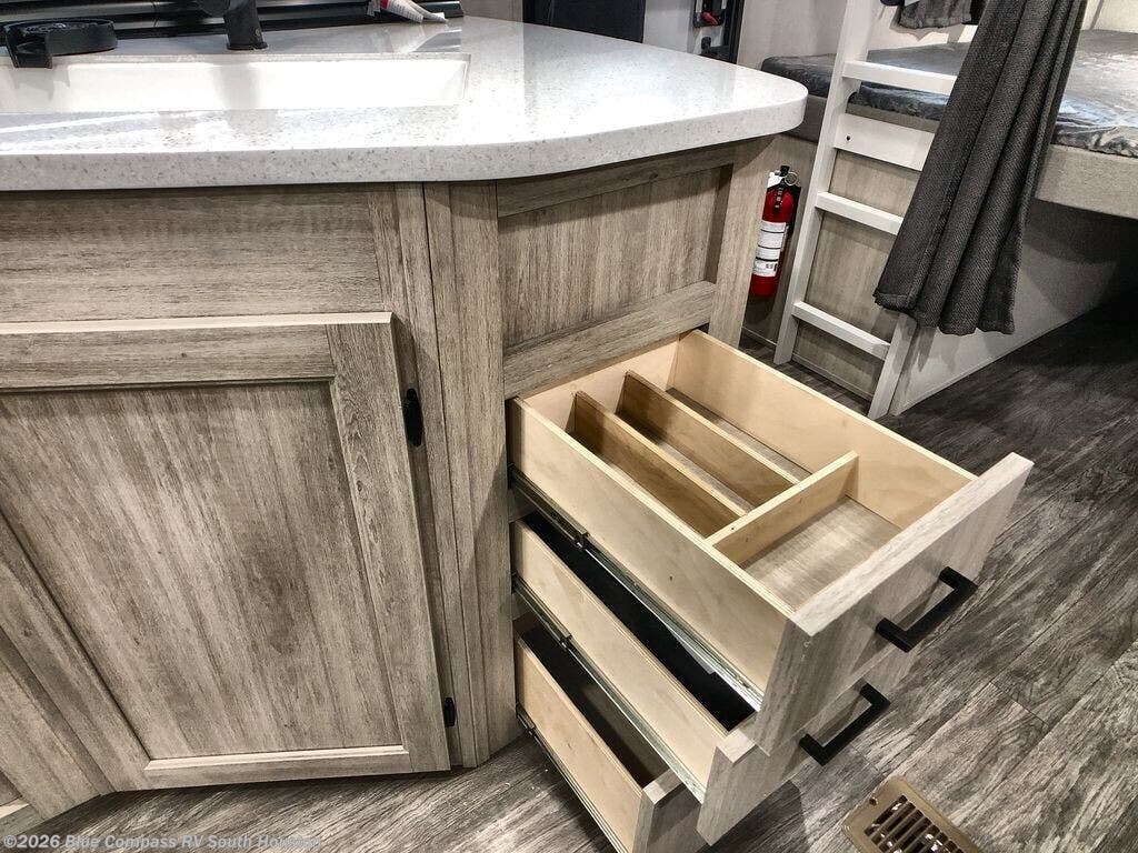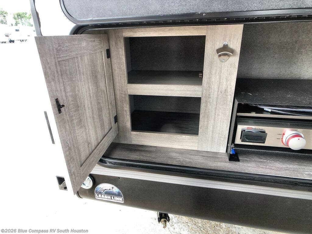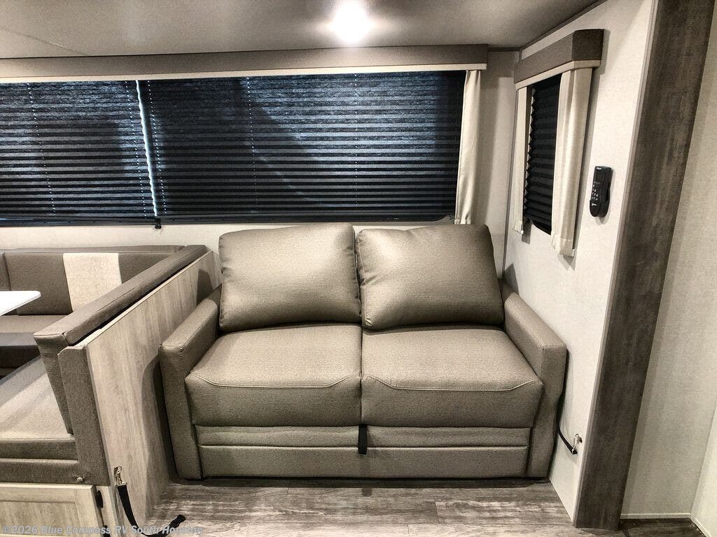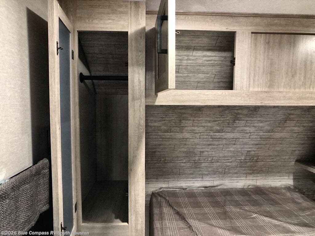 Life is easier in this travel trailer with dual entry doors! One of the entrances leads directly into the front private bedroom which has a 60" x 74" queen bed with wardrobes on either side to hang your clothes and a coat closet. The second entrance is right by the double-size bunks and rear corner bathroom that has a tub/shower with skylight above for a shower with a view when you look up. The living area has everything you need for a cozy evening indoors between the 60" trundle sofa with an arm rest/cupholder to set your drink while you enjoy the optional fireplace at the entertainment center or you can play a few card games at the U-shaped dinette. Cook a sunrise breakfast at the outside camper kitchen with the pull-out griddle, a cabinet for storage, and a refrigerator for cold orange juice!