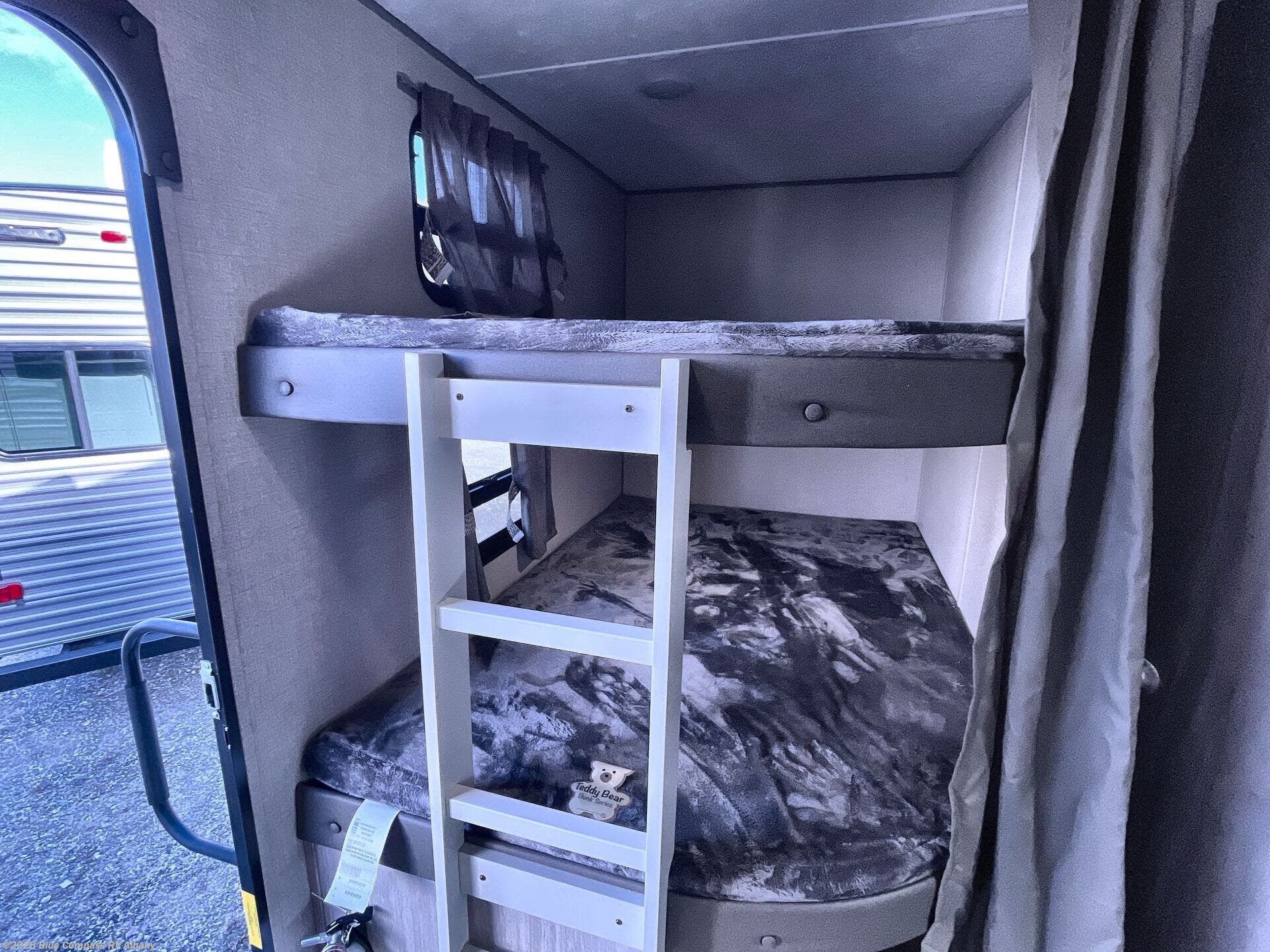 Life is easier in this travel trailer with dual entry doors! One of the entrances leads directly into the front private bedroom which has a 60" x 74" queen bed with wardrobes on either side to hang your clothes and a coat closet. The second entrance is right by the double-size bunks and rear corner bathroom that has a tub/shower with skylight above for a shower with a view when you look up. The living area has everything you need for a cozy evening indoors between the 60" trundle sofa with an arm rest/cupholder to set your drink while you enjoy the optional fireplace at the entertainment center or you can play a few card games at the U-shaped dinette. Cook a sunrise breakfast at the outside camper kitchen with the pull-out griddle, a cabinet for storage, and a refrigerator for cold orange juice!