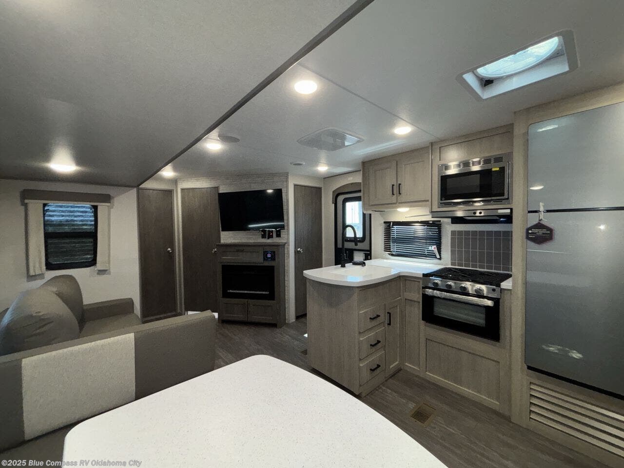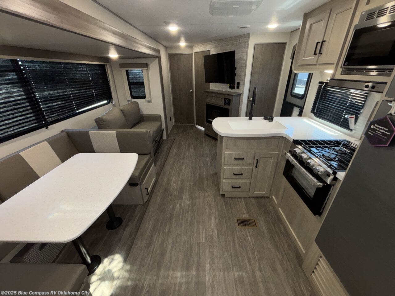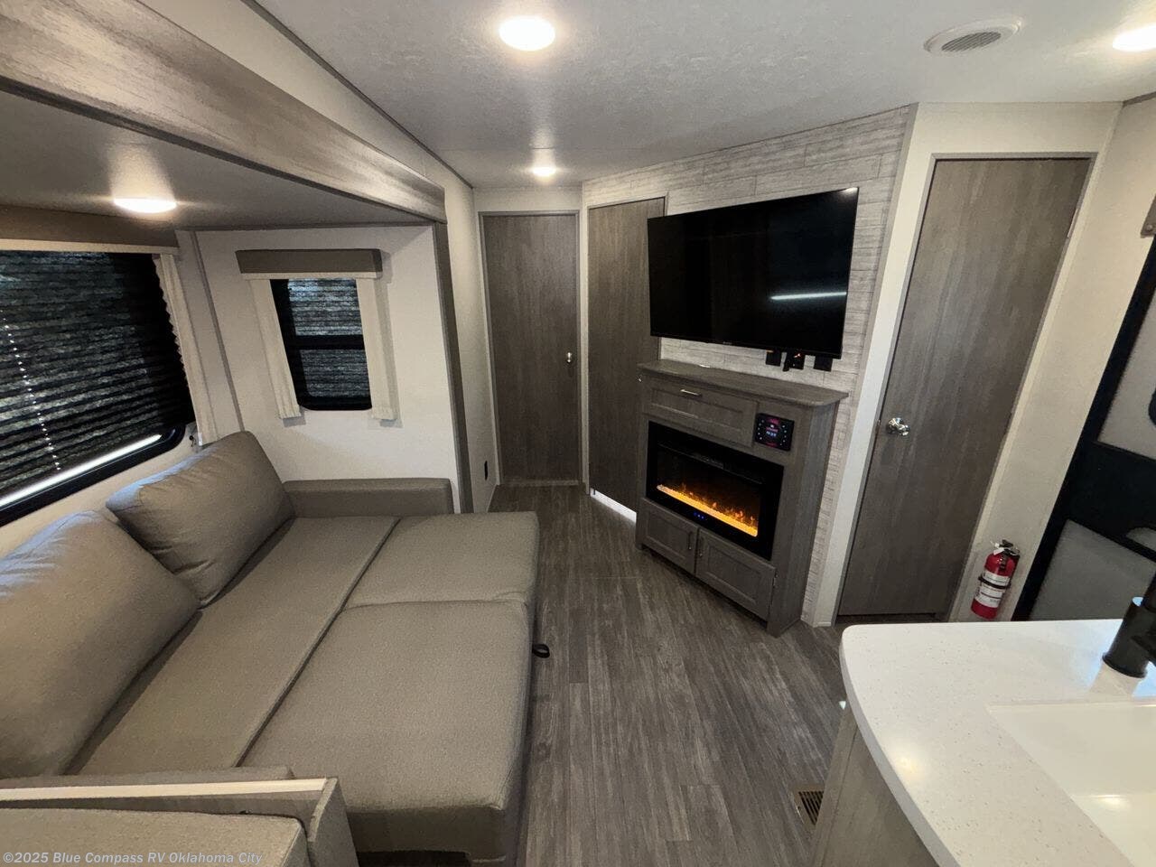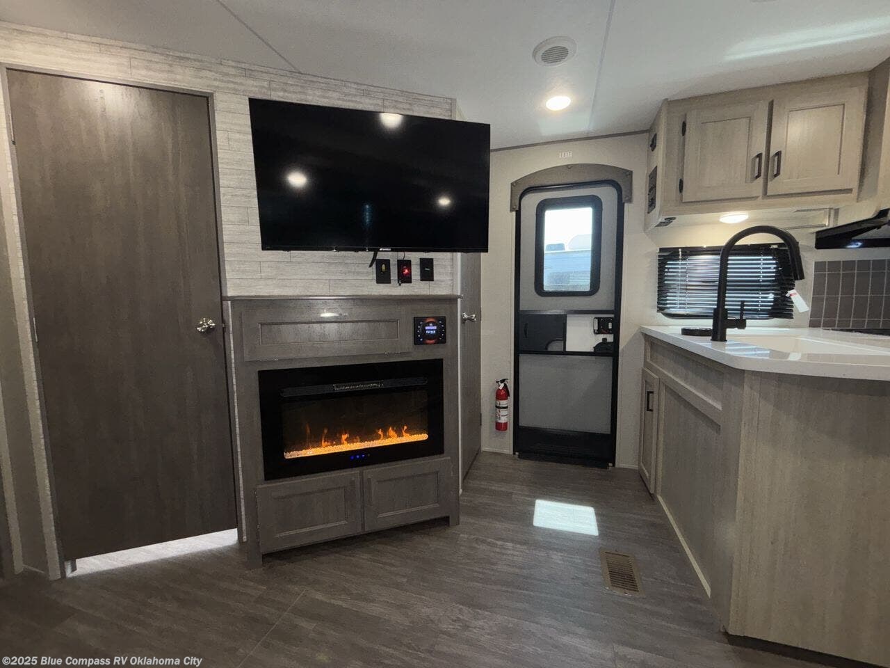 The rear private bunkhouse in this travel trailer is perfect for the kids or guests! It has a set of queen bunk beds with storage totes underneath and a linen closet. The dual entry bathroom is convenient for all to access it and has a 34" x 34" radius shower with a skylight above for natural lighting as you get ready. The chef can prepare their best meals with the three burner cooktop and everyone can enjoy them at the U-shaped dinette. The sofa is across from the entertainment center with an optional fireplace to add for extra comfort. The front private bedroom has a 60" x 74" queen bed to lay your head on at night and wardrobes on either side of it to keep your clothes out of the way and looking their best, plus an entrance into the dual entry bathroom!