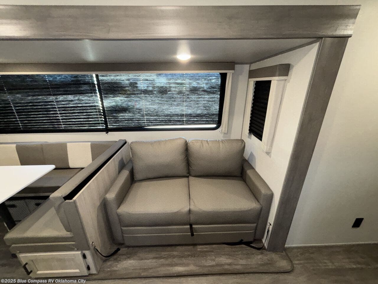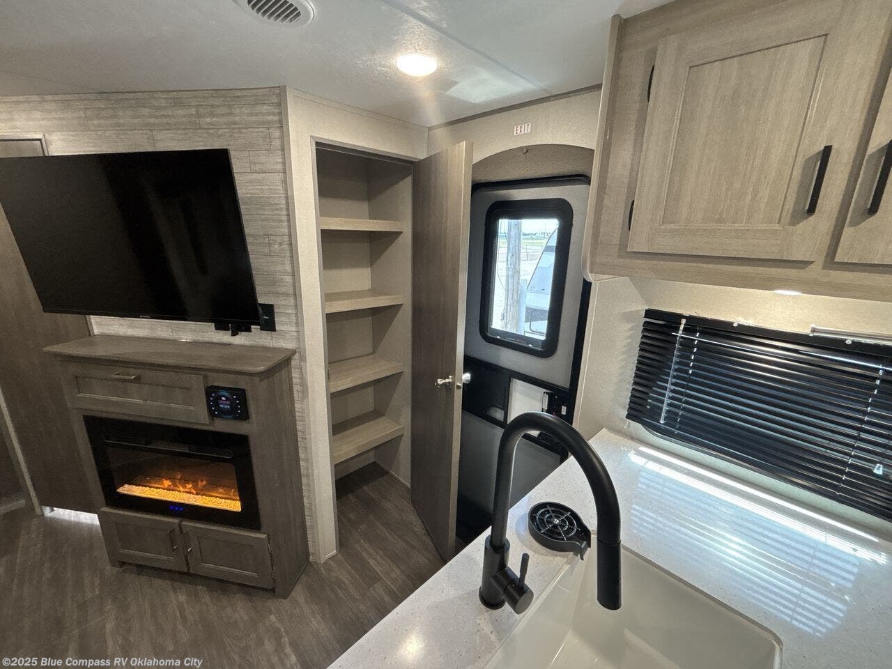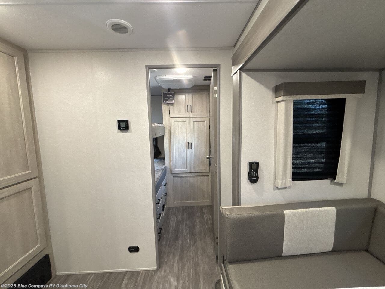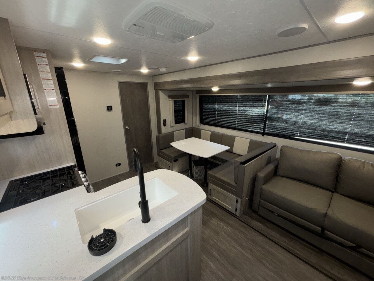 The rear private bunkhouse in this travel trailer is perfect for the kids or guests! It has a set of queen bunk beds with storage totes underneath and a linen closet. The dual entry bathroom is convenient for all to access it and has a 34" x 34" radius shower with a skylight above for natural lighting as you get ready. The chef can prepare their best meals with the three burner cooktop and everyone can enjoy them at the U-shaped dinette. The sofa is across from the entertainment center with an optional fireplace to add for extra comfort. The front private bedroom has a 60" x 74" queen bed to lay your head on at night and wardrobes on either side of it to keep your clothes out of the way and looking their best, plus an entrance into the dual entry bathroom!