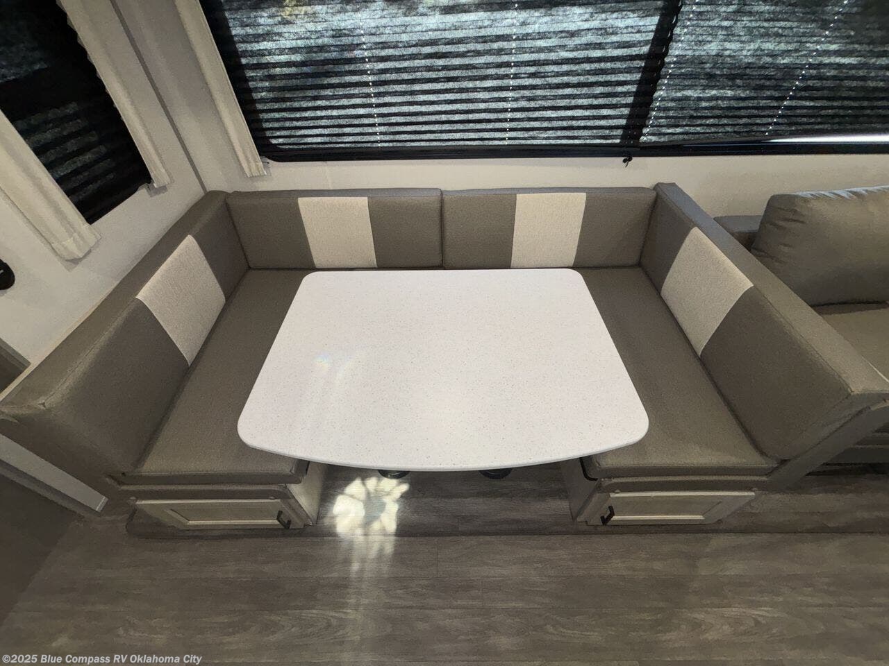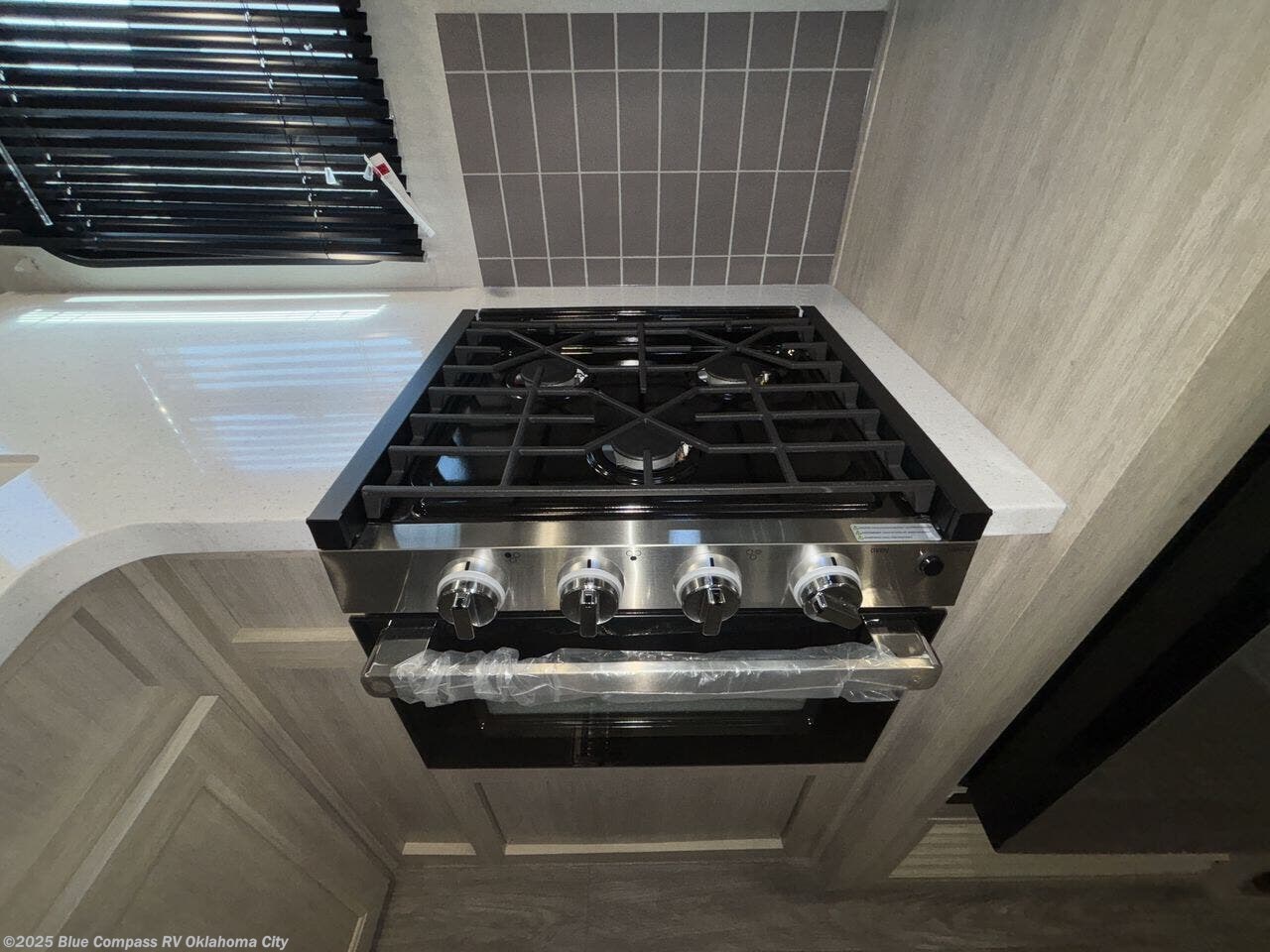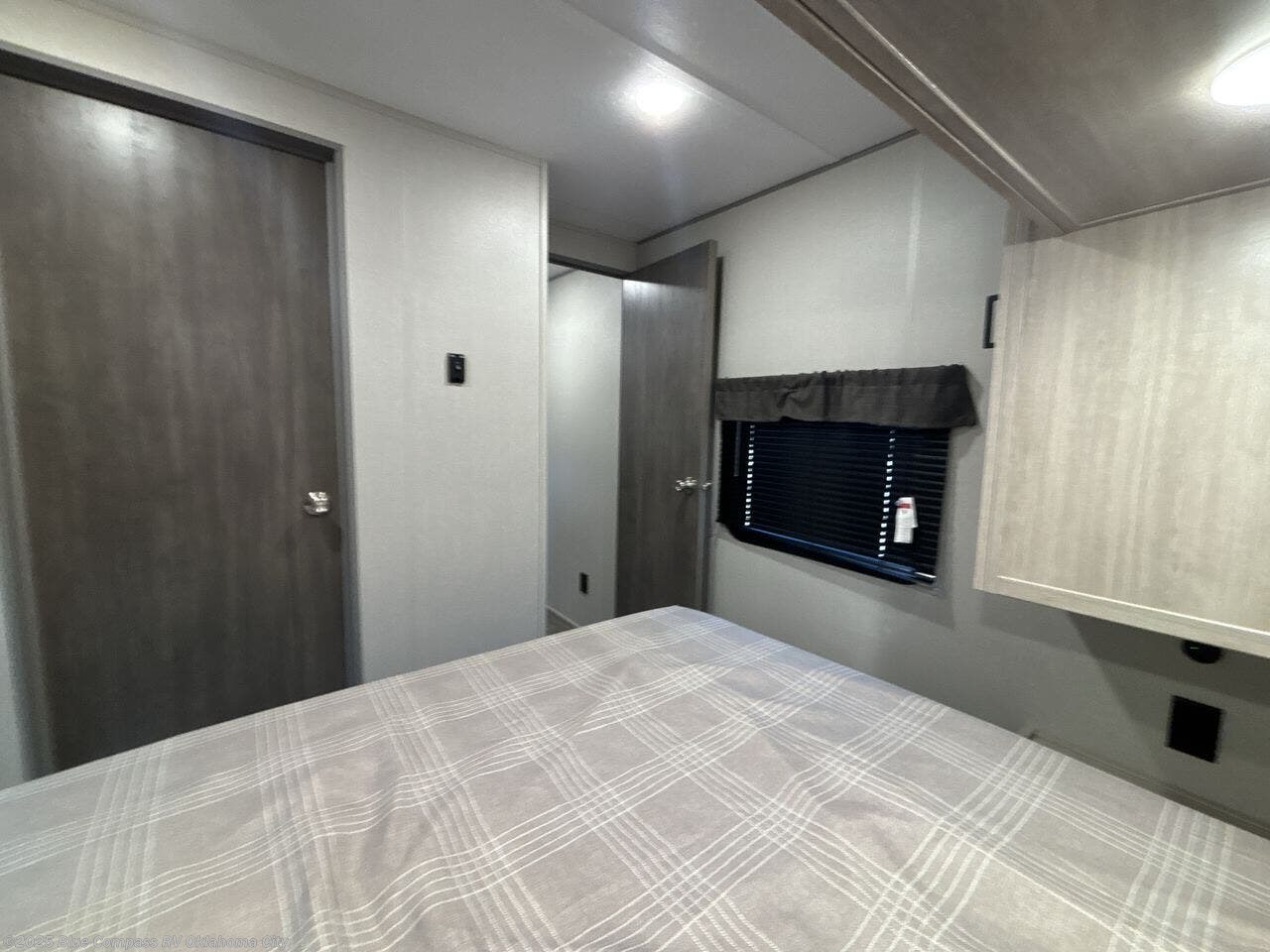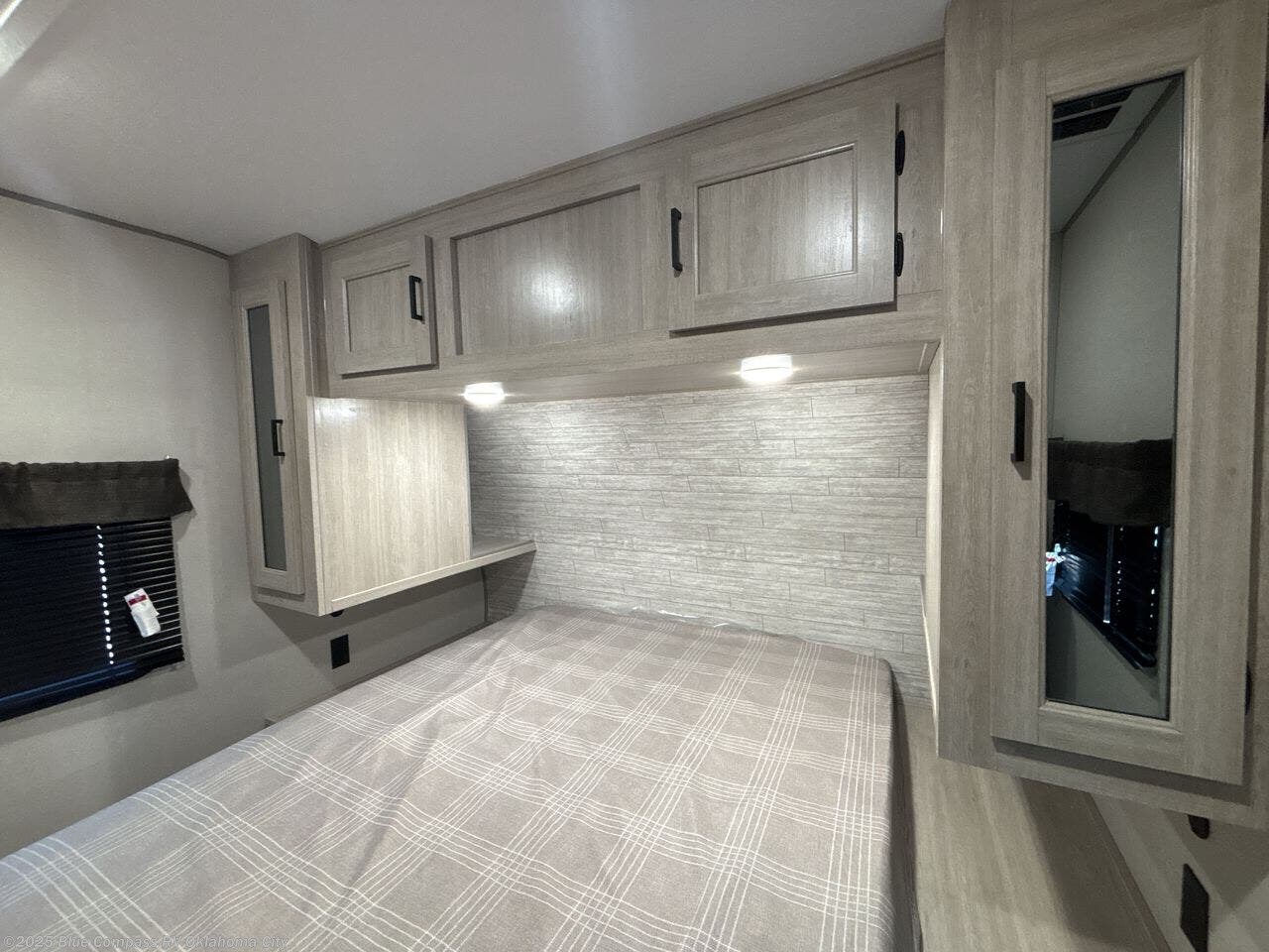 The rear private bunkhouse in this travel trailer is perfect for the kids or guests! It has a set of queen bunk beds with storage totes underneath and a linen closet. The dual entry bathroom is convenient for all to access it and has a 34" x 34" radius shower with a skylight above for natural lighting as you get ready. The chef can prepare their best meals with the three burner cooktop and everyone can enjoy them at the U-shaped dinette. The sofa is across from the entertainment center with an optional fireplace to add for extra comfort. The front private bedroom has a 60" x 74" queen bed to lay your head on at night and wardrobes on either side of it to keep your clothes out of the way and looking their best, plus an entrance into the dual entry bathroom!