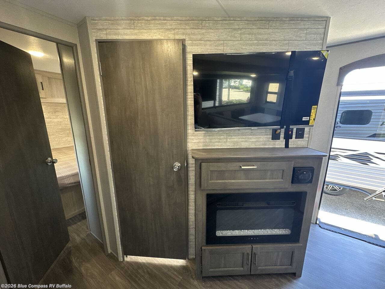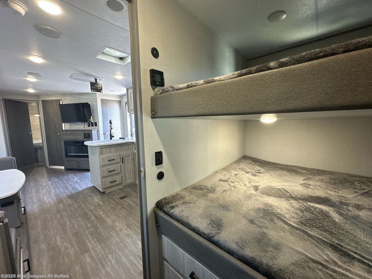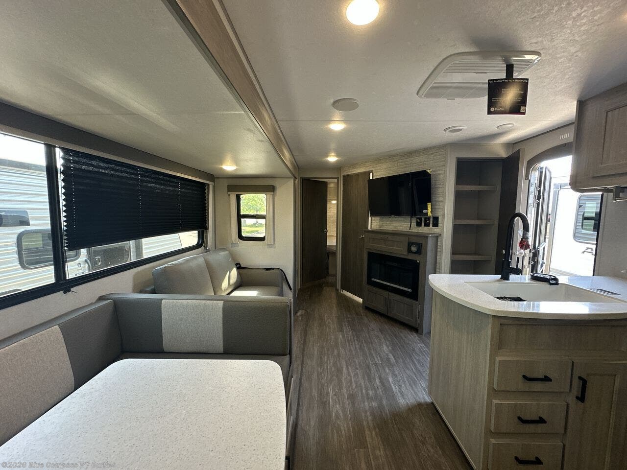 The rear private bunkhouse in this travel trailer is perfect for the kids or guests! It has a set of queen bunk beds with storage totes underneath and a linen closet. The dual entry bathroom is convenient for all to access it and has a 34" x 34" radius shower with a skylight above for natural lighting as you get ready. The chef can prepare their best meals with the three burner cooktop and everyone can enjoy them at the U-shaped dinette. The sofa is across from the entertainment center with an optional fireplace to add for extra comfort. The front private bedroom has a 60" x 74" queen bed to lay your head on at night and wardrobes on either side of it to keep your clothes out of the way and looking their best, plus an entrance into the dual entry bathroom!