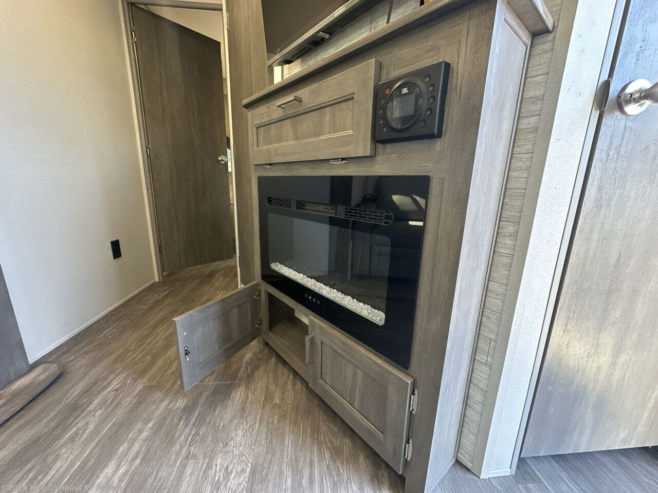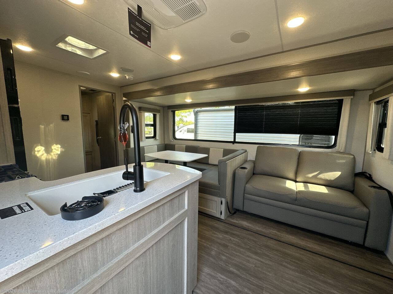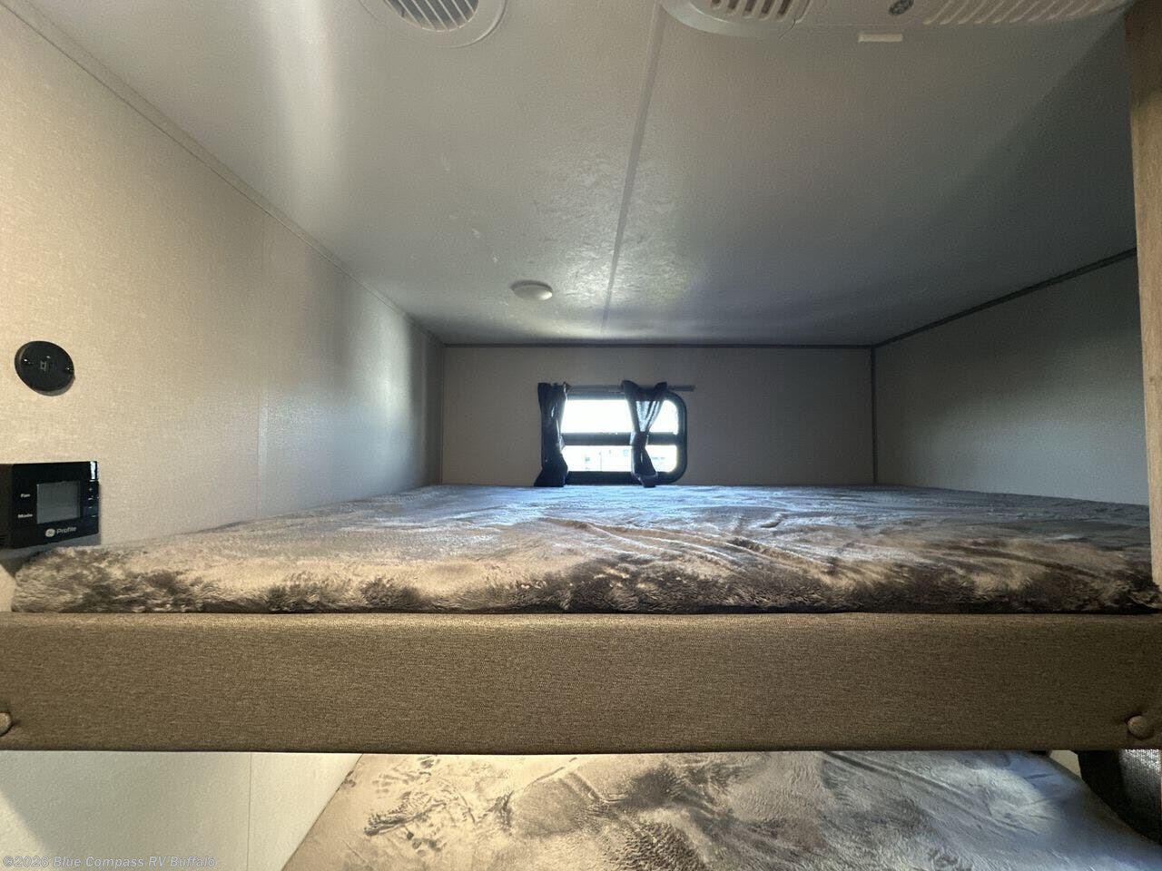 The rear private bunkhouse in this travel trailer is perfect for the kids or guests! It has a set of queen bunk beds with storage totes underneath and a linen closet. The dual entry bathroom is convenient for all to access it and has a 34" x 34" radius shower with a skylight above for natural lighting as you get ready. The chef can prepare their best meals with the three burner cooktop and everyone can enjoy them at the U-shaped dinette. The sofa is across from the entertainment center with an optional fireplace to add for extra comfort. The front private bedroom has a 60" x 74" queen bed to lay your head on at night and wardrobes on either side of it to keep your clothes out of the way and looking their best, plus an entrance into the dual entry bathroom!