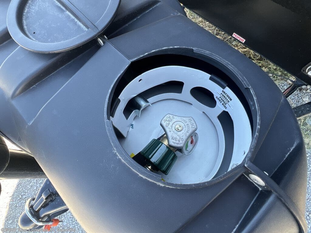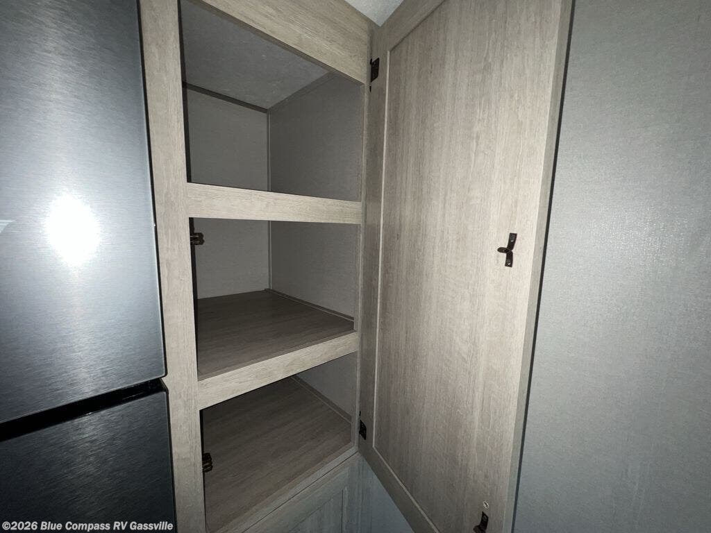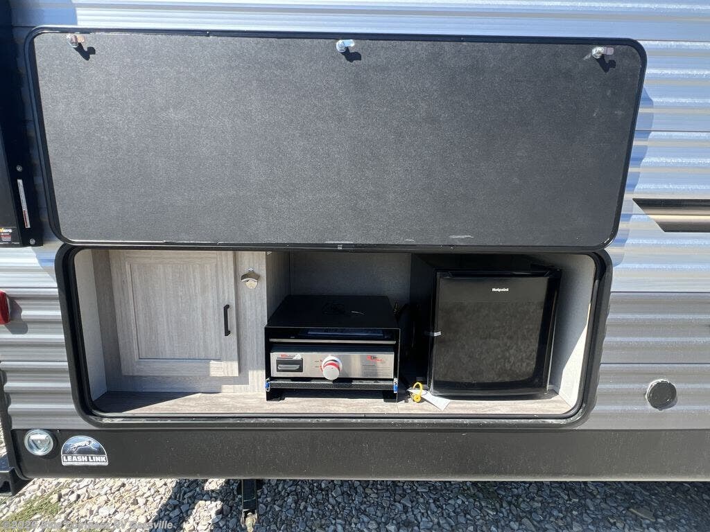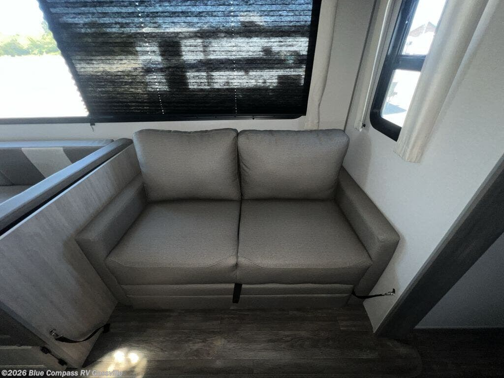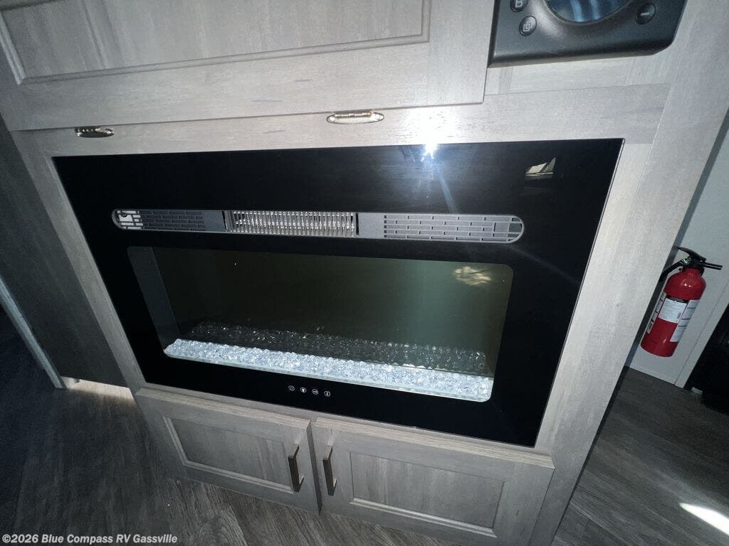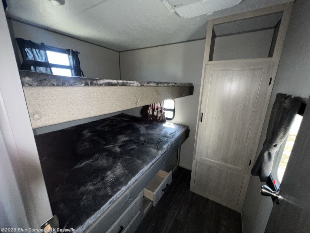 The rear private bunkhouse in this travel trailer is perfect for the kids or guests! It has a set of queen bunk beds with storage totes underneath and a linen closet. The dual entry bathroom is convenient for all to access it and has a 34" x 34" radius shower with a skylight above for natural lighting as you get ready. The chef can prepare their best meals with the three burner cooktop and everyone can enjoy them at the U-shaped dinette. The sofa is across from the entertainment center with an optional fireplace to add for extra comfort. The front private bedroom has a 60" x 74" queen bed to lay your head on at night and wardrobes on either side of it to keep your clothes out of the way and looking their best, plus an entrance into the dual entry bathroom!