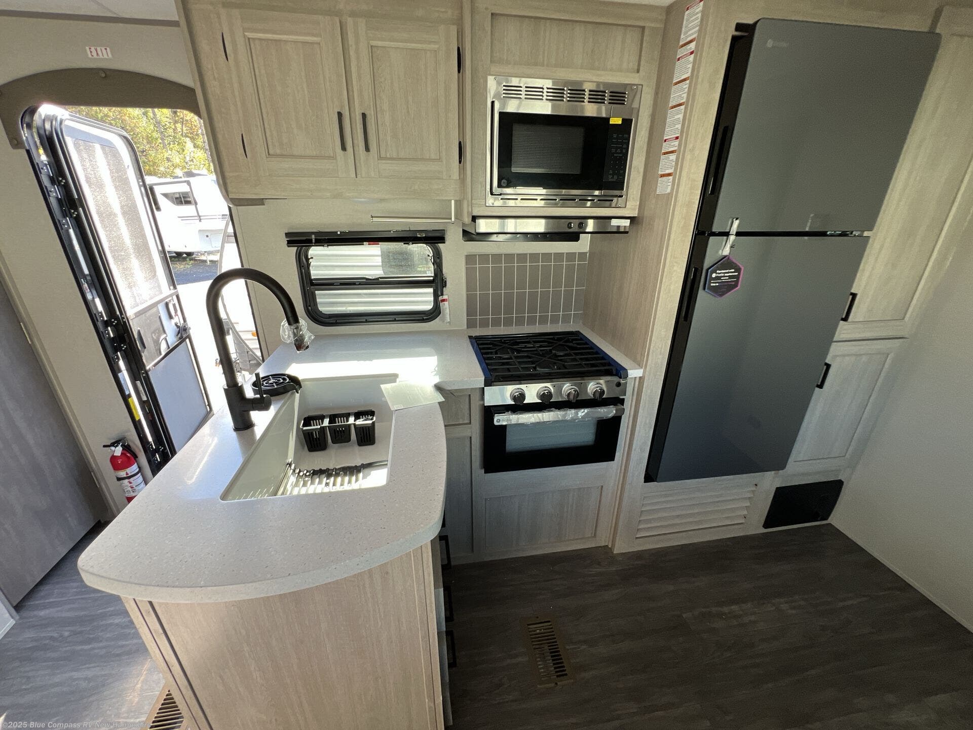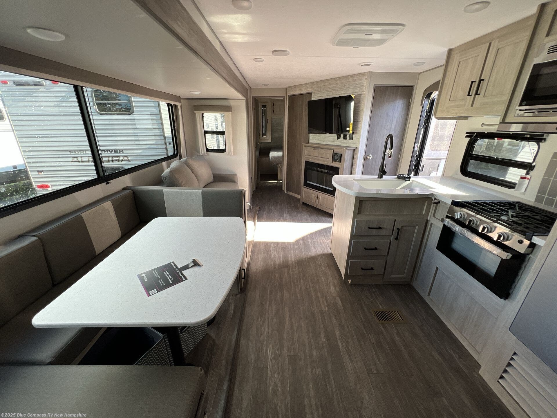 The rear private bunkhouse in this travel trailer is perfect for the kids or guests! It has a set of queen bunk beds with storage totes underneath and a linen closet. The dual entry bathroom is convenient for all to access it and has a 34" x 34" radius shower with a skylight above for natural lighting as you get ready. The chef can prepare their best meals with the three burner cooktop and everyone can enjoy them at the U-shaped dinette. The sofa is across from the entertainment center with an optional fireplace to add for extra comfort. The front private bedroom has a 60" x 74" queen bed to lay your head on at night and wardrobes on either side of it to keep your clothes out of the way and looking their best, plus an entrance into the dual entry bathroom!